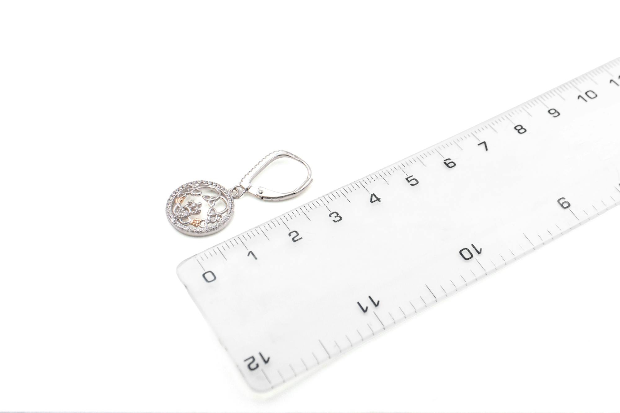 Surrounded by a halo of sparkling cubic zirconia, a delicate botanical motif features three leaved shamrocks and a Trinity Knot, combining their lovely meaning of eternal love and luck. This detailed design flows seamlessly into the hands, heart and crown of the Claddagh - a centuries old Irish symbol of love, loyalty and friendship.
