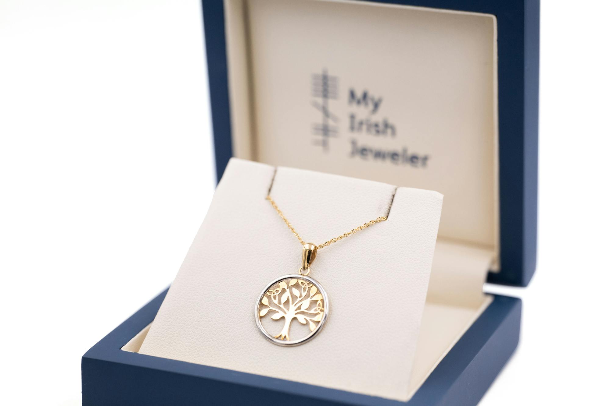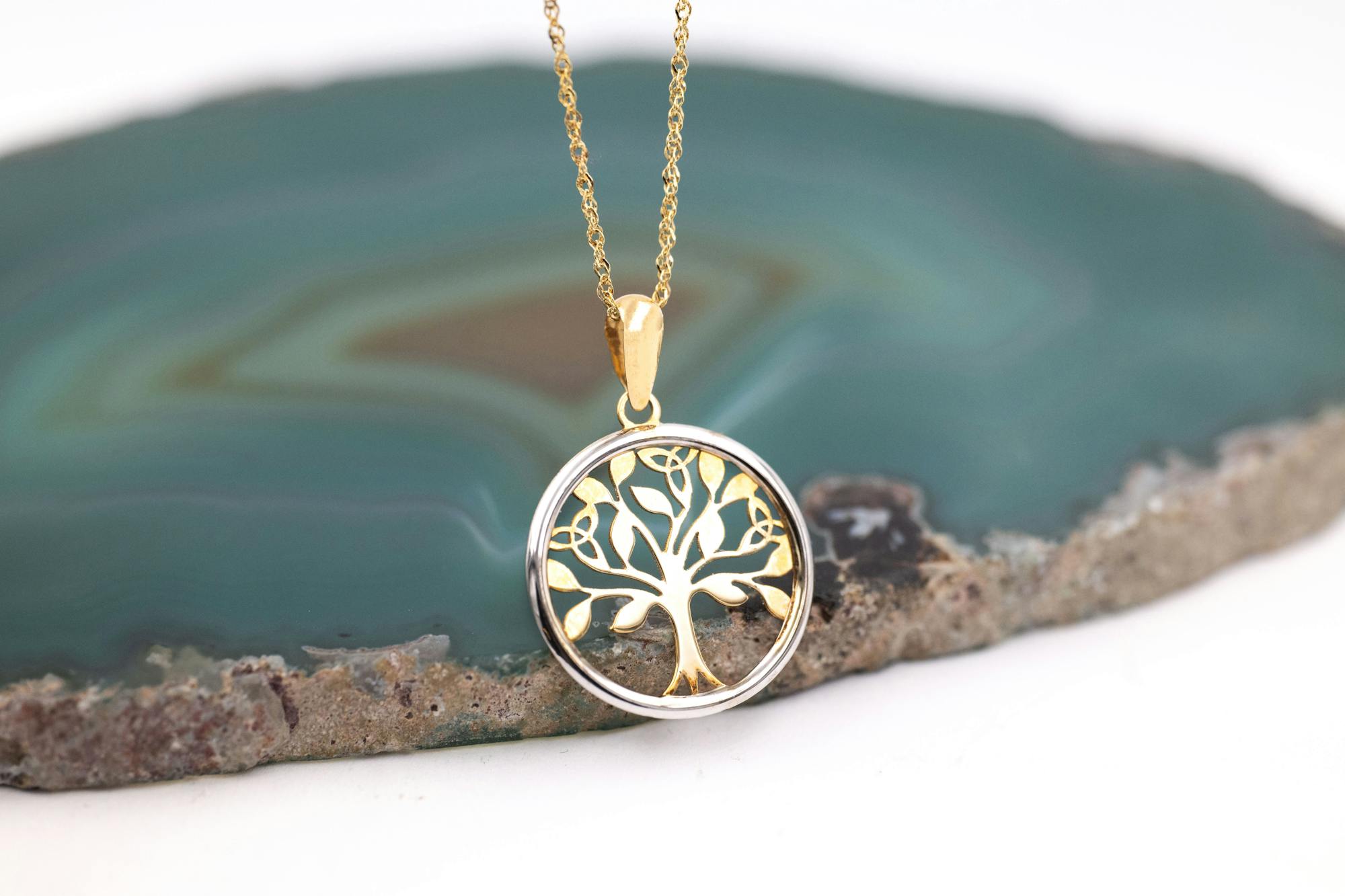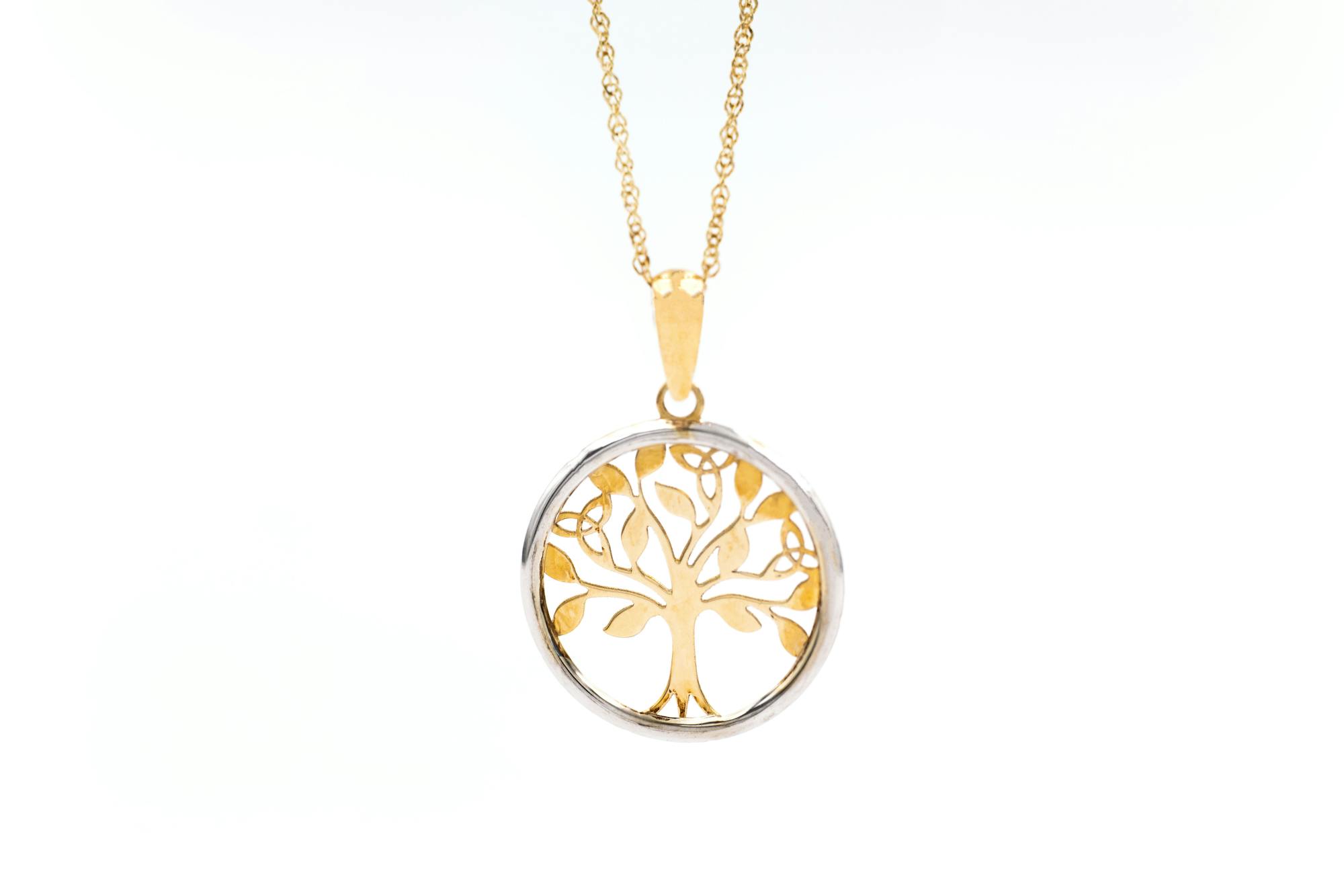 A truly magical petite necklace, carefully crafted here in Ireland in solid 10K yellow and white gold. The necklace features a silhouetted Celtic tree of life in 10K yellow gold, framed in a circle of 10K white gold.