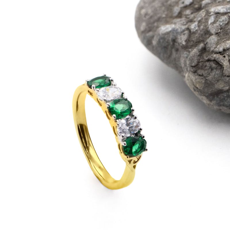 This ring is set with a high grade green cubic zirconia, an emerald substitute that looks similar but has noticeable differences to lab or natural emeralds. CZ has a different hardness and interacts with light differently compared to a lab or natural emerald.