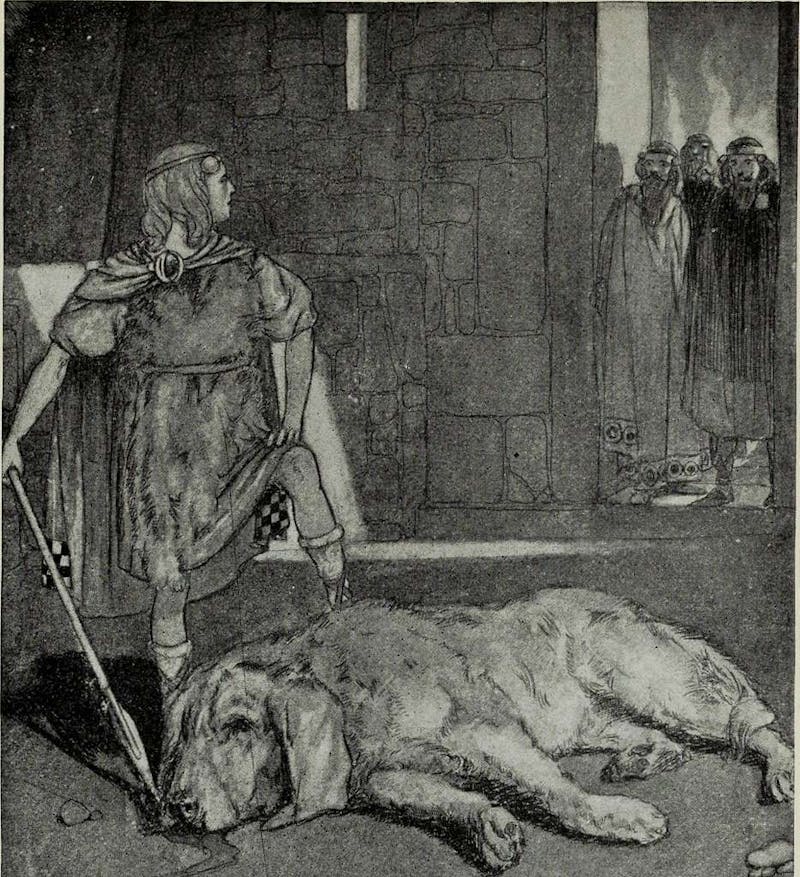 The guests, the King, and Culainn were all amazed to see Setanta not only not dead, but entirely unharmed, standing over the slain hound. Culainn was understandably distraught at the sight of his fallen dog and valuable protector. On seeing the man’s clear distress, Setanta honorably vowed to take the place of the dog, protecting Culainn’s home and the pass into Ulster, training a new guard-dog to take his place in time.
