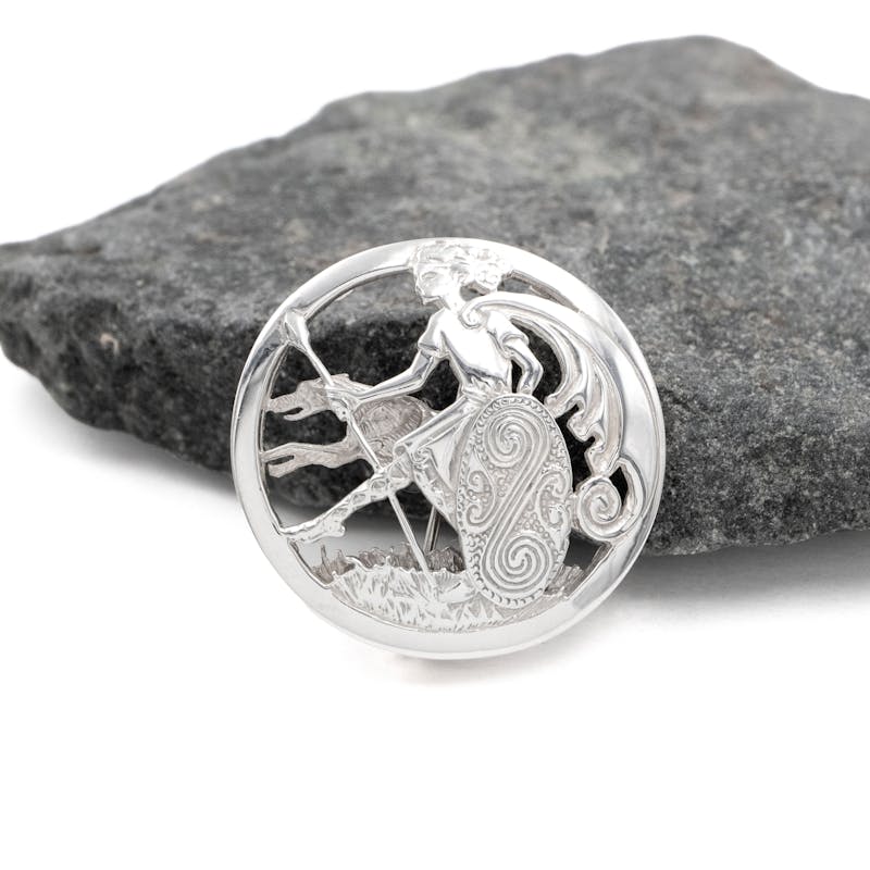 This tale of bravery and honor inspired our Cú Chulainn brooch. The circular design depicts a young Cú Chulainn, the hound of Culainn, racing along side an Irish wolfhound. Armed with a spear and shield, the expert craft captures beautiful movement, with Cú Chulainn’s cloak and hair swirling behind him as leaps. This wonderful legend makes this brooch a fitting and aspirational gift for a young person, or any fan of Irish stories.