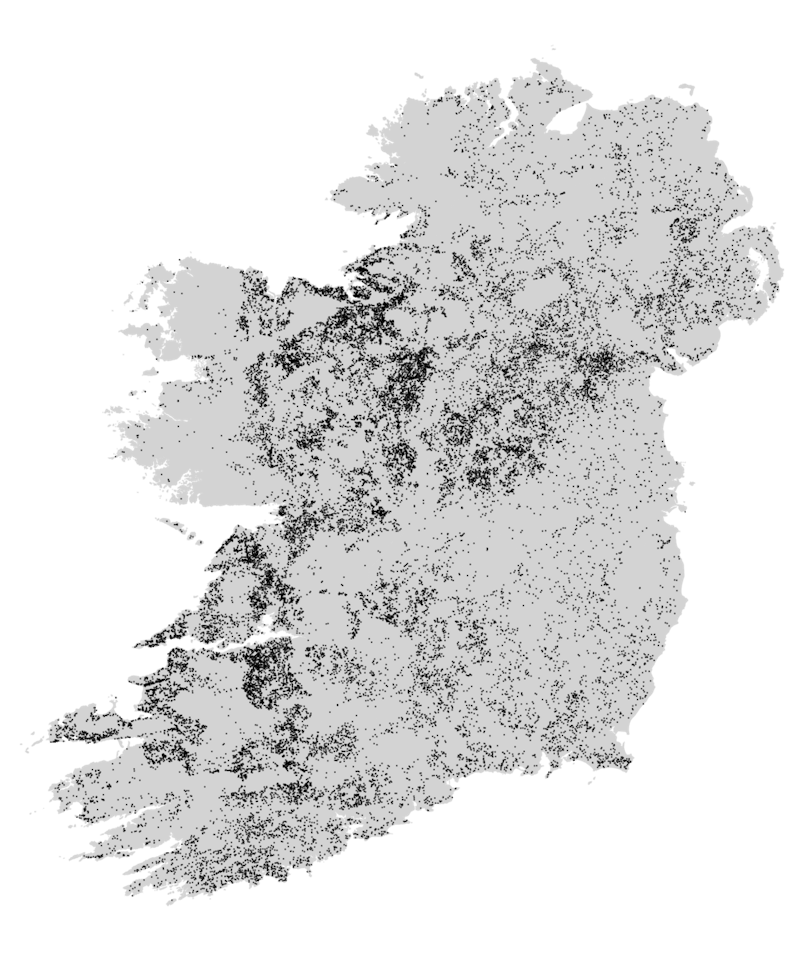 A map showing the distribution of the 40,000 or so circular forts in Ireland