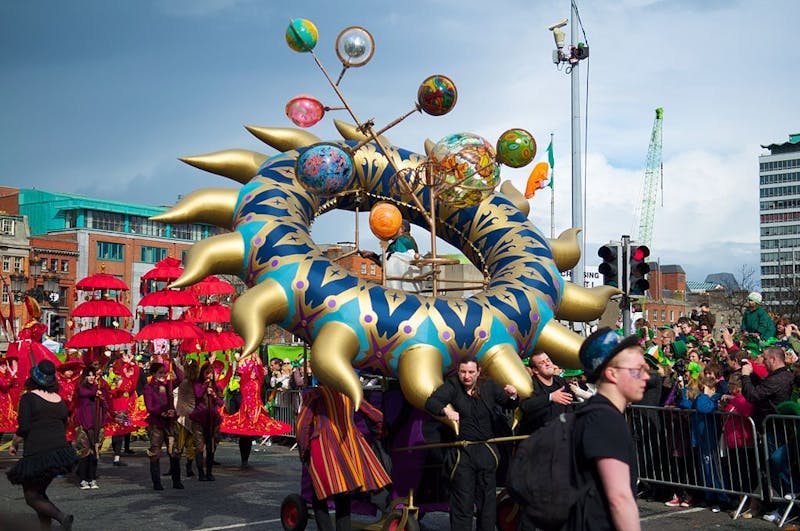 Many of the floats and costumes in St. Patrick's Day parade understandably reference the sun.