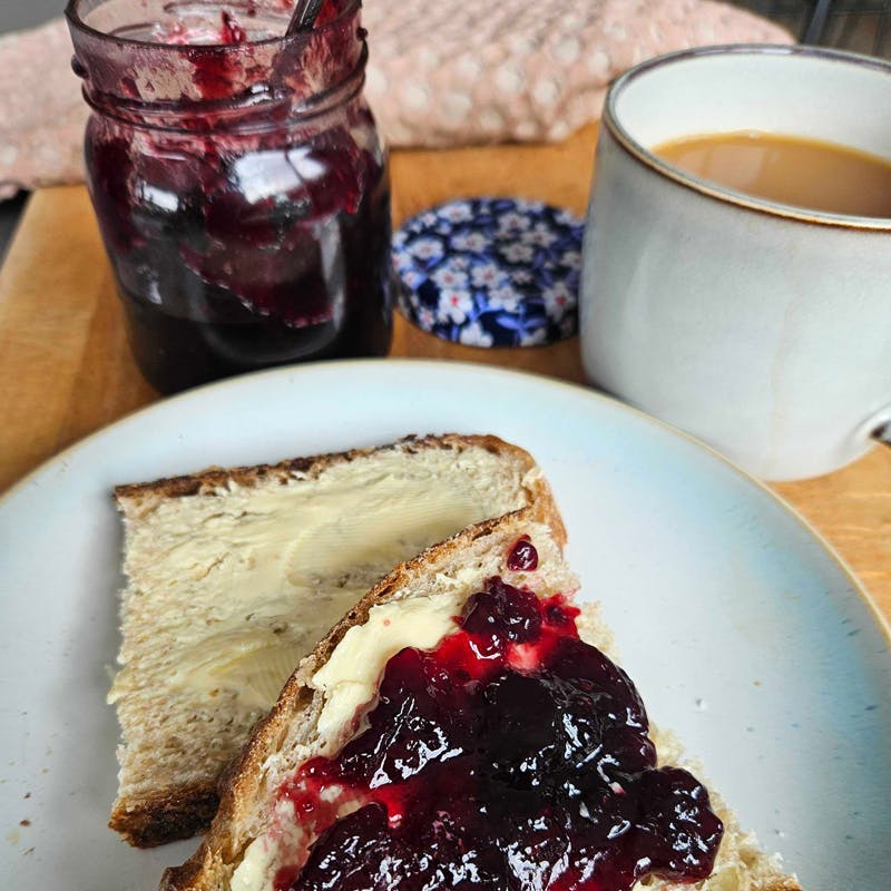 The perfect elevenses on a blustery autumn morning... bread, butter, and blackberry jam, served with tea of course!
