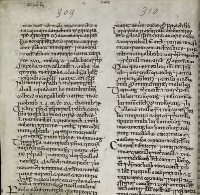 Columns 309-310 of the The Seanchus Mór, a medieval legal manuscript held at Trinity College Dublin containing a version of the Old Irish tree laws, thought to be originally composed in about the eighth century.