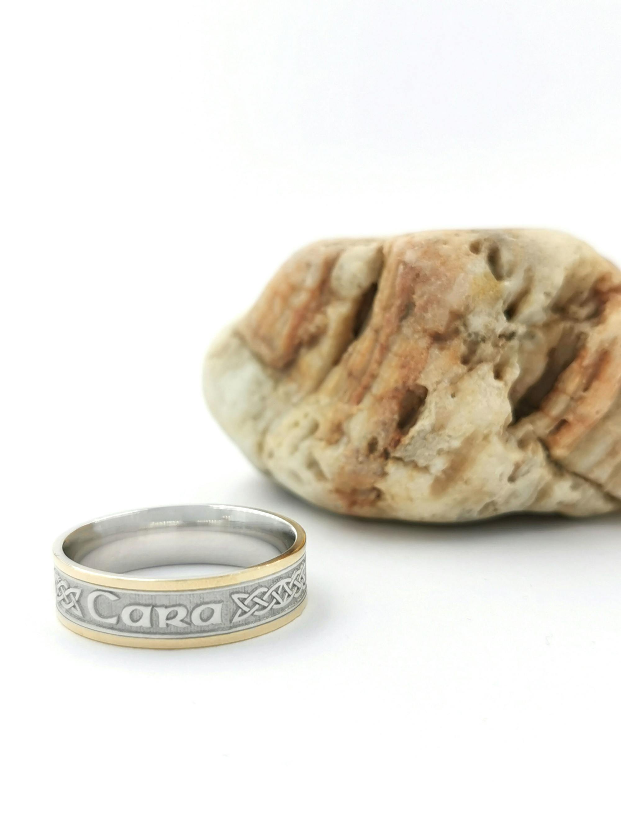 These rings feature the phrase 'Mo Anam Cara' - Gaelic for 'My Soul Mate'. In between each of the Gaelic words there is a stunning elongated celtic design, known as a lovers knot. The design sweeps around the entire ring in a seamless flow.