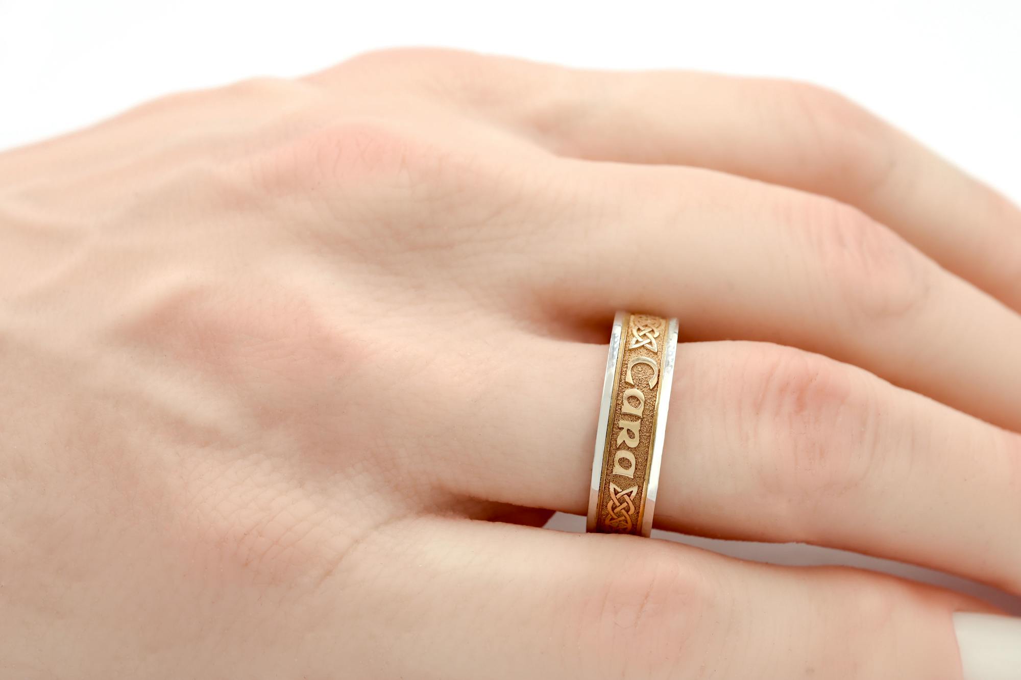 These rings feature the phrase 'Mo Anam Cara' - Gaelic for 'My Soul Mate'. In between each of the Gaelic words there is a stunning elongated celtic design, known as a lovers knot. The design sweeps around the entire ring in a seamless flow.