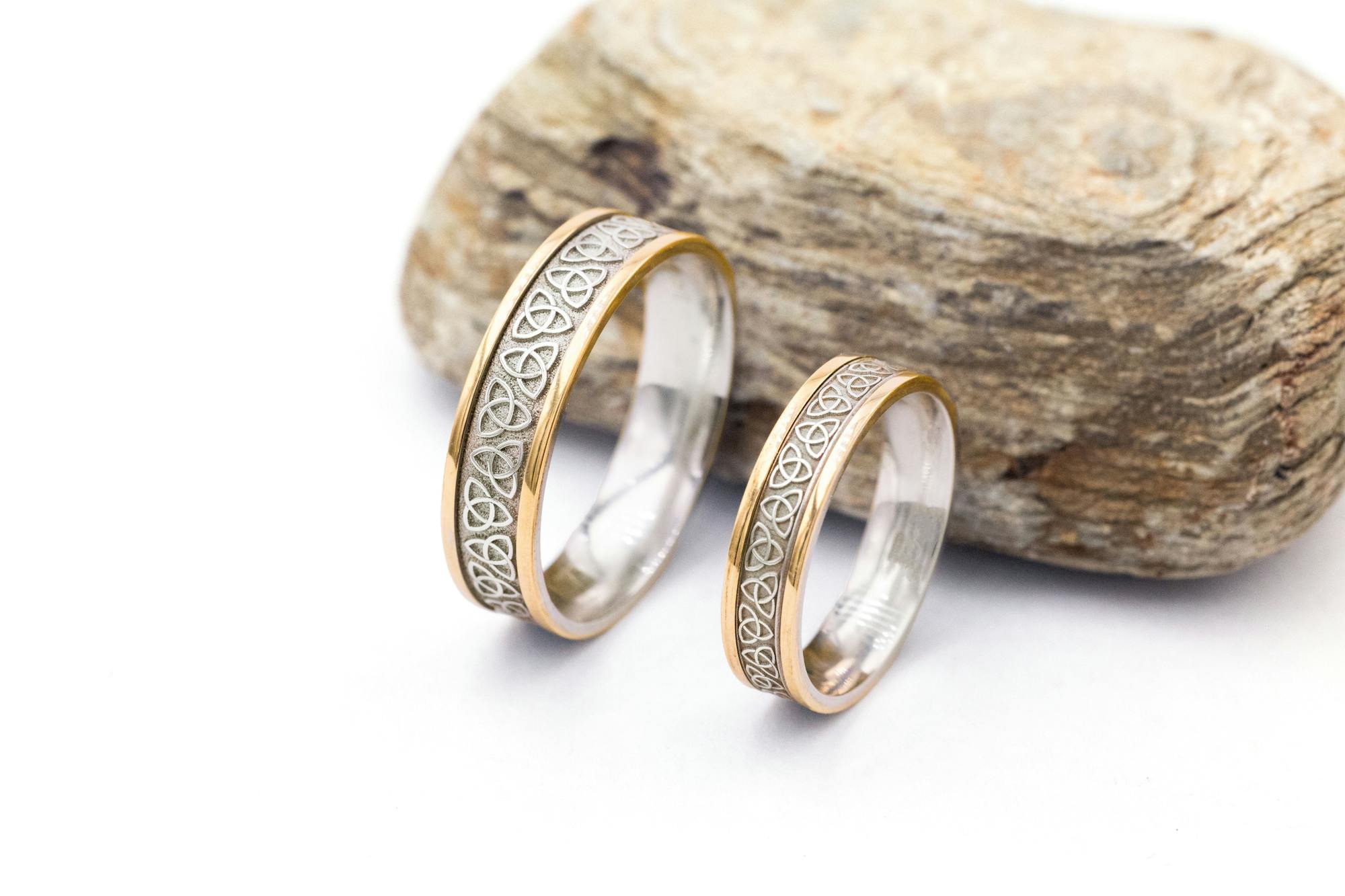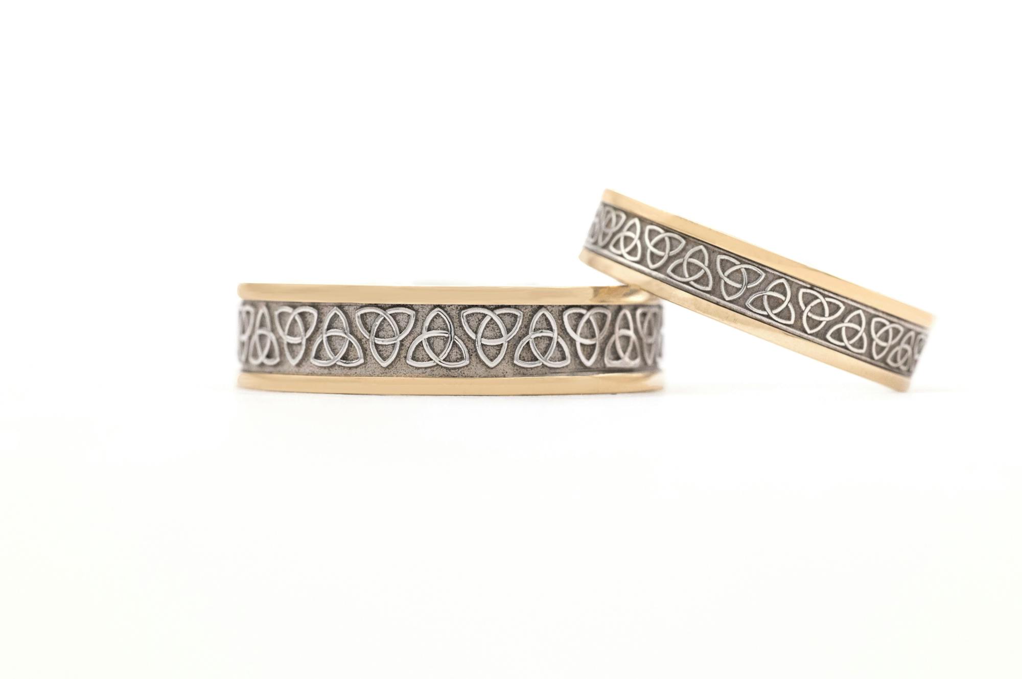 These custom made wedding bands have an impressive array of Trinity knot symbols that sweep around the entire band. The two-tone effect between the white and yellow gold is a match made in heaven.