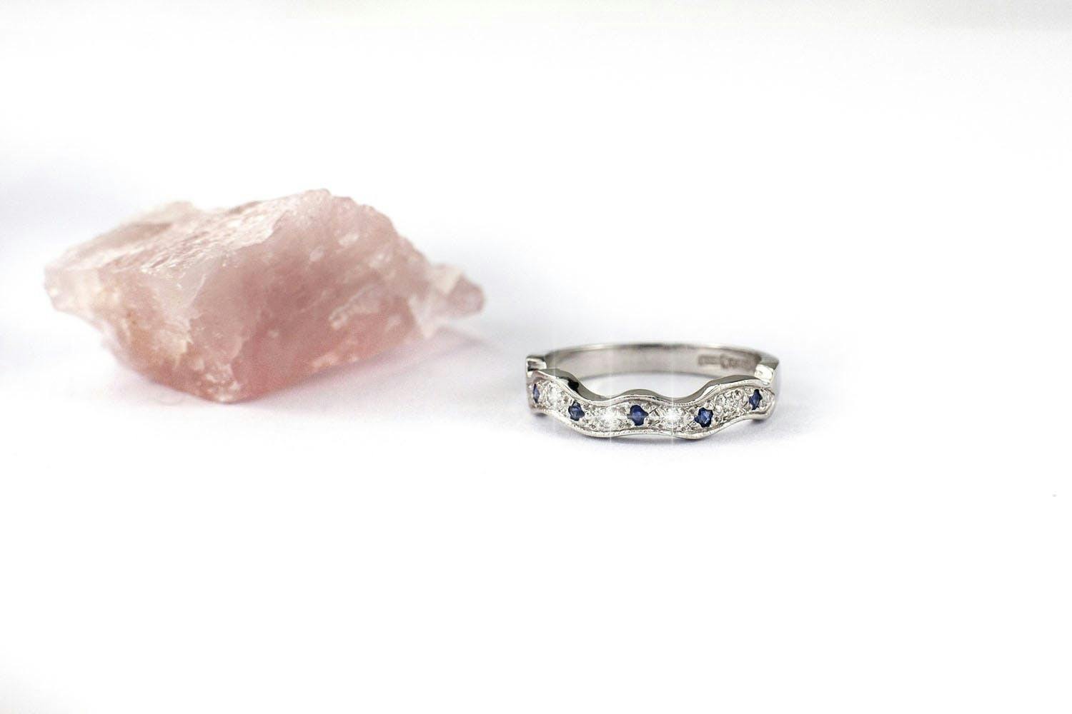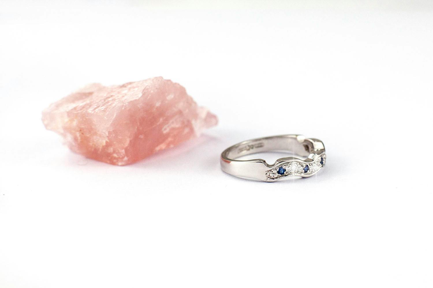 The engagement ring is set with a heart-shaped Indian Sapphire: 5mm x 5mm. Every Sapphire is unique and the exact shade of blue varies from ring to ring
