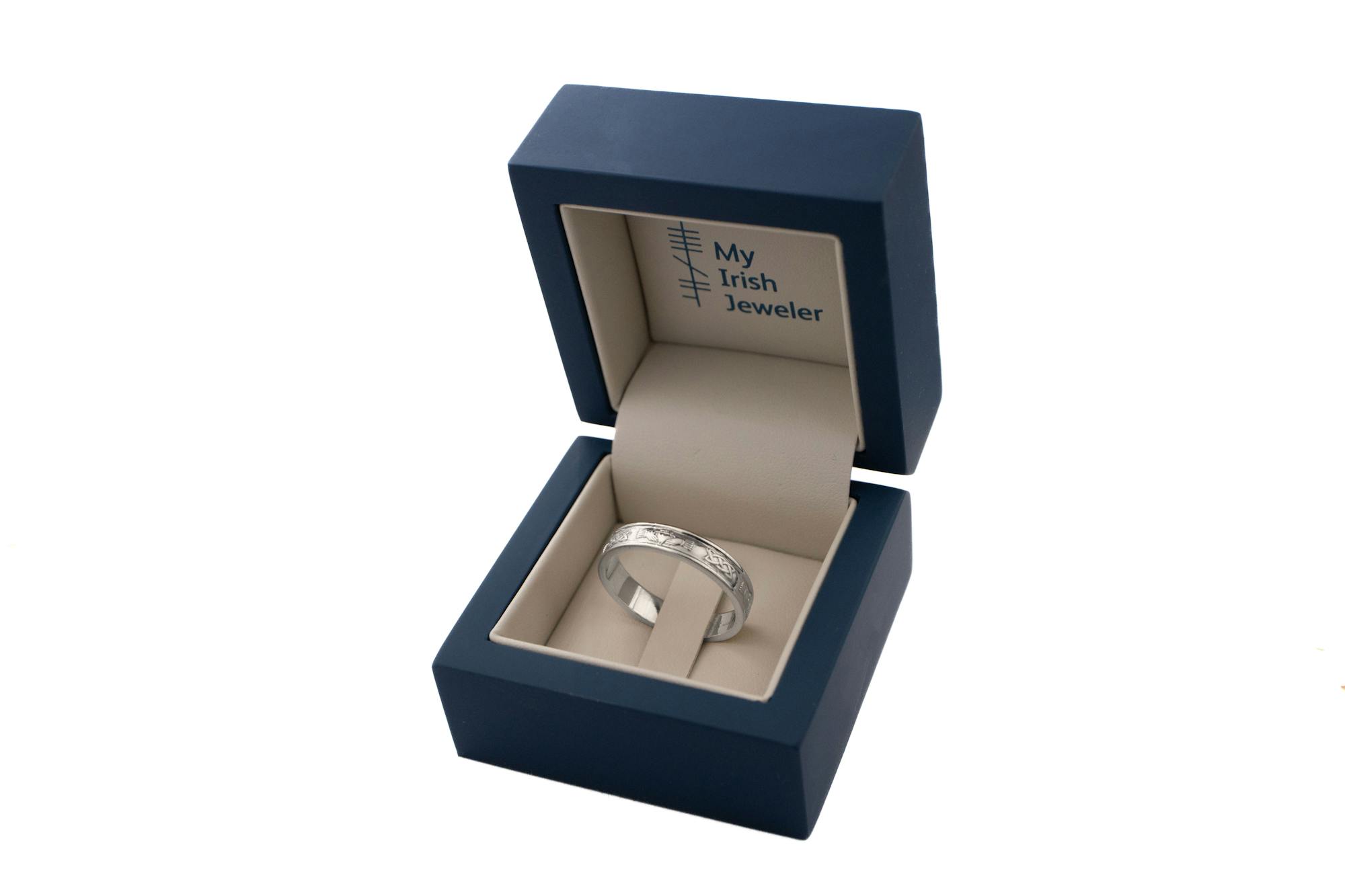 My fiancé had a very specific engagement ring / wedding band in mind for himself. I knew it would be difficult to source from a local jeweler, or ultimately too expensive for a custom build. And most only seemed to have novelty claddagh rings anyway. So I turned to the internet where I found several options, but felt there was something off with each one until My Irish Jeweler. Initially, I was very hesitant. Although the value was right, I was really nervous to spend a large amount of money with an international online vendor. So I sifted through reviews from various websites, which were all generally positive. And I was further put at ease by their free resizing, free 100-day return/refund, and 1-year quality guarantee policies. So I decided to make the purchase, and anxiously awaited. First, I was pleasantly surprised that the ring shipped well in advance of its target shipping date. Delivery was also very fast. They did a fantastic job with the boxing of the parcel, and they provided additional resources about the ring that were so thoughtful. Finally, the ring came exactly as expected from the website - if not exceeding expectations. You can tell it is a quality-made piece. The intricate design is as beautiful in person as it is in photos, and it fit perfectly. I couldn't be happier with the result, and the same could be said for my fiancé. Thank you!