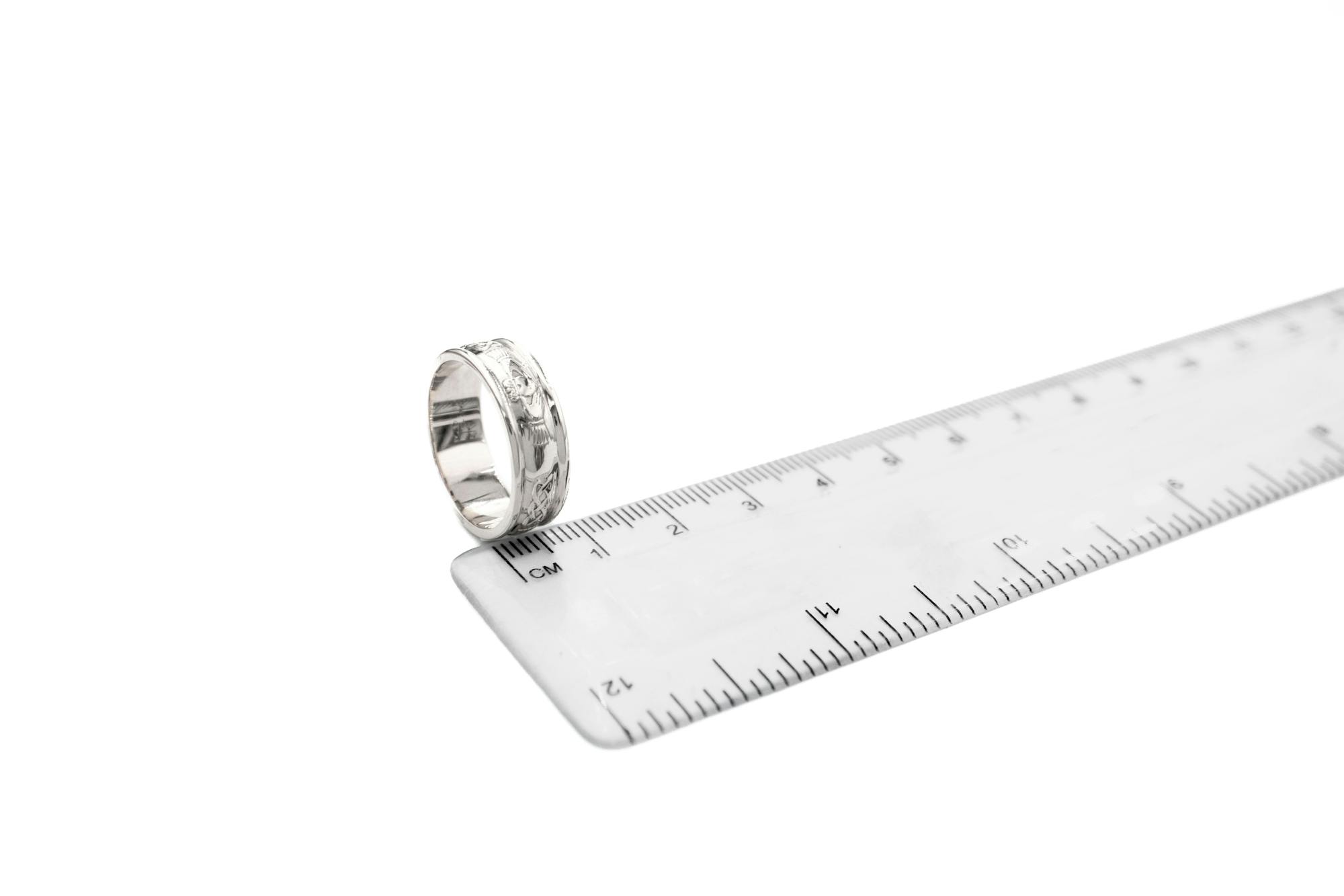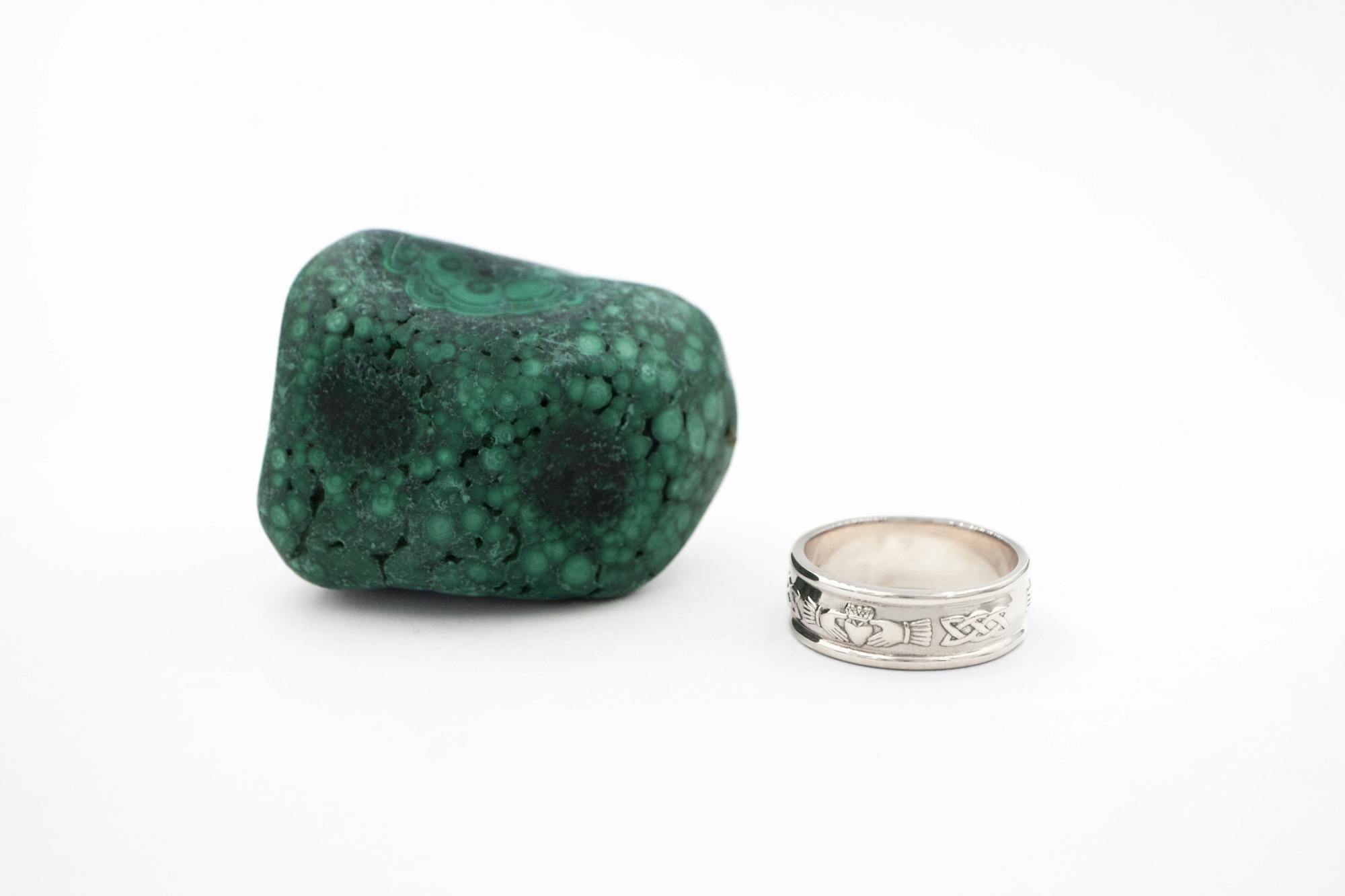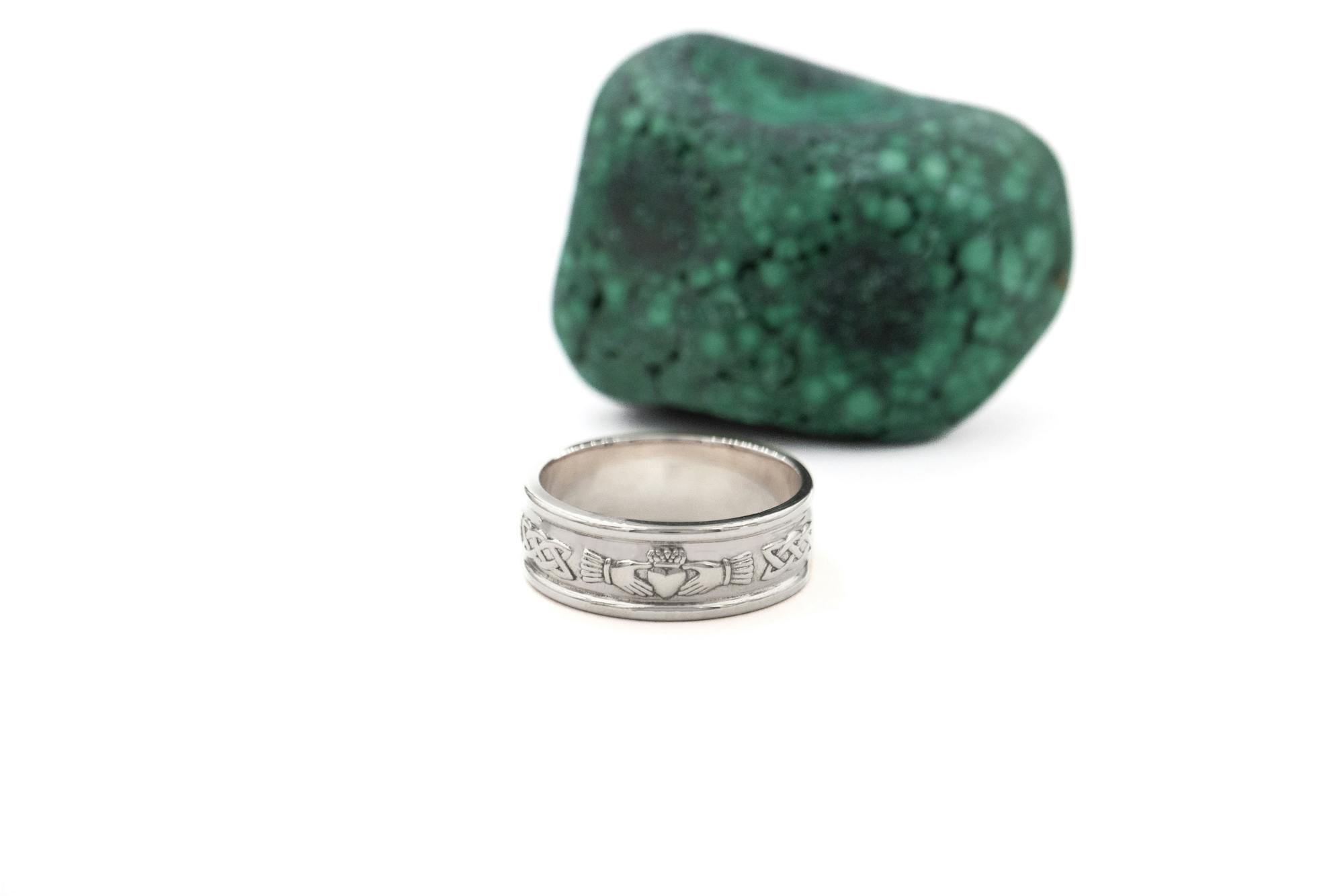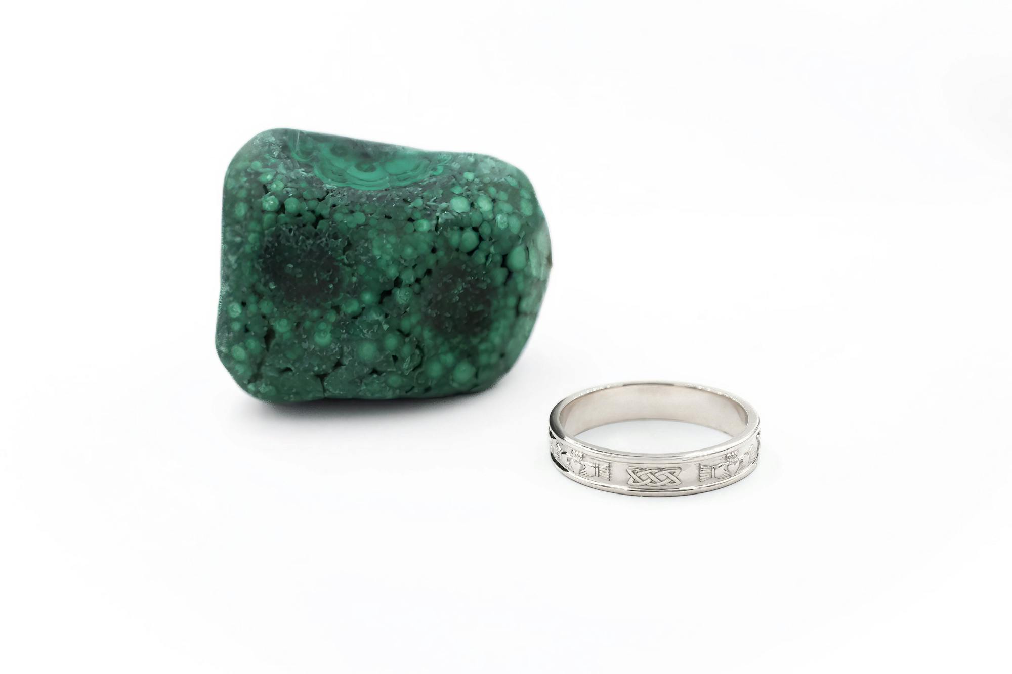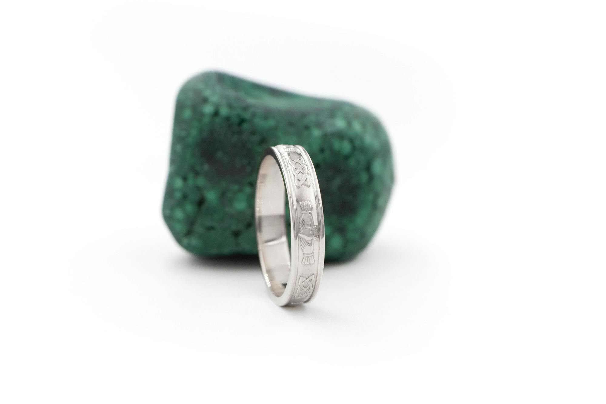 The heart crown and hands of the Claddagh represent, love, loyalty, and friendship, a beautiful symbol cherished in Ireland and exchanged between sweethearts for over 400 years. The Celtic knot band enhances this meaning representing strength and eternity, making this ring a meaningful choice for those looking to mark milestones.