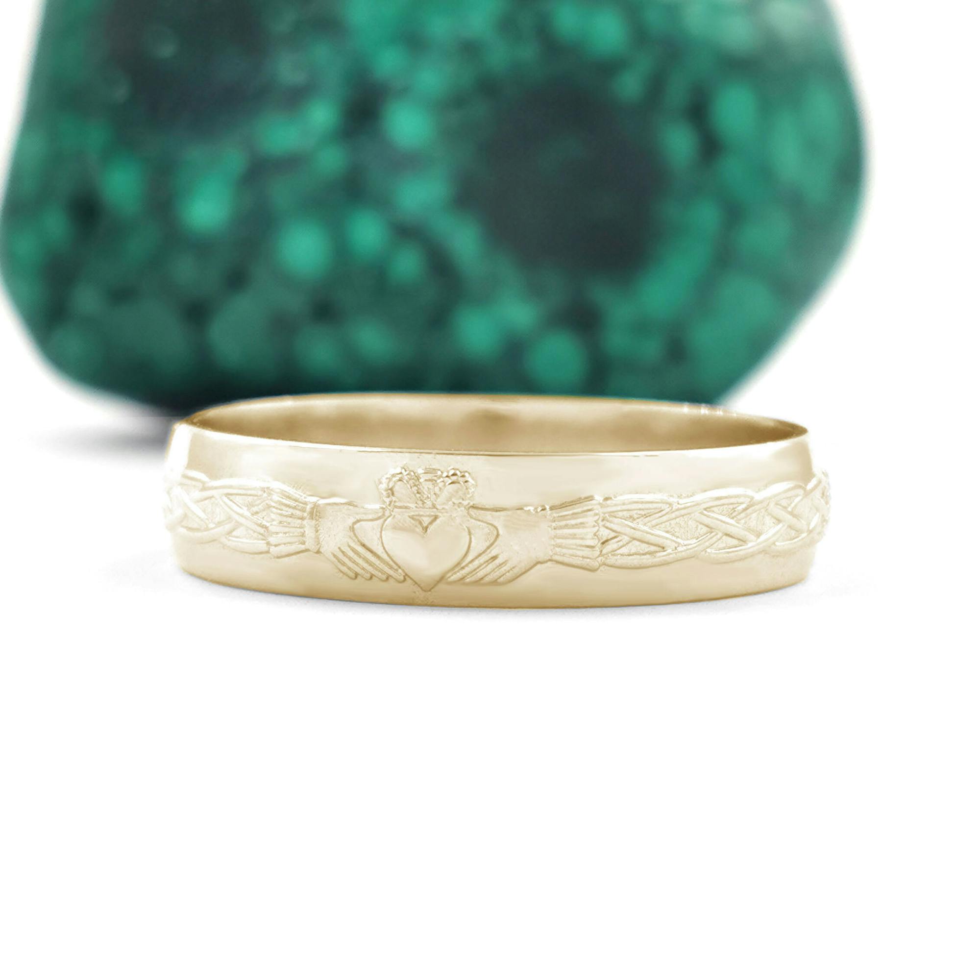 The heart crown and hands of the Claddagh represent, love, loyalty, and friendship, a beautiful symbol cherished in Ireland and exchanged between sweethearts for over 400 years. The Celtic knot band enhances this meaning, representing strength and eternity. A meaningful choice for those looking to mark milestones.
