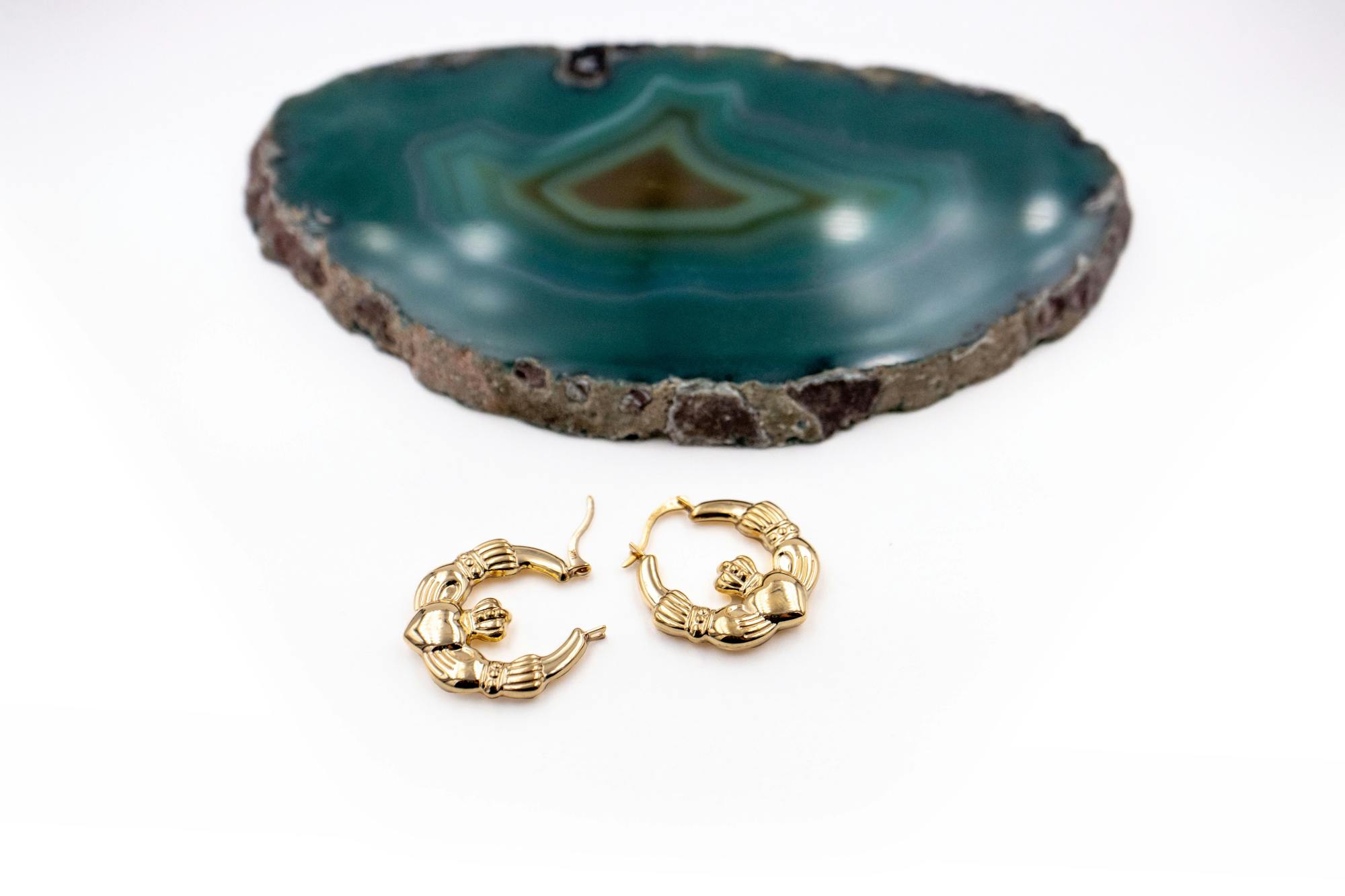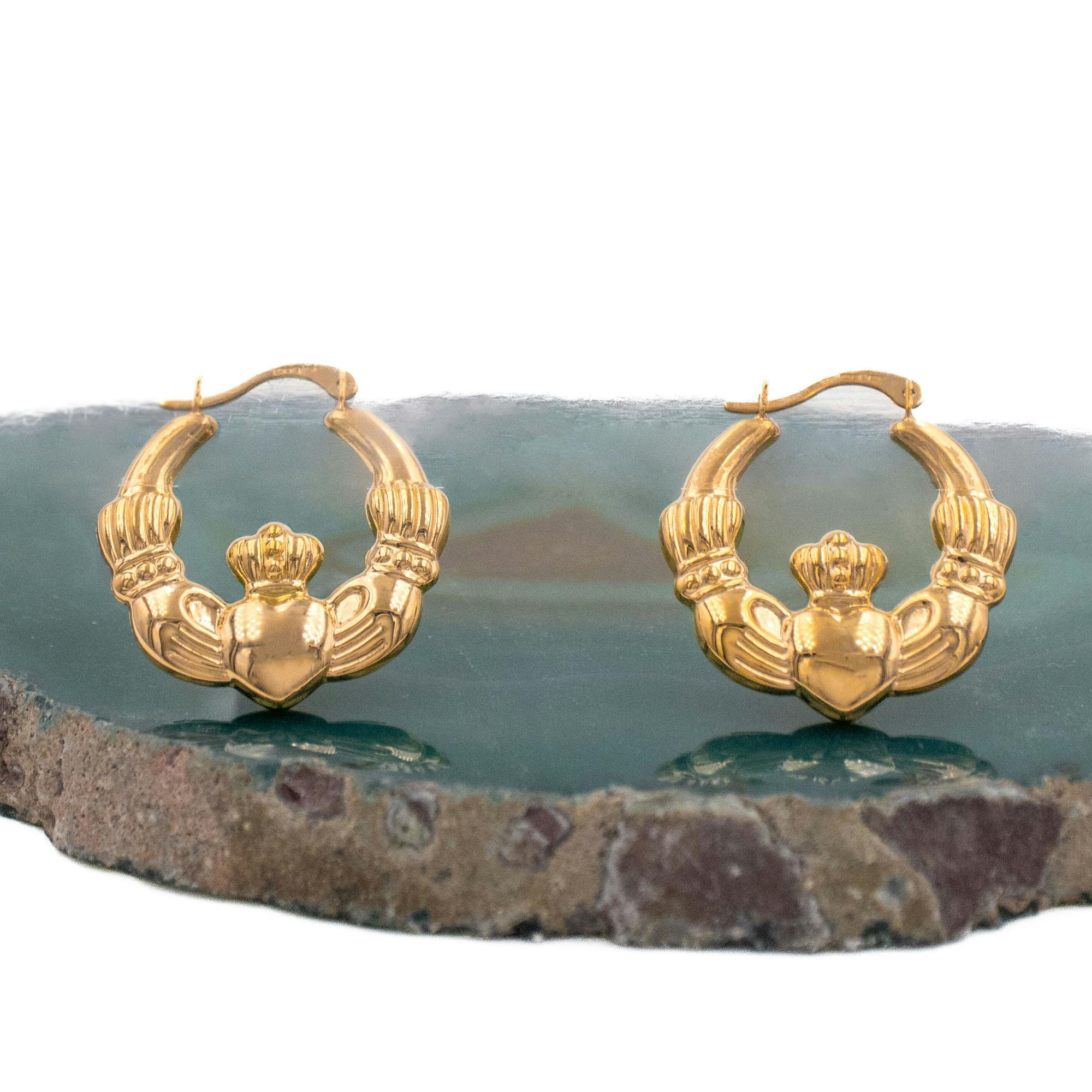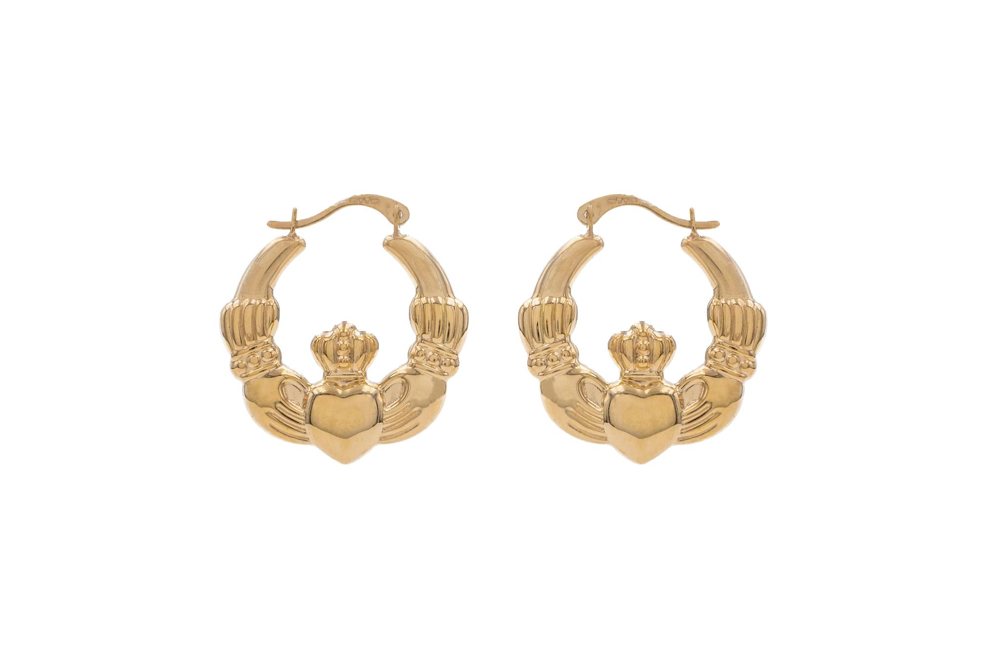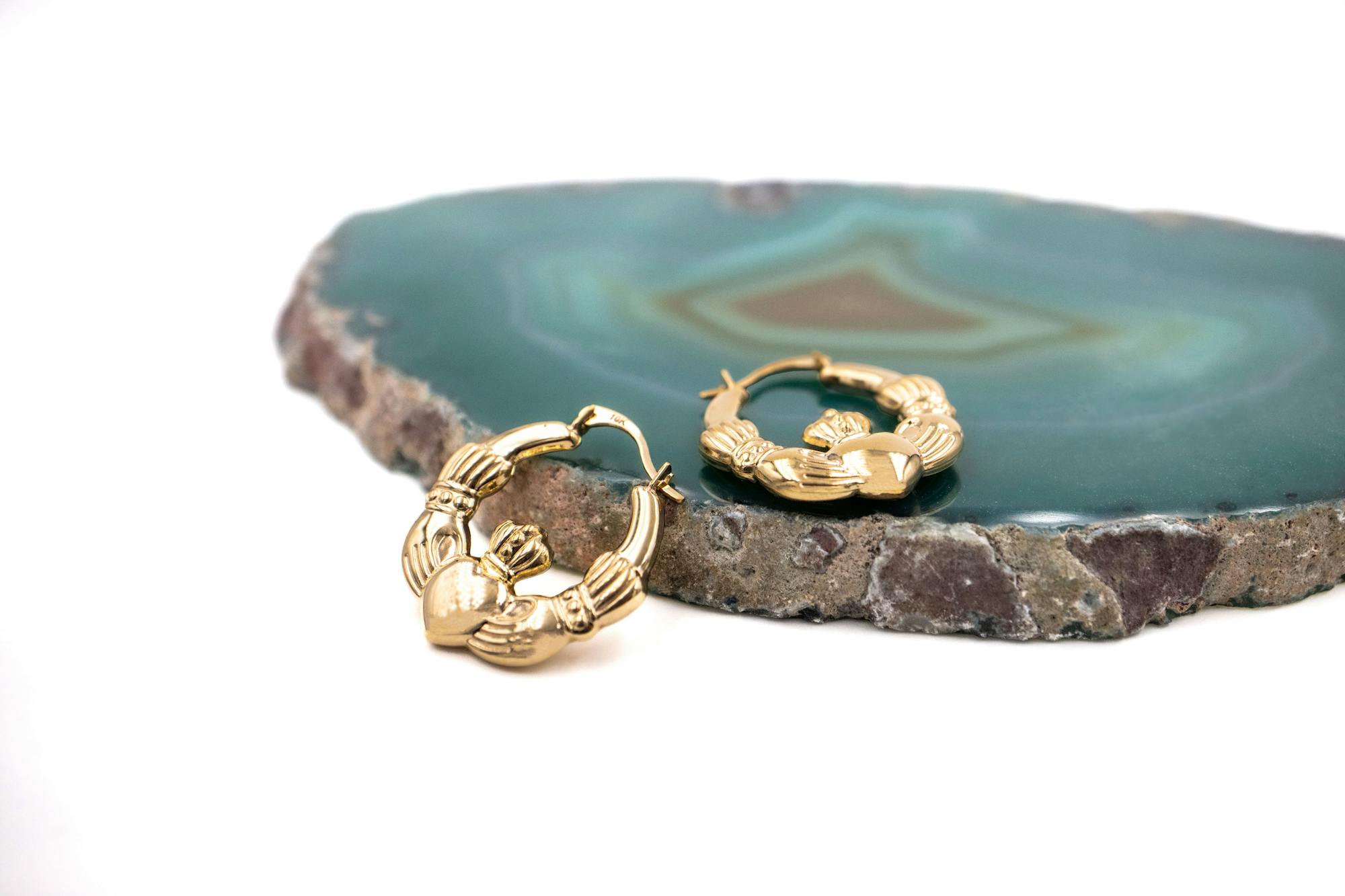 These gold hoop earrings feature the iconic Irish Claddagh - a symbol of love, loyalty, and friendship with a history that stretches back over 400 years to Ireland's wild Atlantic coast.