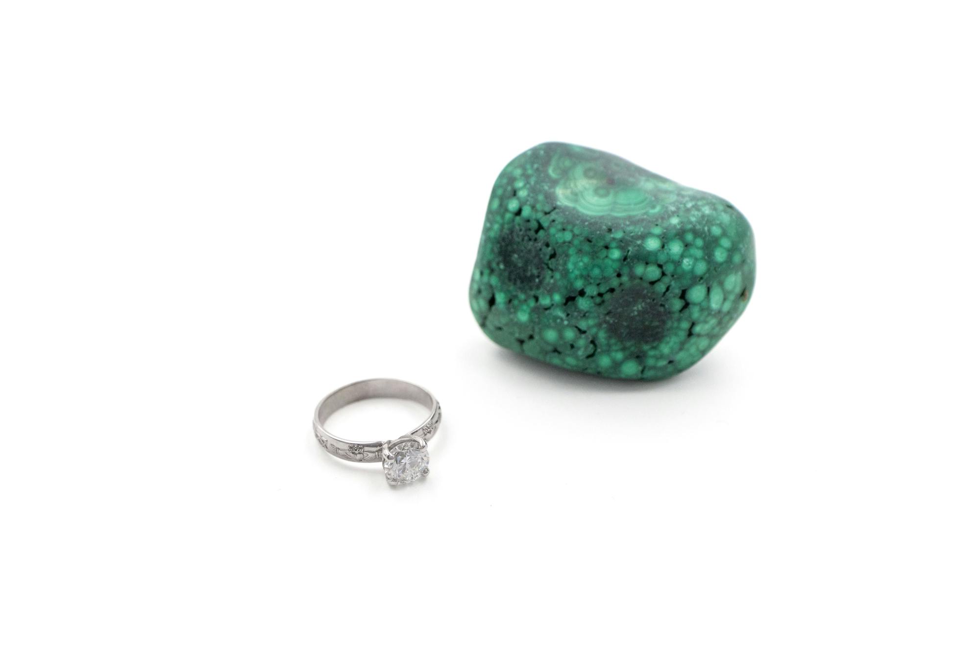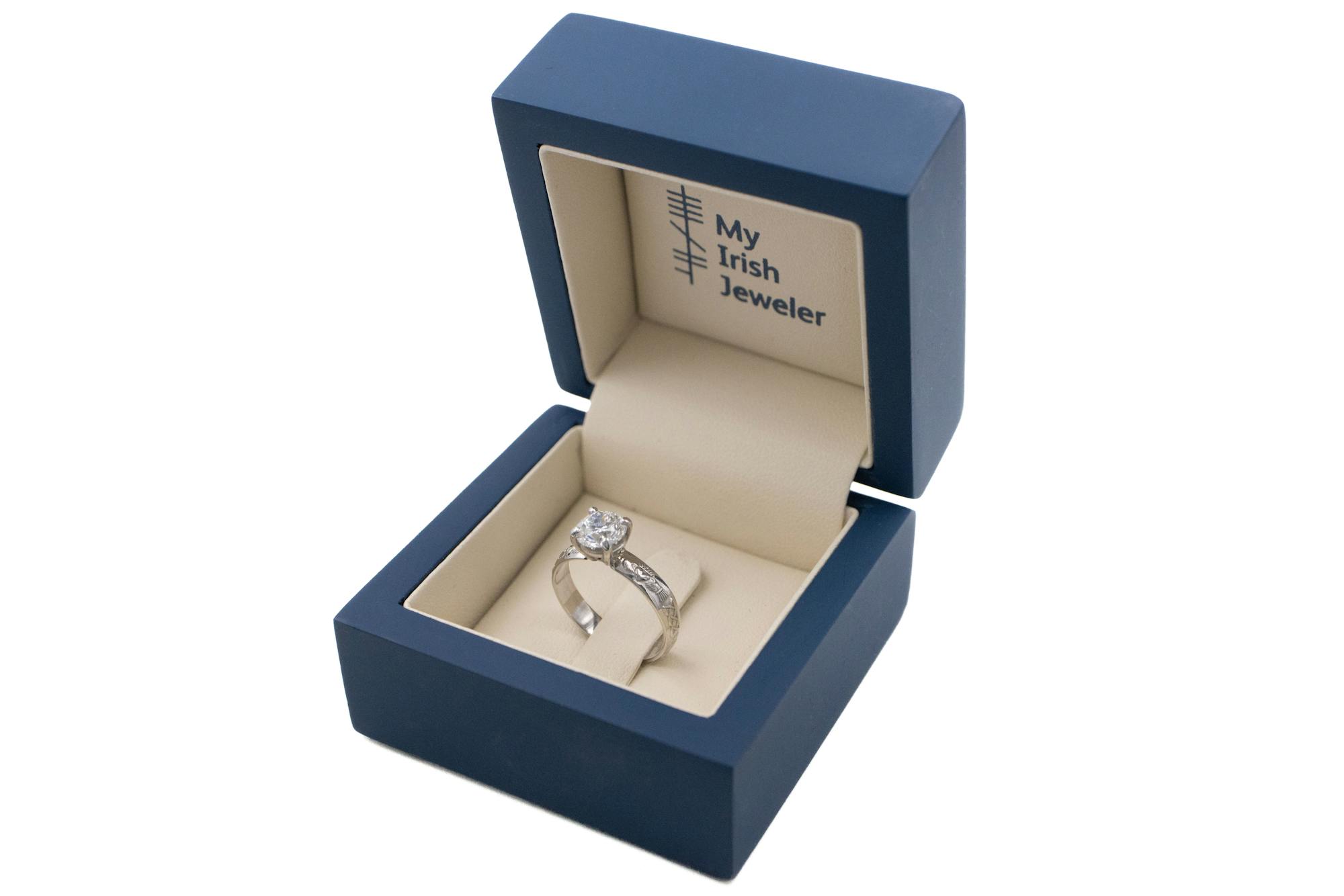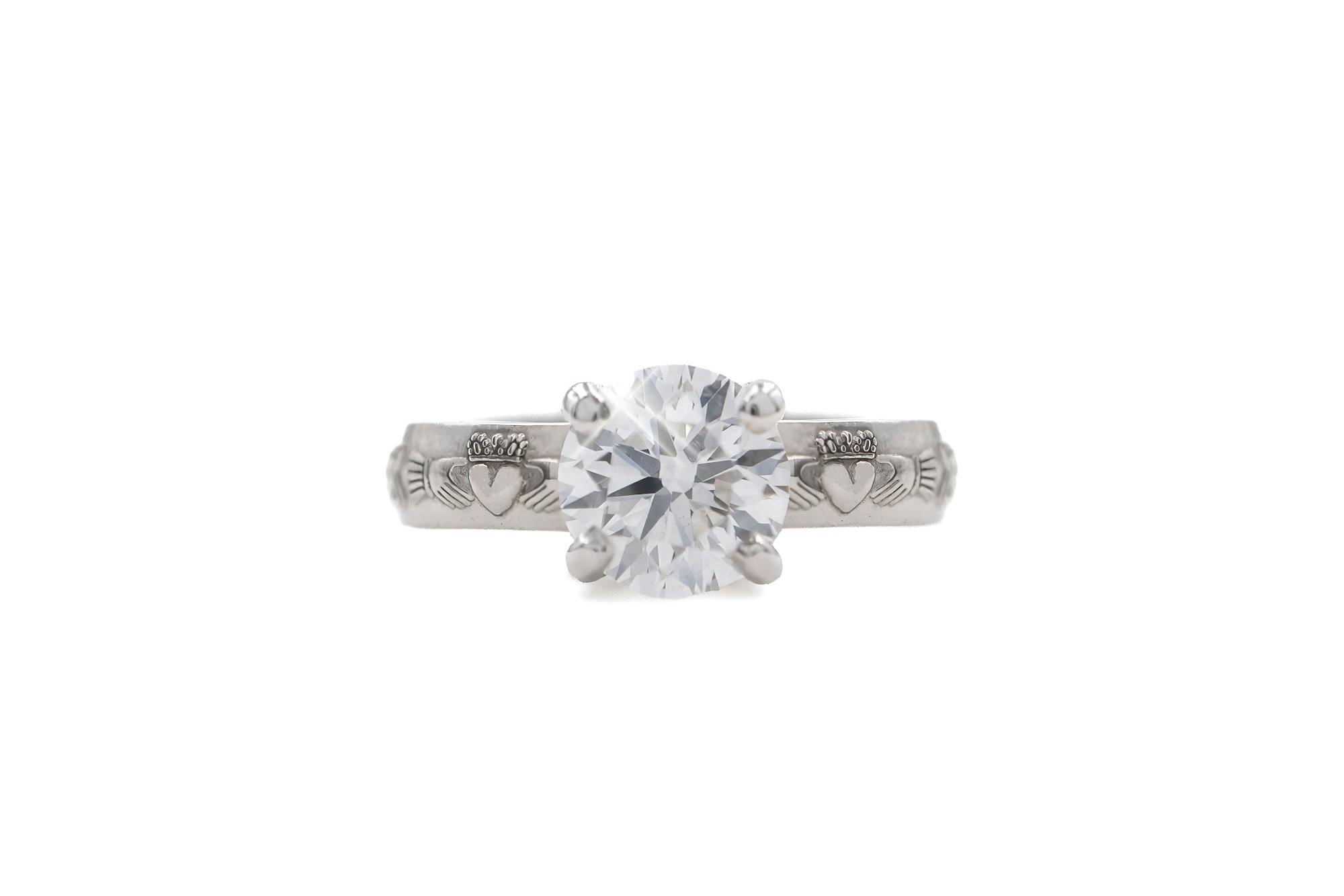 Set with an exquisite 1ct round brilliant cut diamond in a dramatic elevated setting, this ring offers breathtaking sparkle with a centuries-old promise. With Claddagh and Celtic love knot emblems adorning a steadfast band, you offer her an eternity of love, friendship, and loyalty.