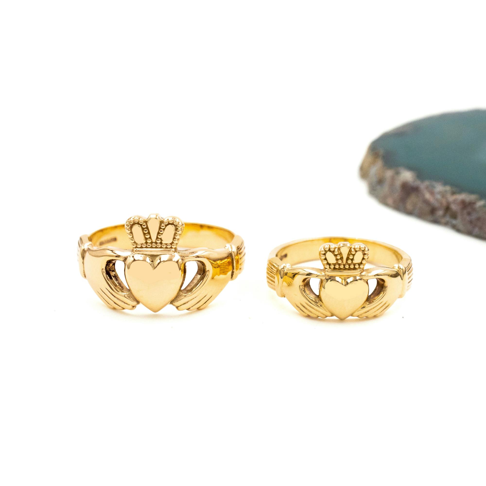 Choose the metal you would like for your Claddagh set - warm 9K, rich 14K, or premium 18K yellow gold.