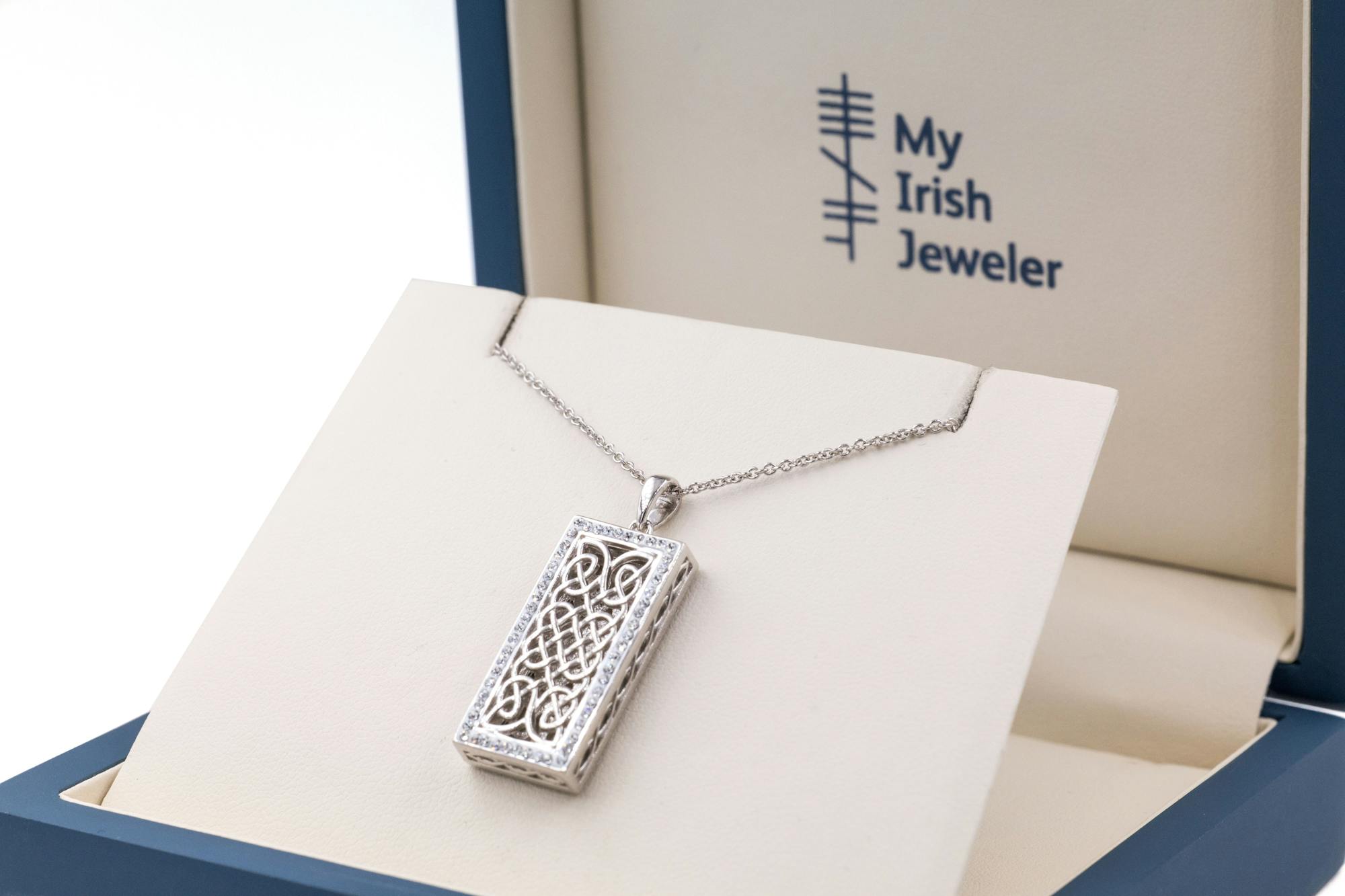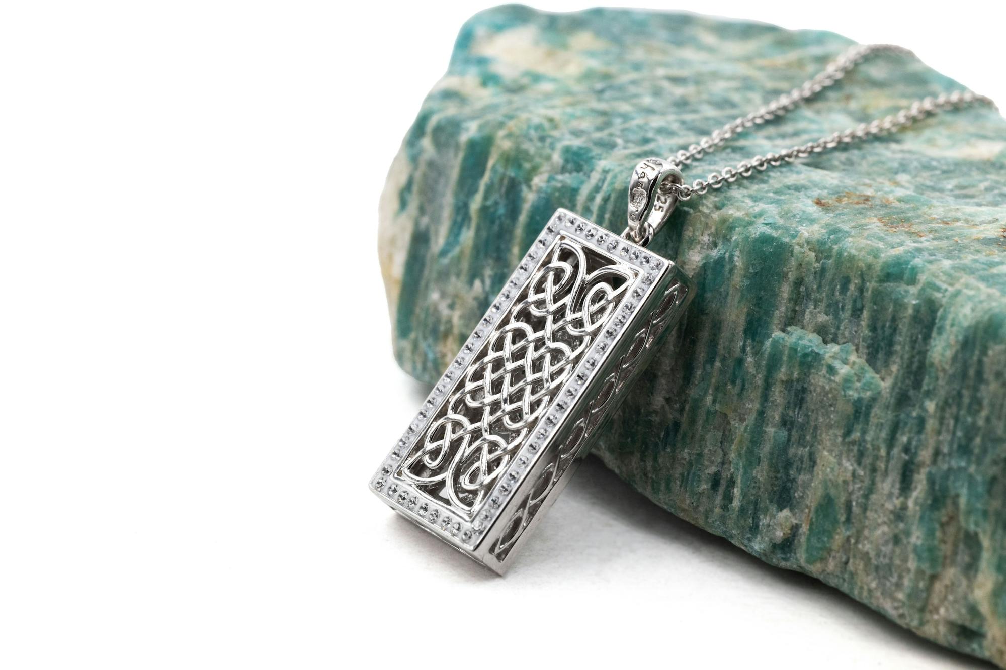 Open and airy Celtic Knot interlace draws the eye, with infinity knots flanked by sparkling CZ, framing the fine metalwork and adding a tasteful touch of glamour.