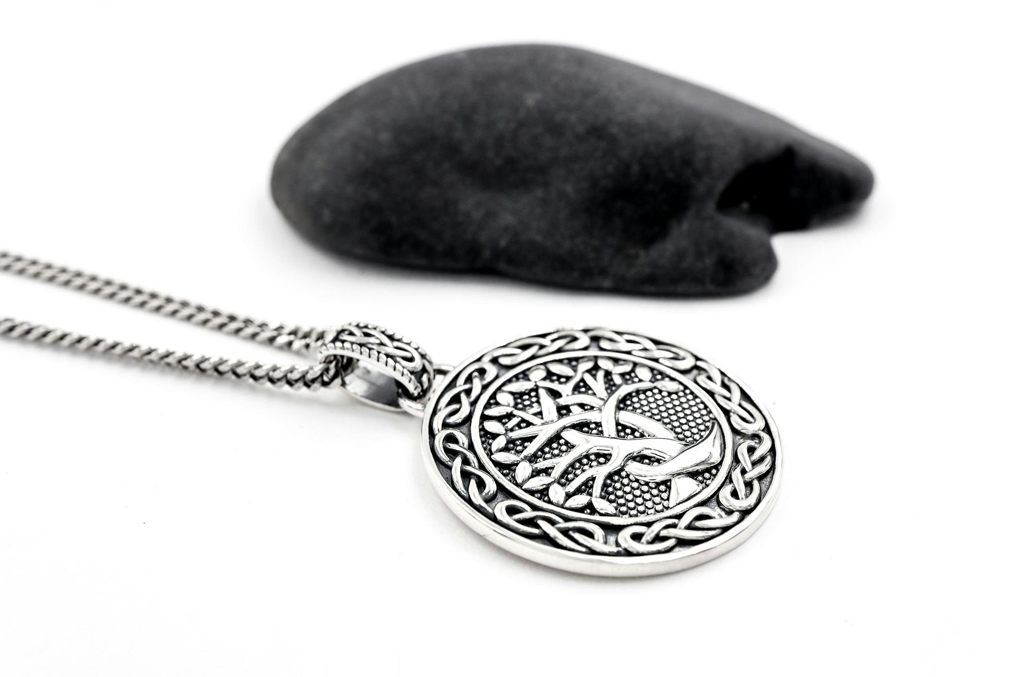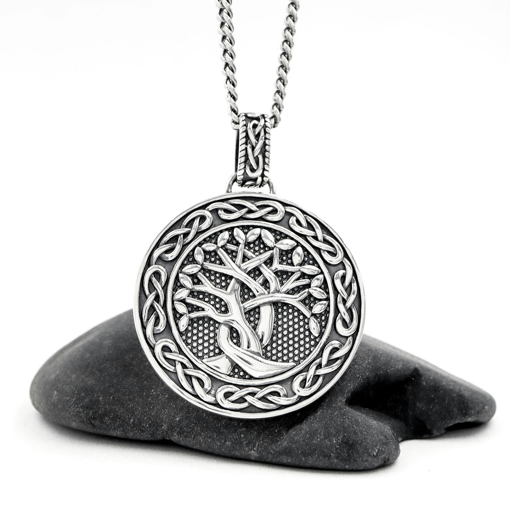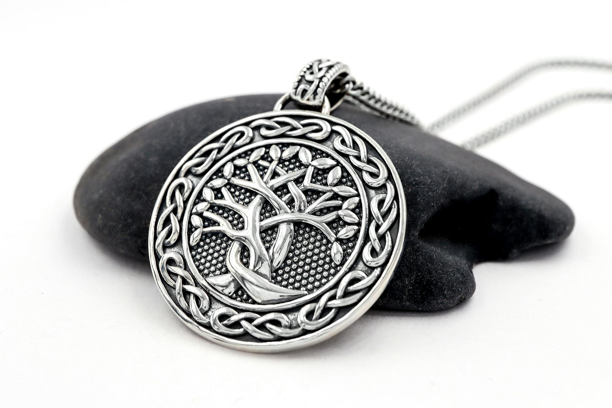 Solid, strong, and robust, this tree of life necklace combines deep symbolism and quality materials with striking celtic style. A intricately detailed sterling silver tree of life sits in relief against a studded oxidized sterling silver backdrop.