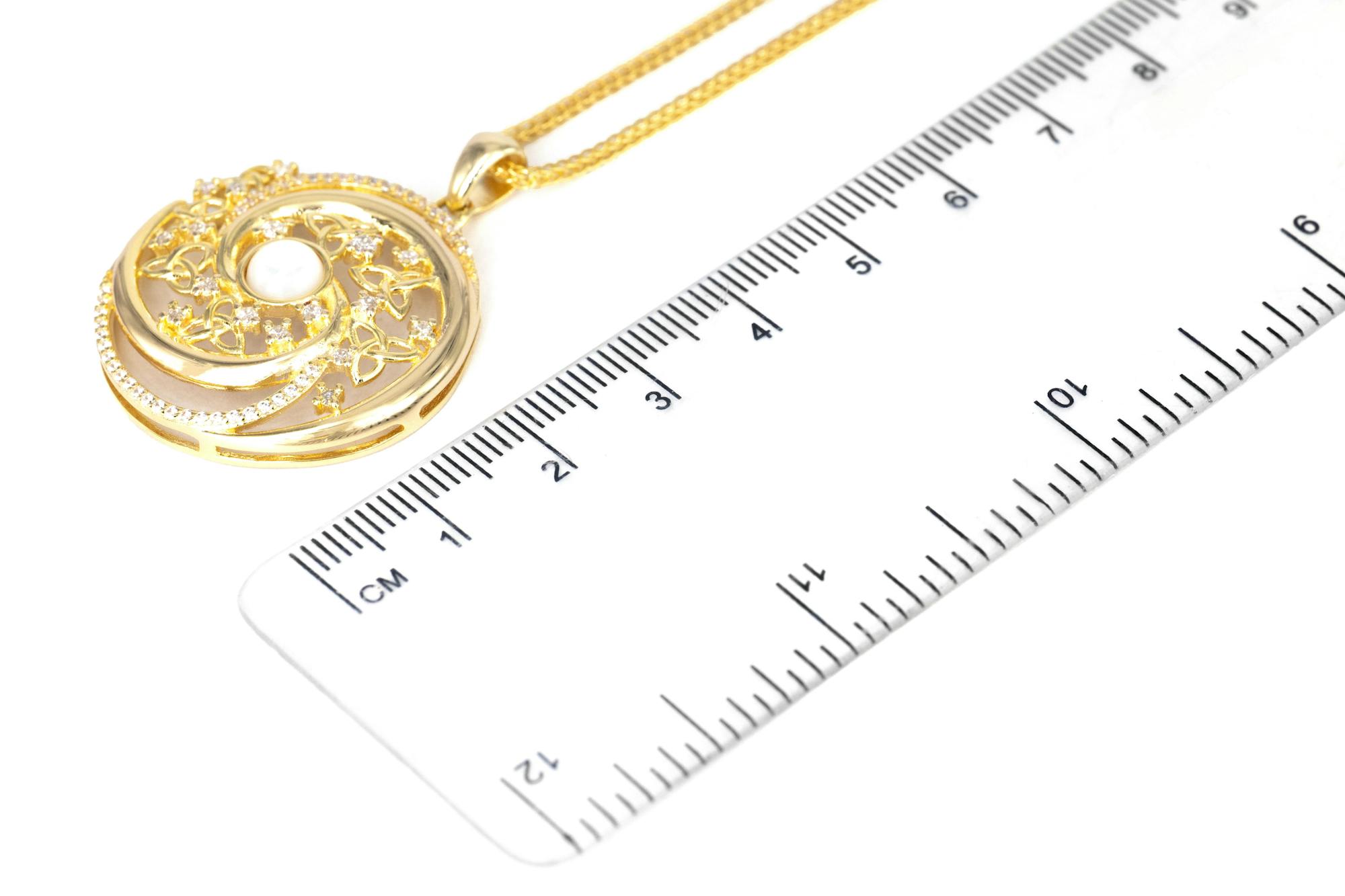 Elegant spirals studded with sparkling cubic zirconia, draw the eye. Set within the spiral arms, delicate trinity knots, represent strength, connection, and eternity. A beautiful pairing for mother of pearl which is associated with good luck and prosperity.