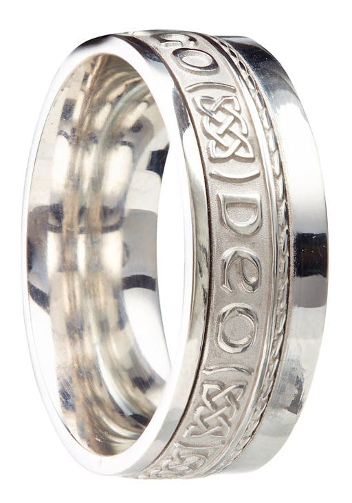 This beautifully made ring features the gaelic inscription "Grá Go Deo", which means "Love Forever". A celtic knot symbol features between each of the words. The area behind the words has been darkened using a combination of black enamel and oxidization.