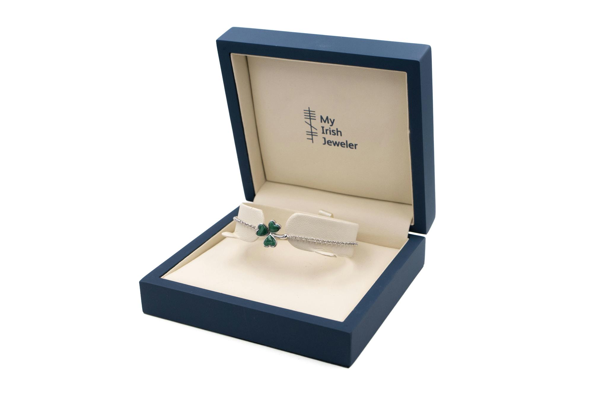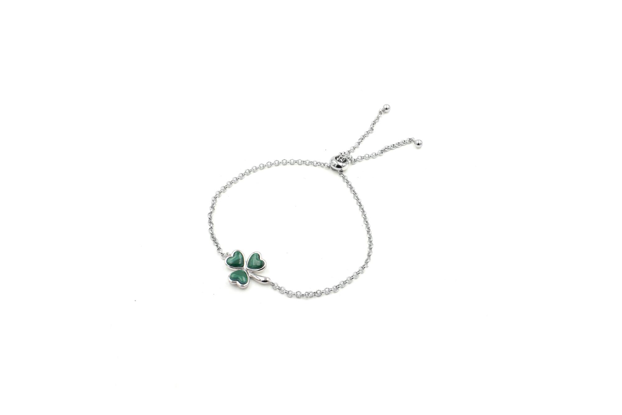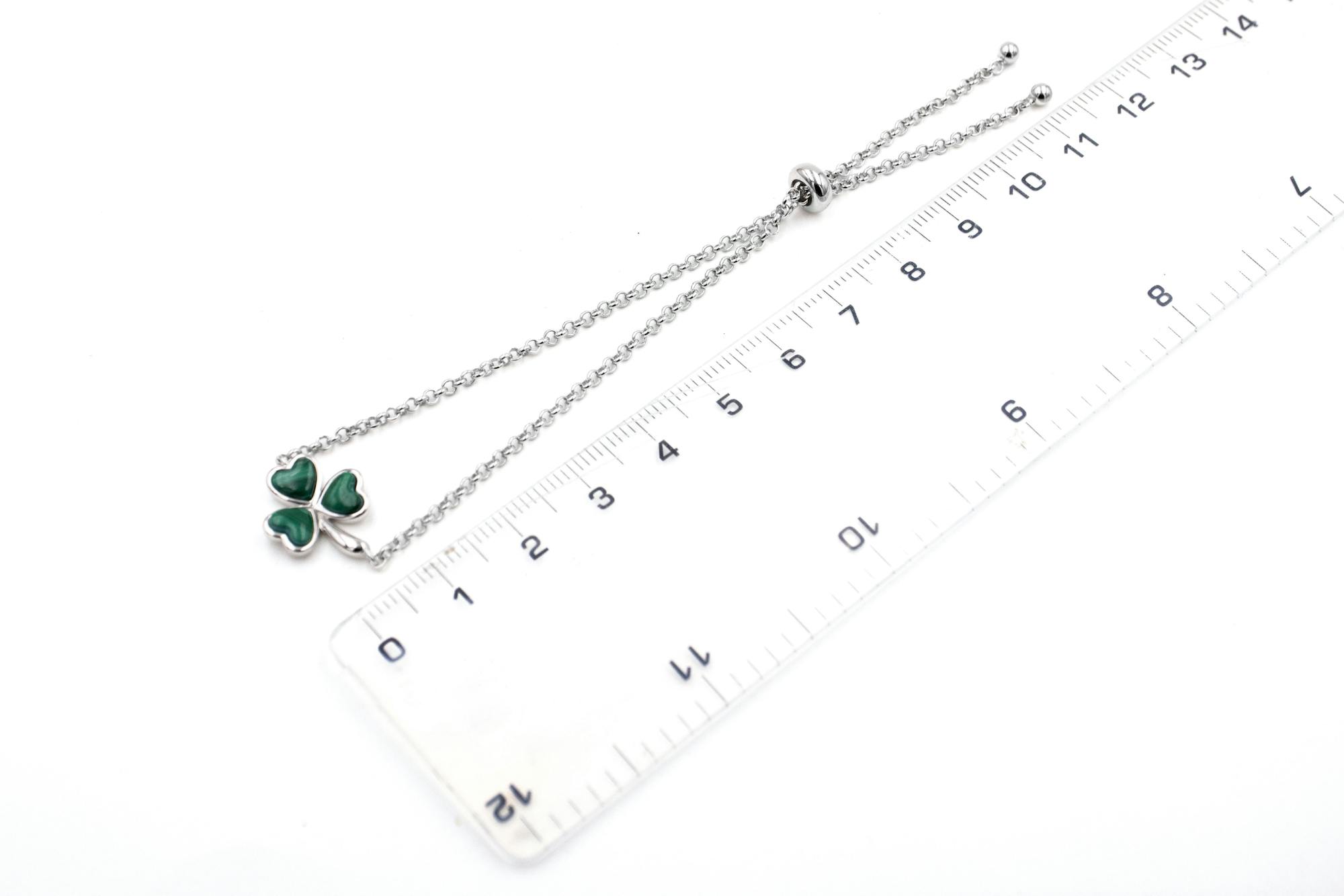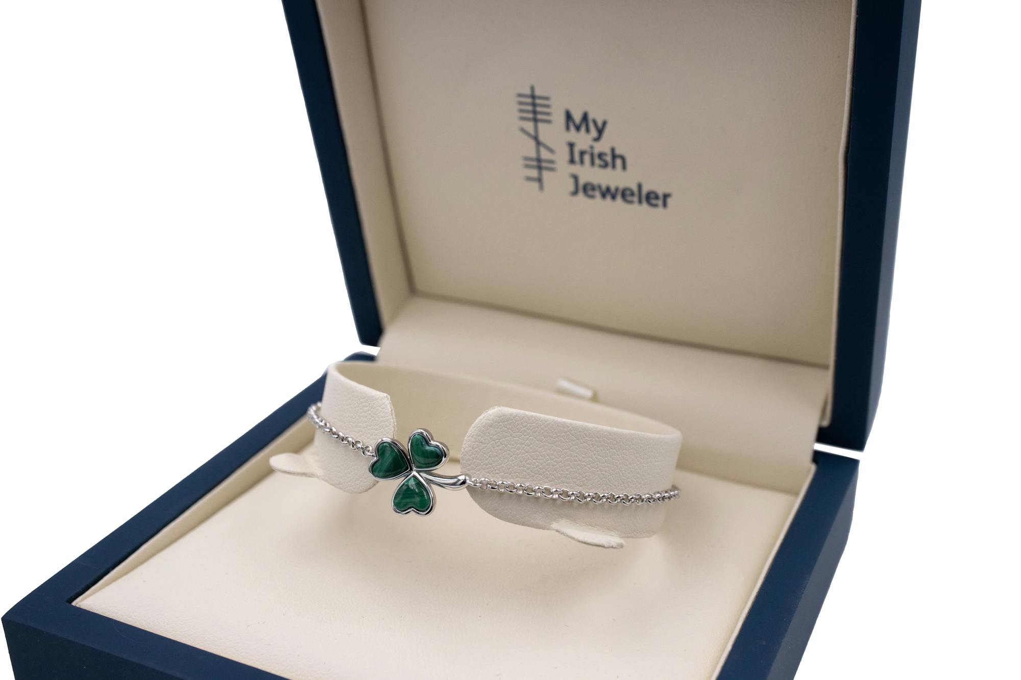 The bracelet is adjustable and designed to fit a 7.5 inch wrist or smaller. Love the look? Complete the set with our matching malachite shamrock earrings, necklace, or ring.