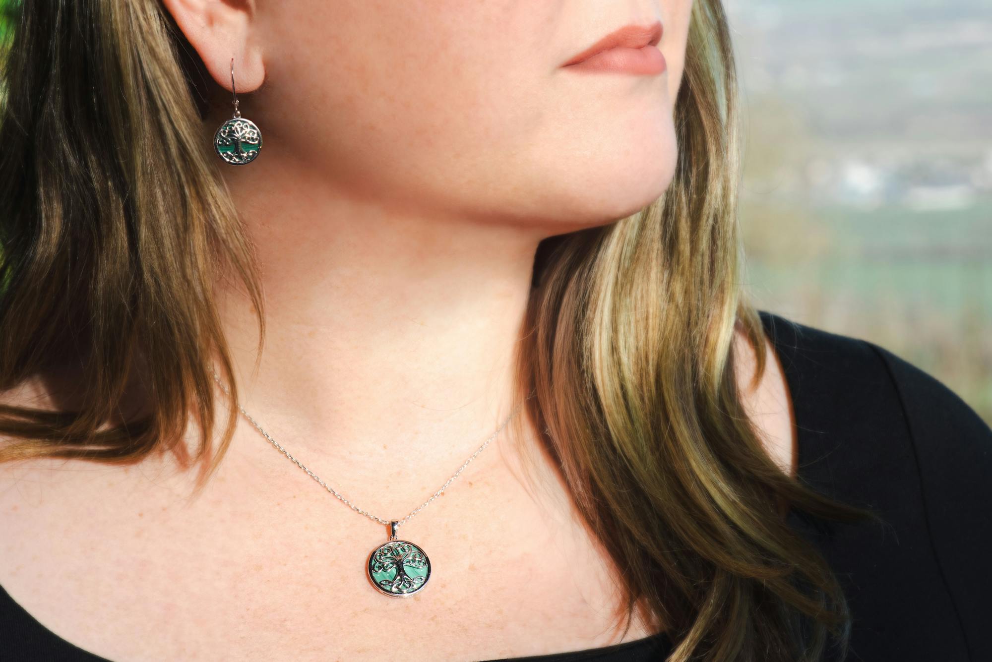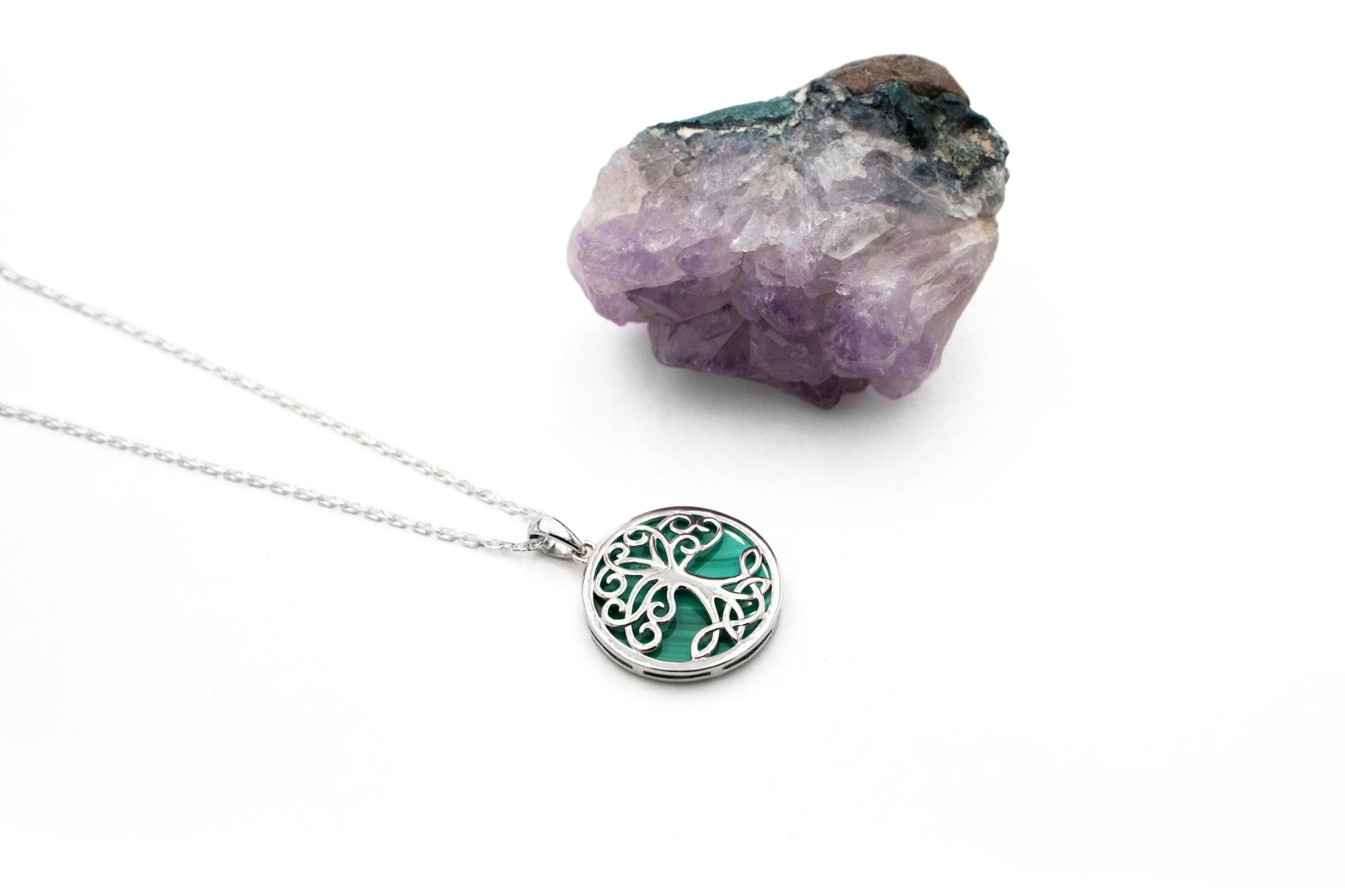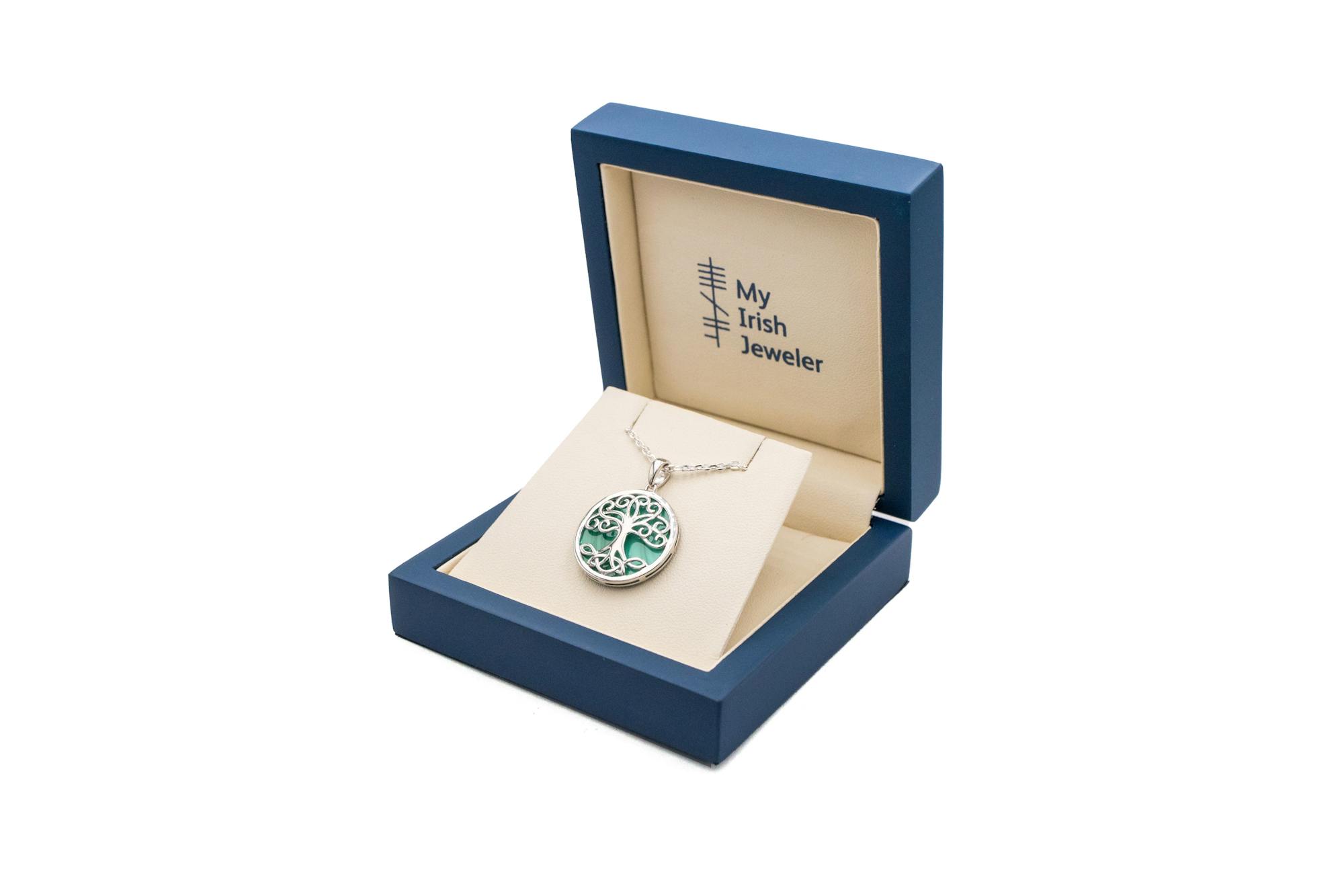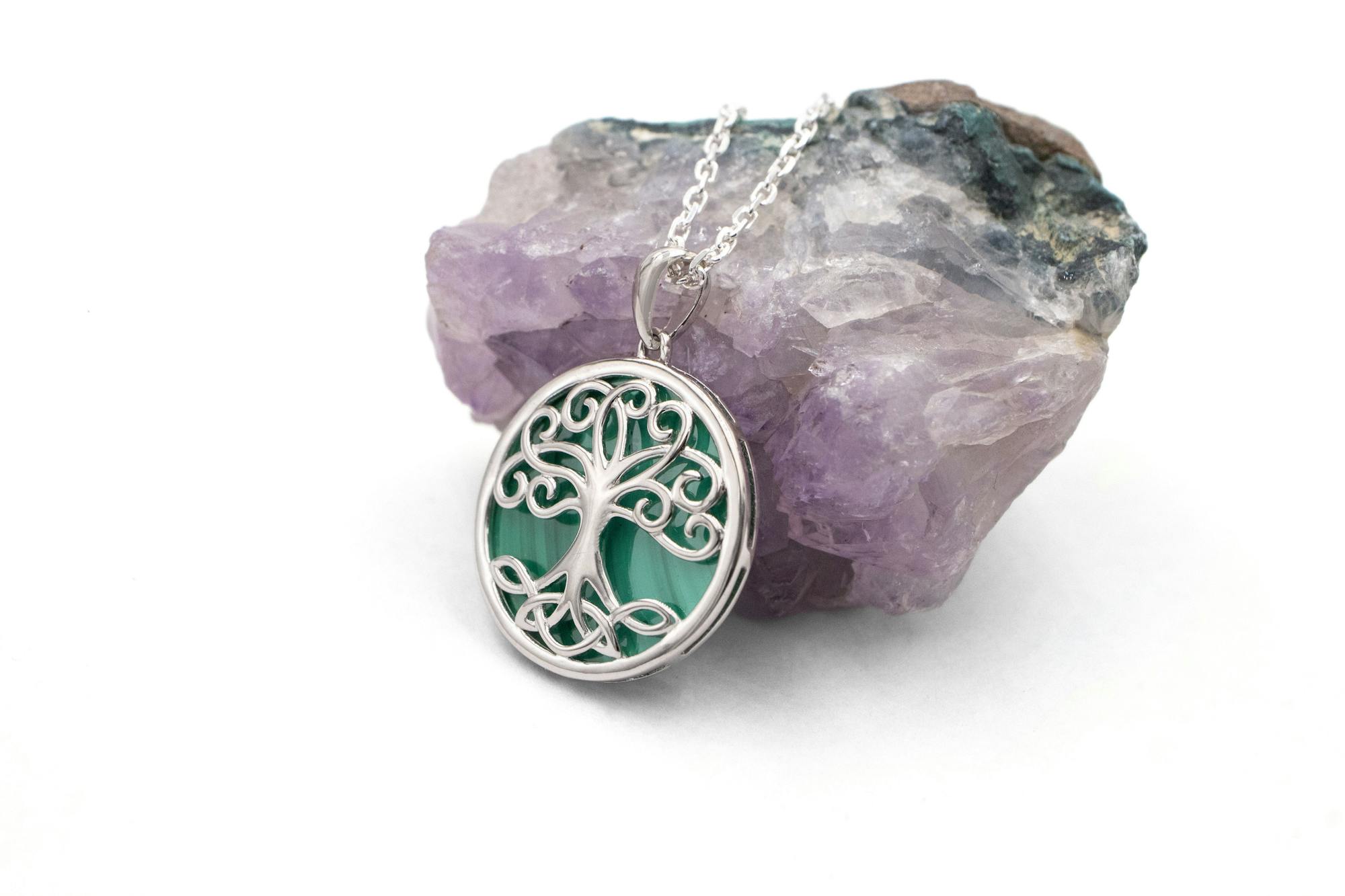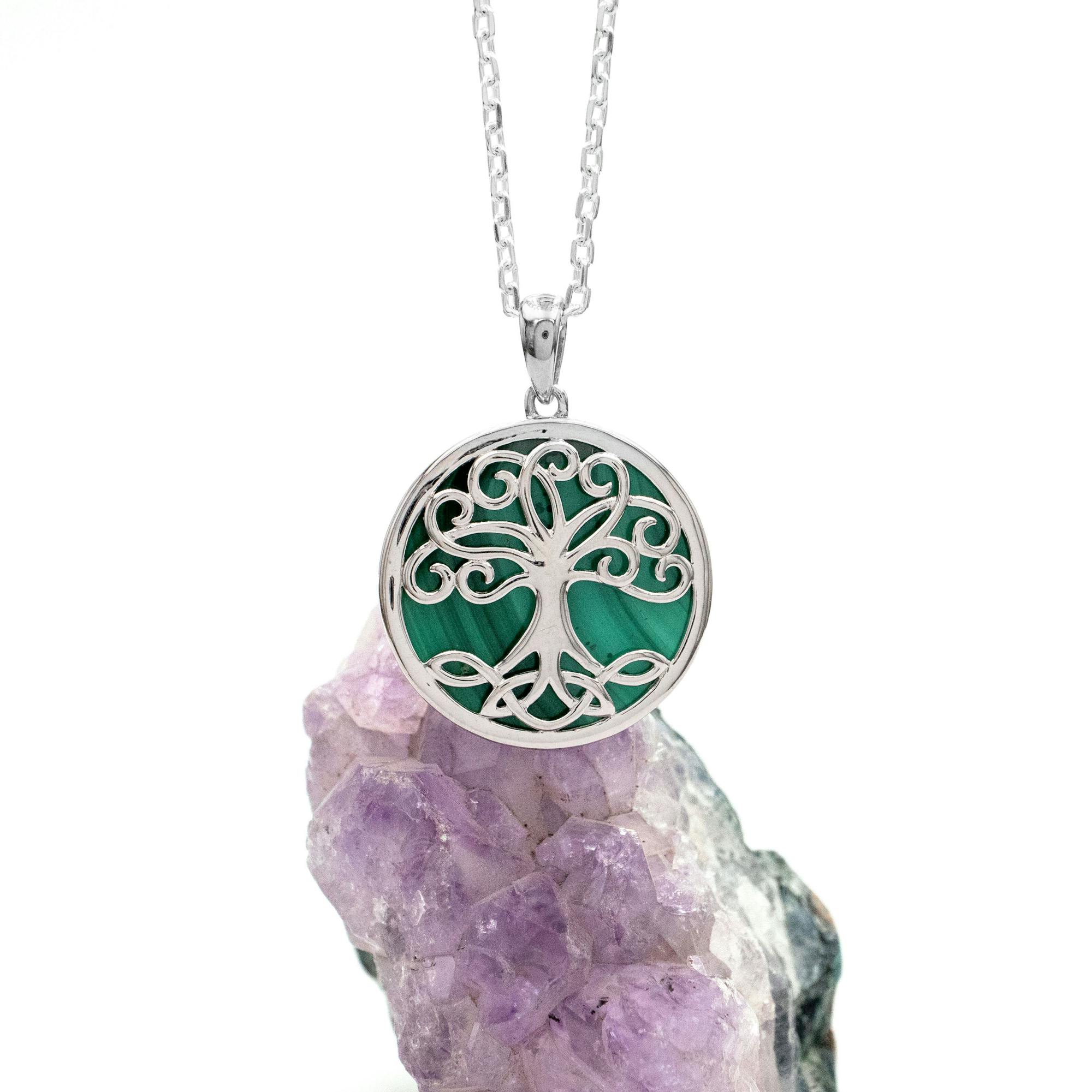 A truly magical necklace, carefully crafted in solid sterling silver and featuring a silhouetted Celtic tree of life, set against the rich and vibrant green tones of malachite.