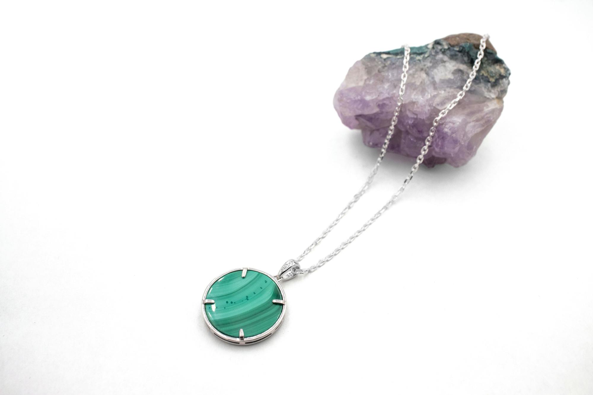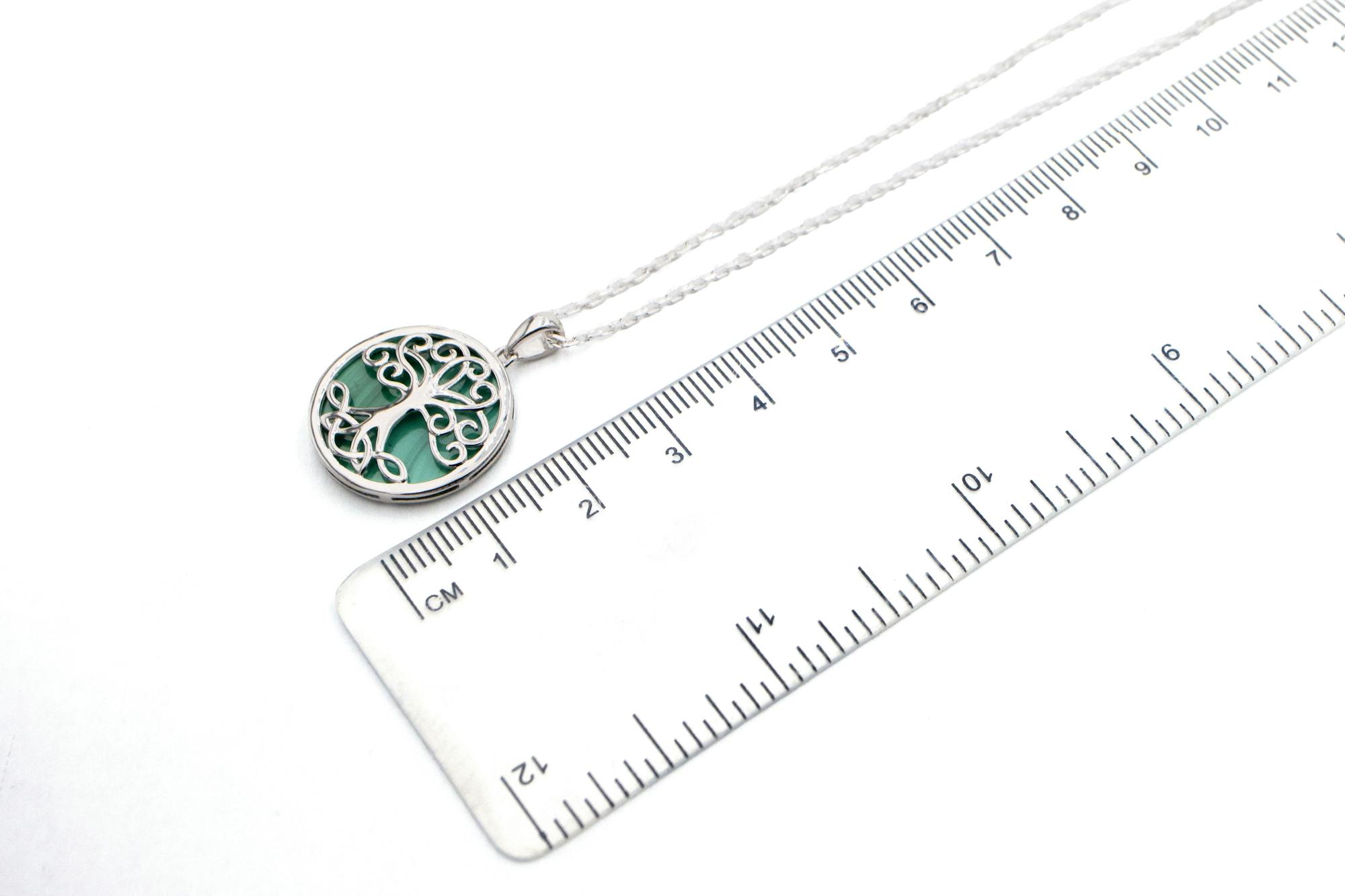 The necklace is measured including the polished bale and comes with an 18 inch sterling silver chain. If you prefer a longer or chunkier chain, you can choose from our handpicked selection that pair perfectly with this pendant. Love the look? Complete the set with our matching malachite tree of life earrings, bracelet, or ring.
