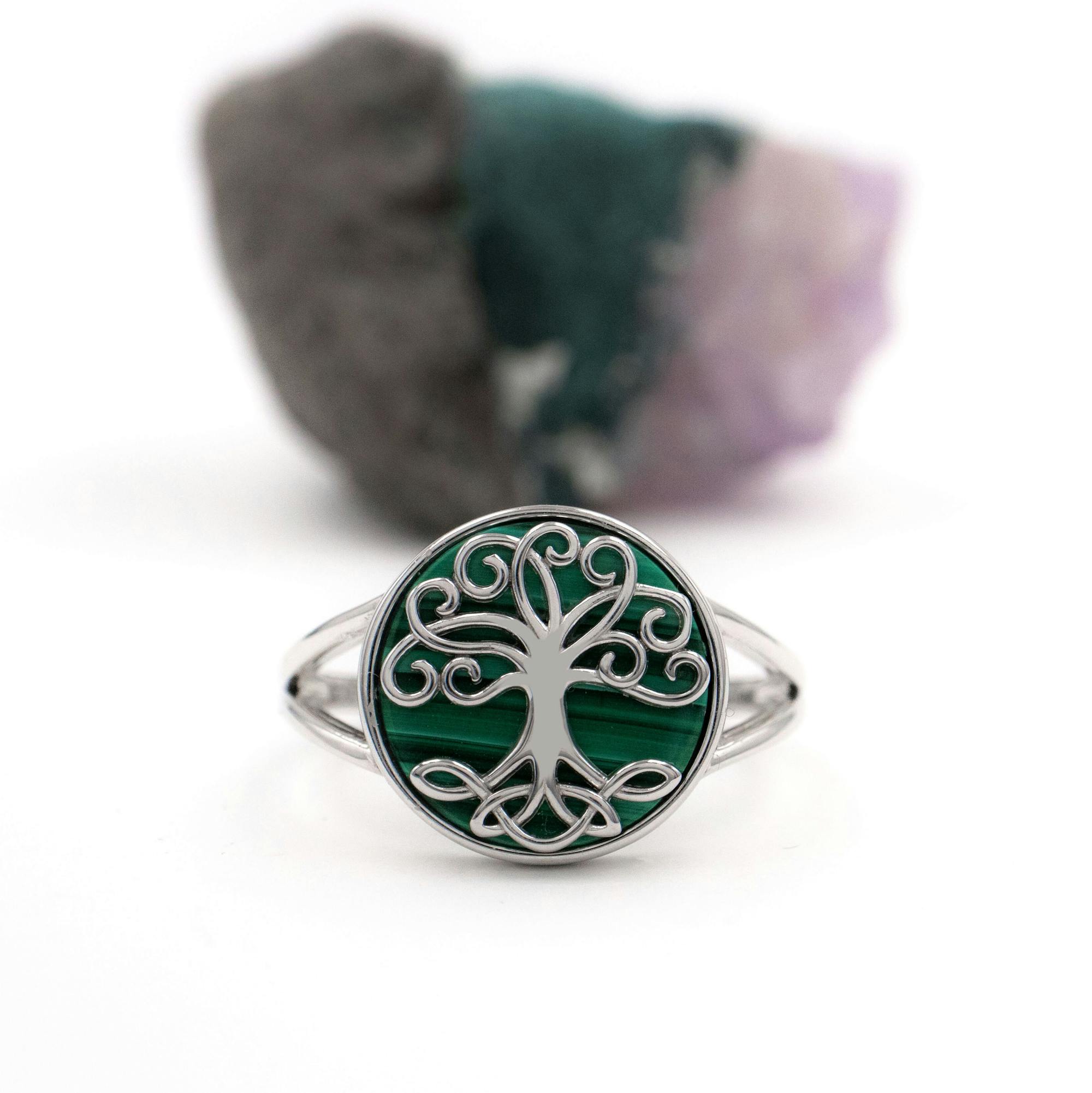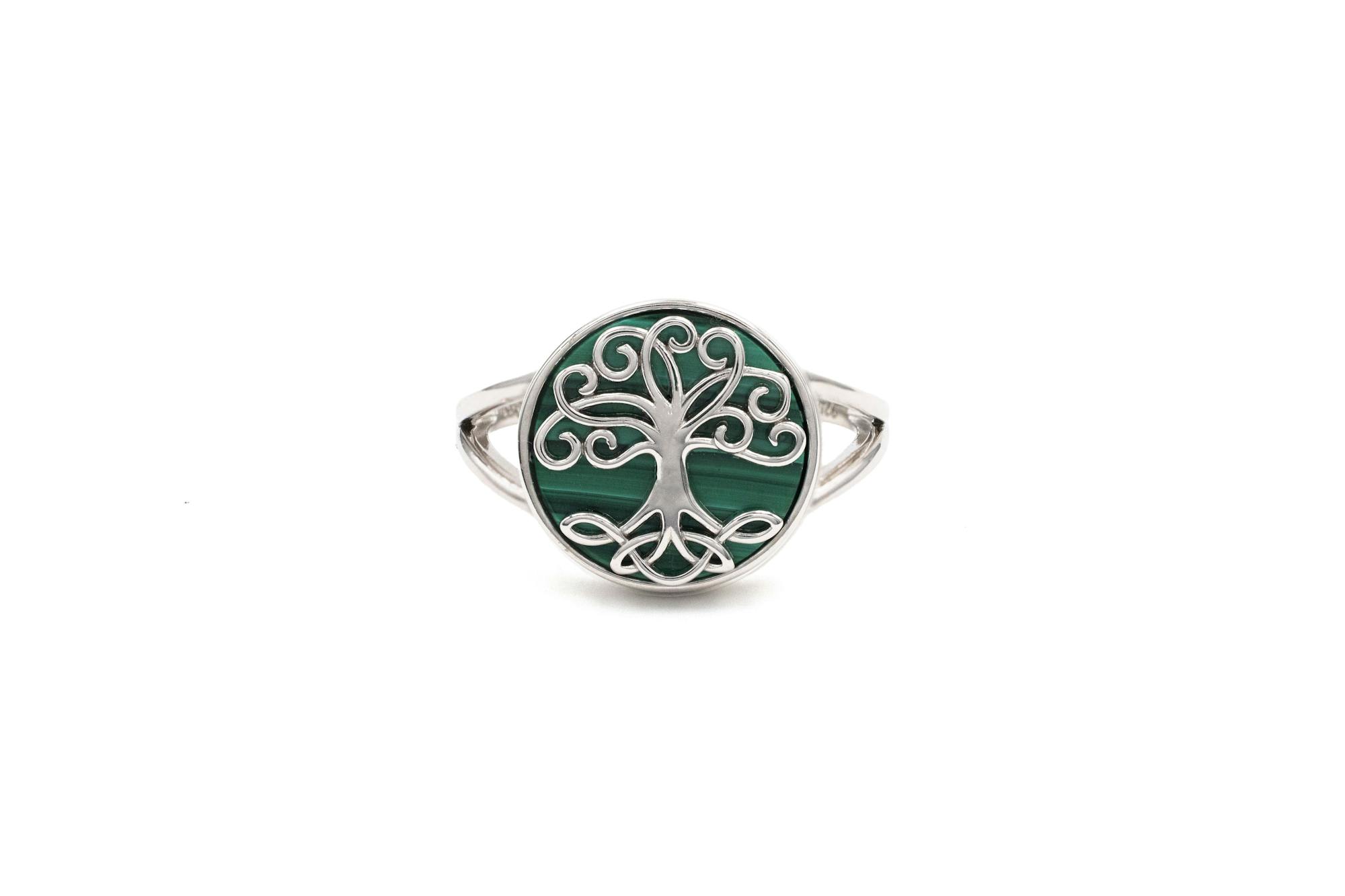 A truly magical ring, carefully crafted in solid sterling silver and featuring a silhouetted Celtic tree of life, set against the rich and vibrant green tones of malachite.