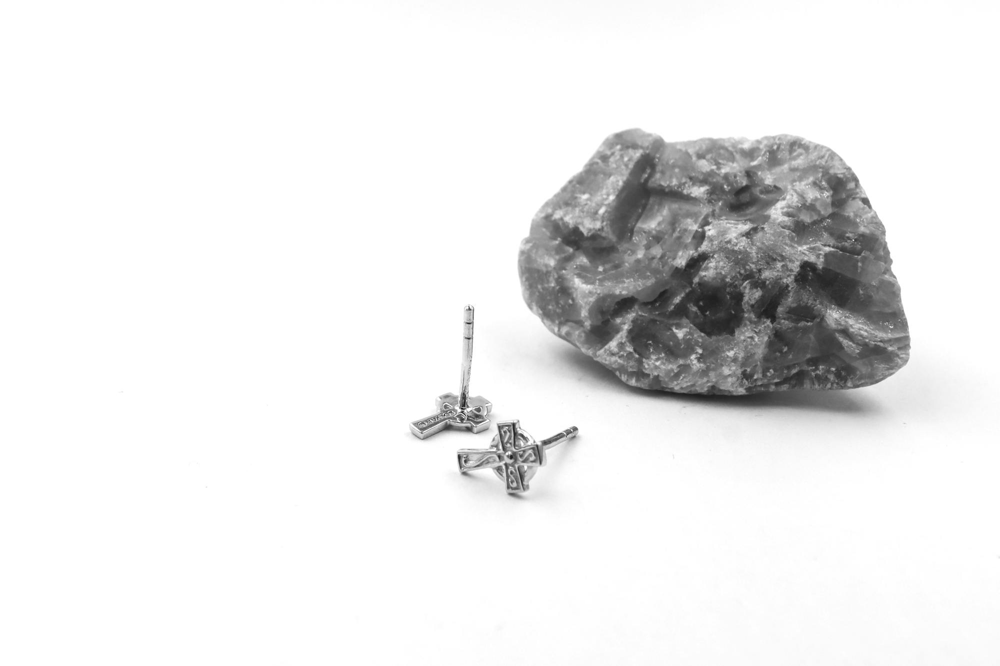 Hallmarked here in Dublin Castle, our sterling silver Celtic Cross earrings have great beauty despite their diminutive size. In each earring, elegant silver "s" waves adorn the arms and base of the cross with a polished silver halo, reflecting the rich heritage of the celts. These dainty cross earrings can be worn as a symbol of faith and a reminder of a special milestone.