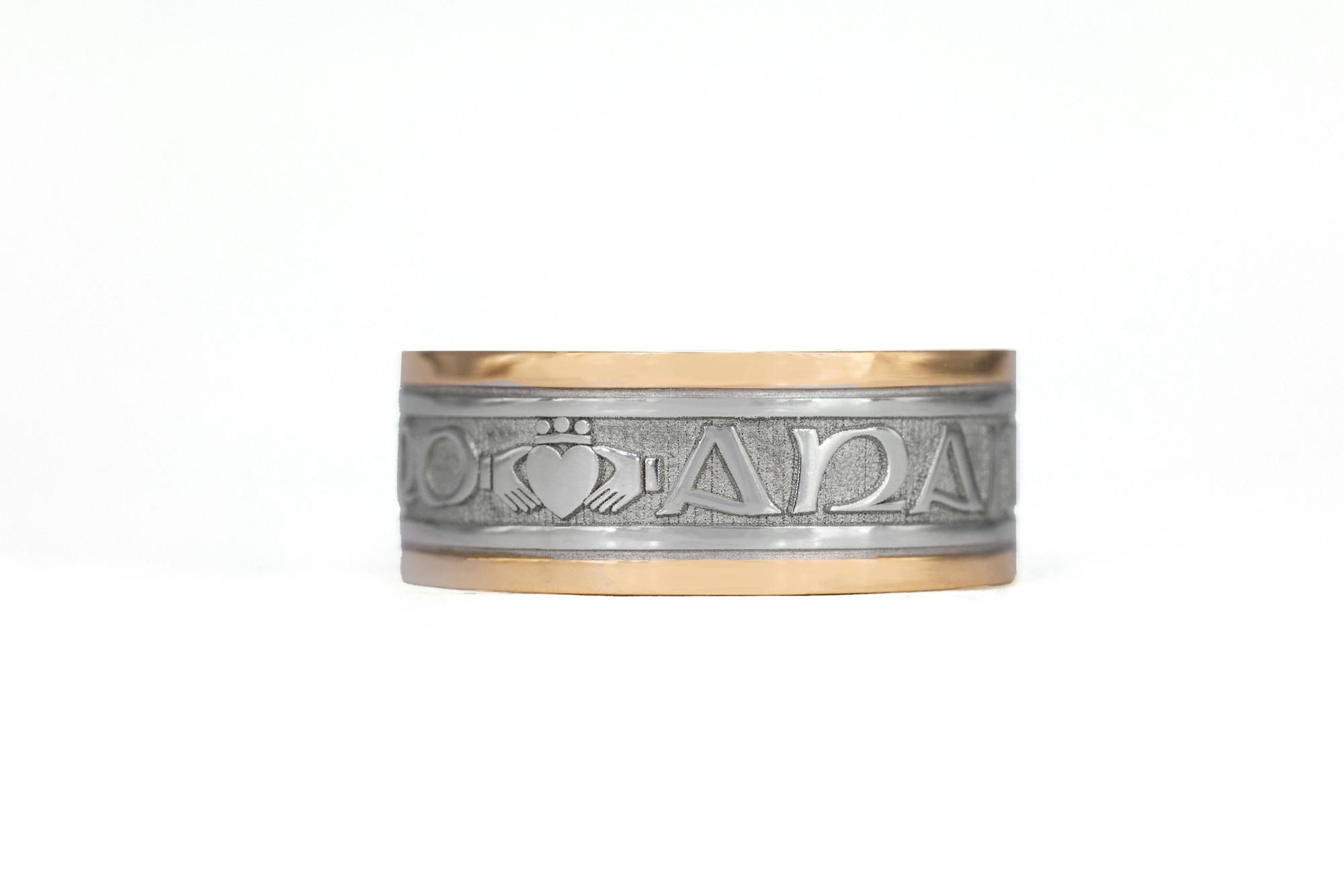 The rings feature the phrase 'Mo Anam Cara' - Gaelic for 'My Soul Mate'. In between each of the Gaelic words there is a Claddagh symbol, representing Love, Loyalty & Friendship.
