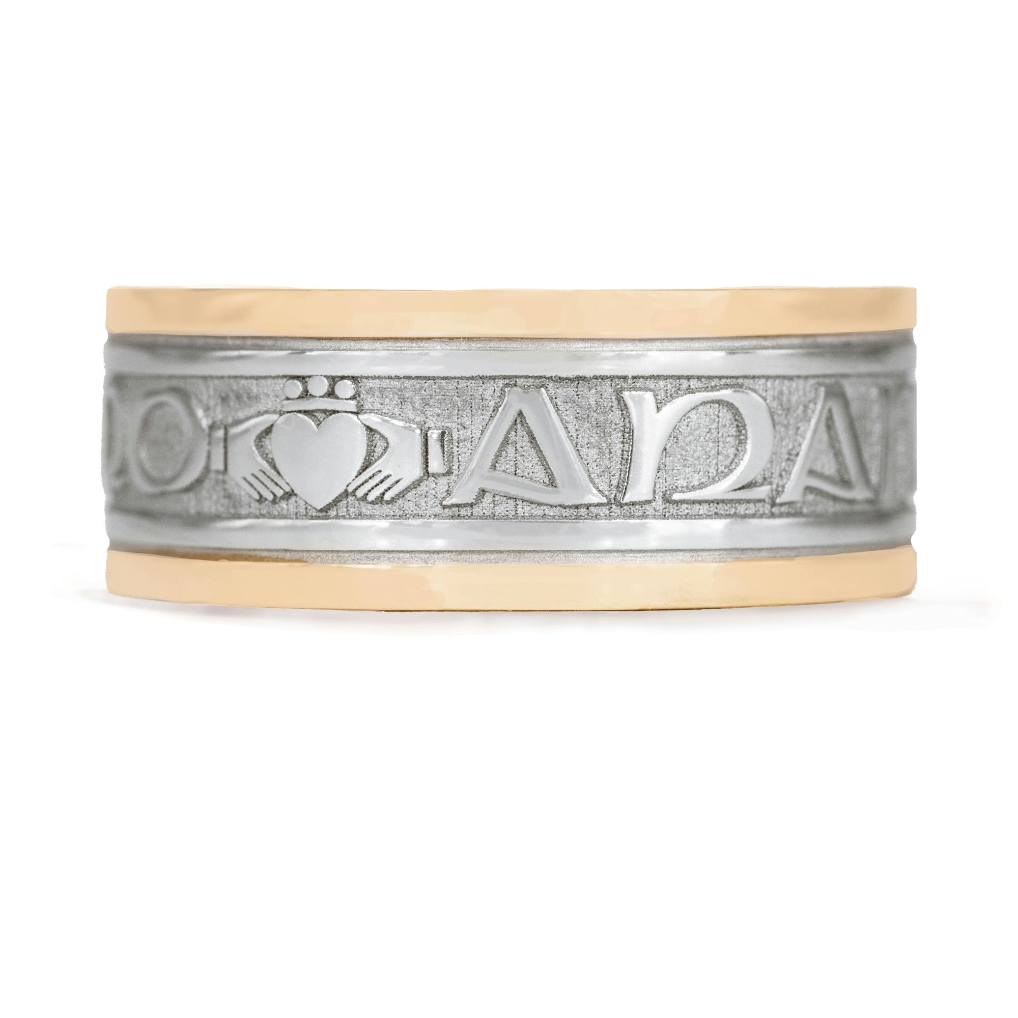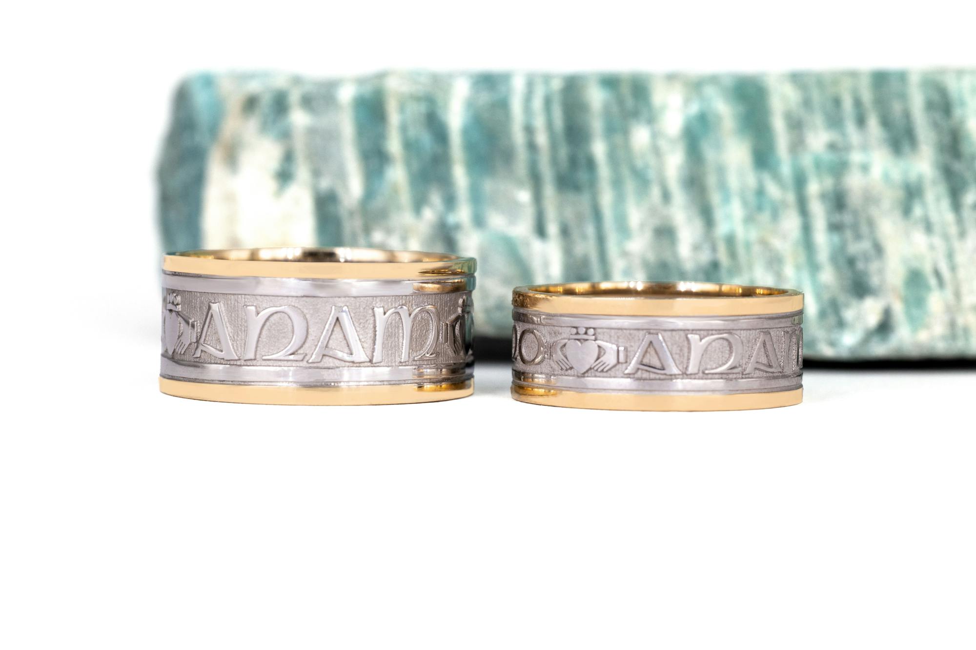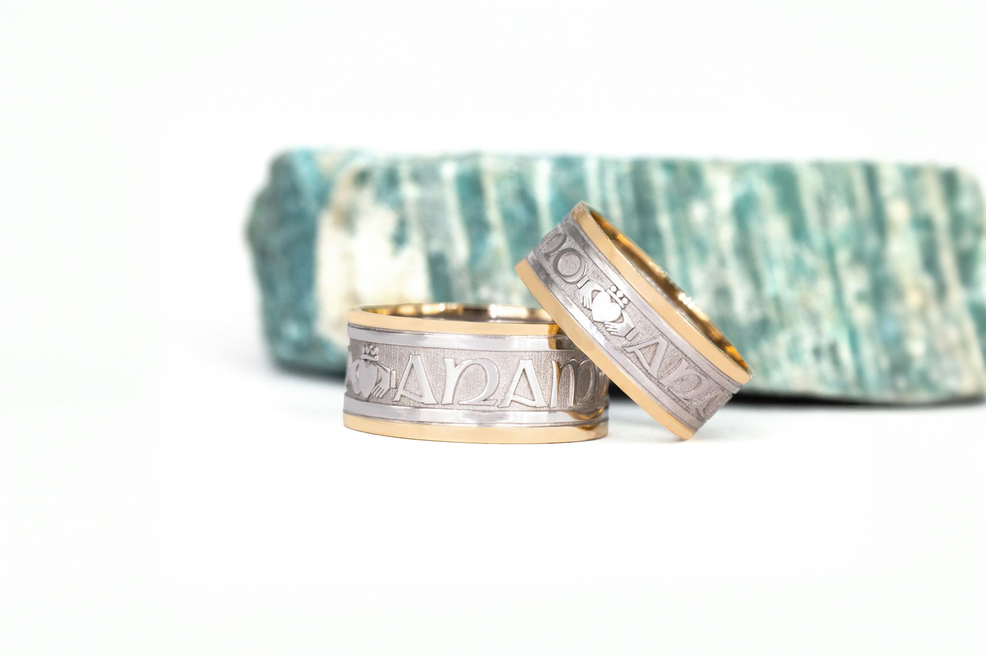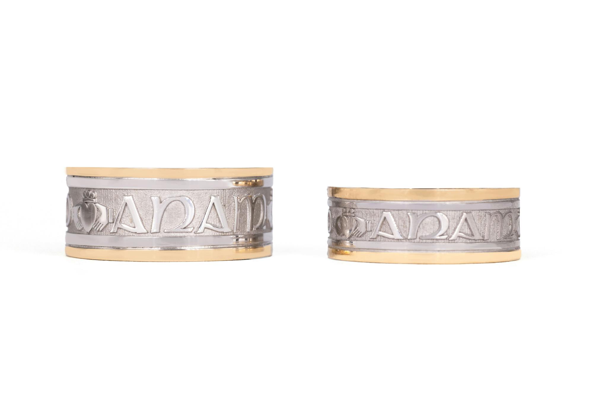 The rings feature the phrase 'Mo Anam Cara' - Gaelic for 'My Soul Mate'. In between each of the Gaelic words there is a Claddagh symbol, representing Love, Loyalty & Friendship.