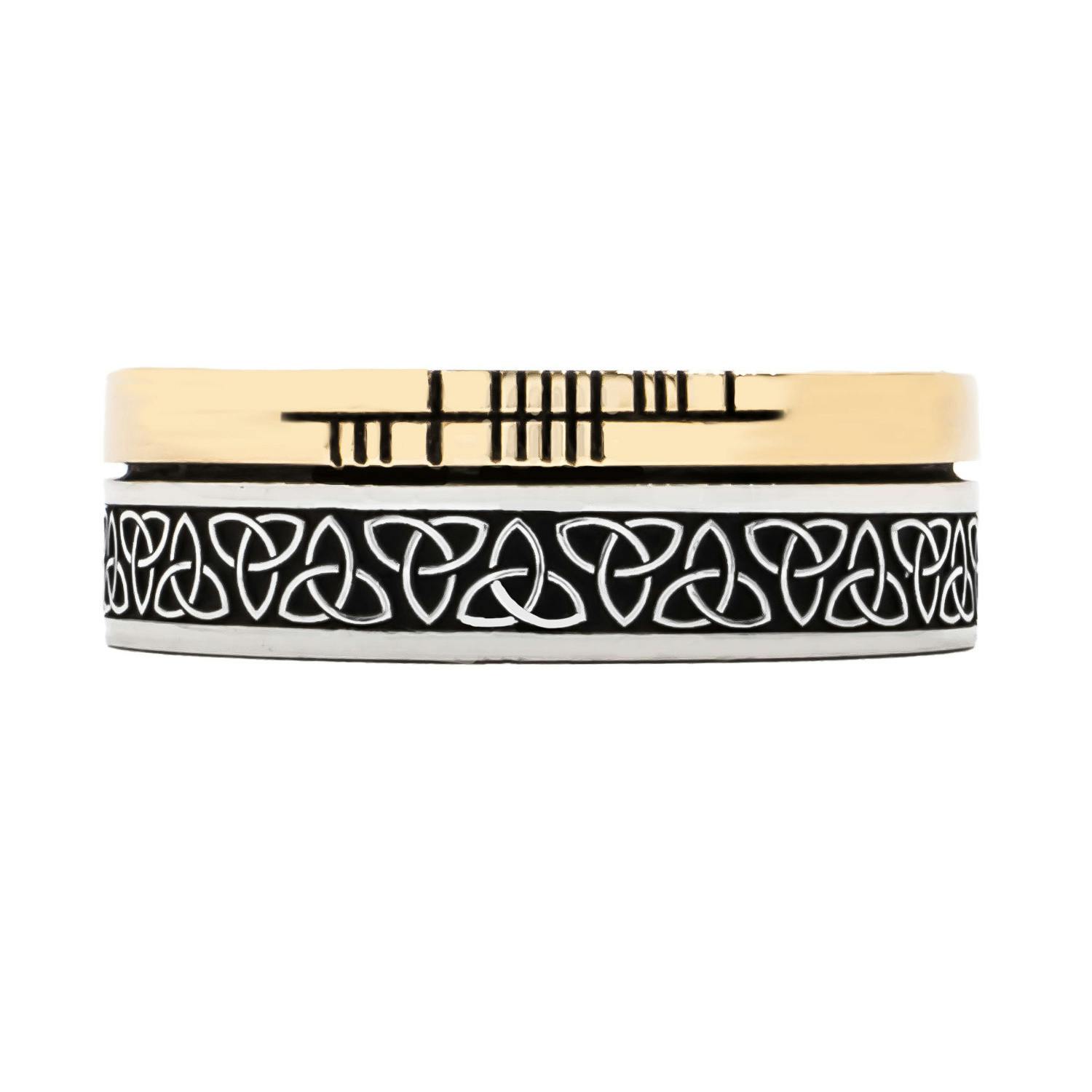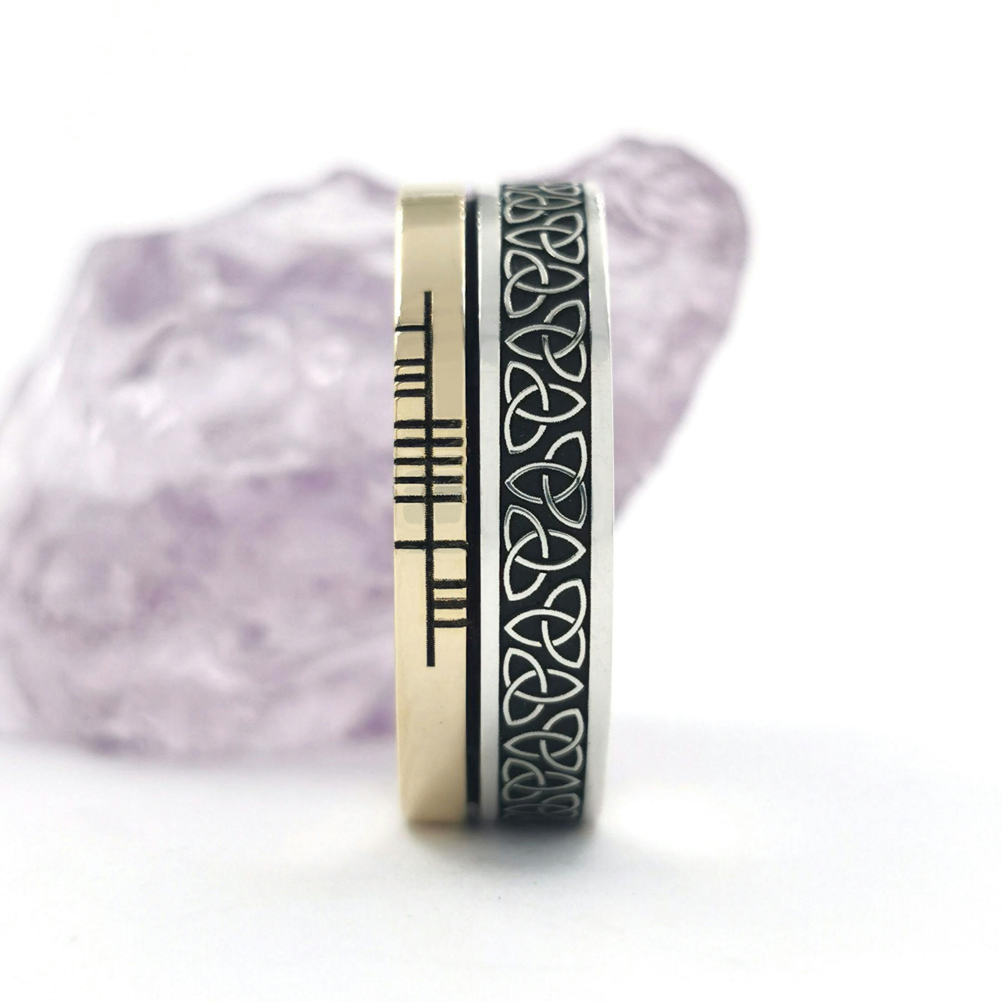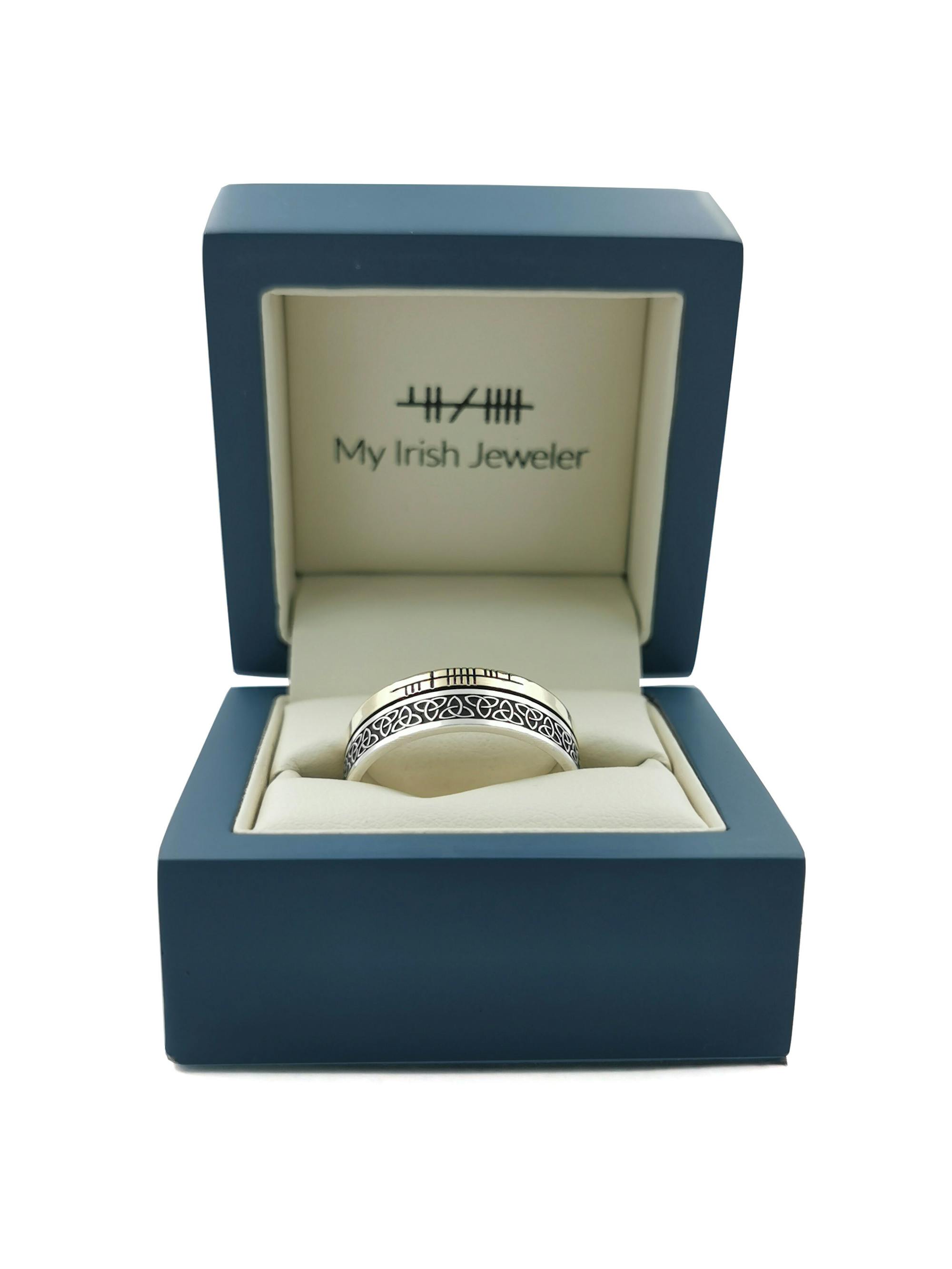 This stunning ring which incorporates both the Trinity Knot representing eternity, and the Ogham script, the alphabet of ancient Ireland. The ring is expertly made, crafted to the highest standard and has a beautiful weight and feel to it. The perfect unisex ring, ideal for couples looking for matching bands.