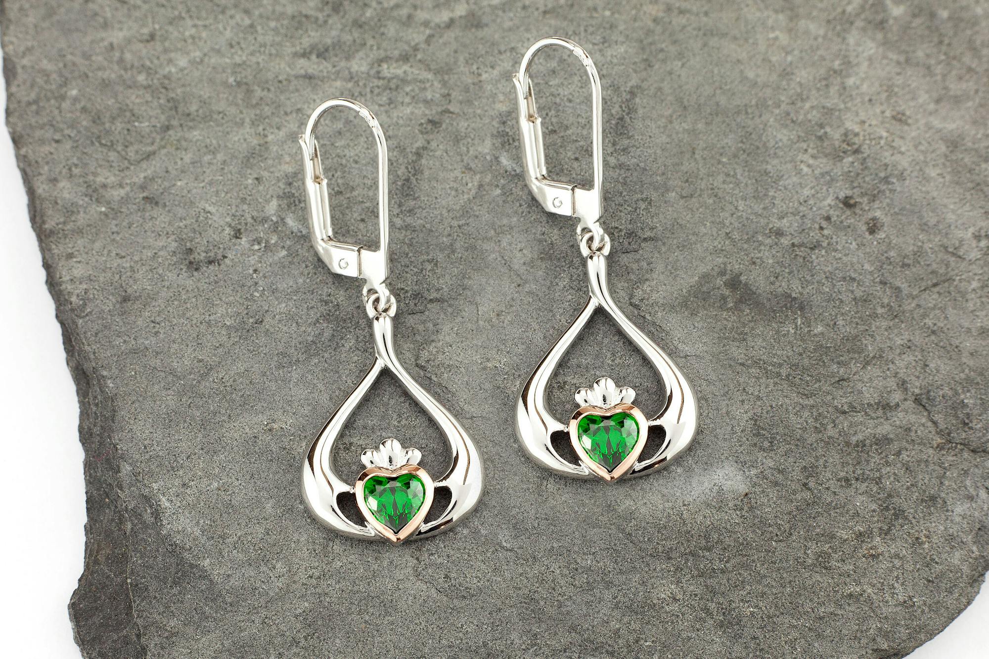 Irish materials, craft, and design come together with stunning results in this Sterling Silver & 10k Irish Rose Gold Claddagh Gift Set. The iconic Claddagh symbol representing love, loyalty and friendship has been rendered in an elegant teardrop shape made of fine sterling silver and Irish rose gold sourced from the hills of Co. Tyrone. A vibrant green cubic zirconia sits at the heart of the Claddagh in a rub-over setting and contrasts beautifully with the warmth of the 10k Irish Rose Gold.
