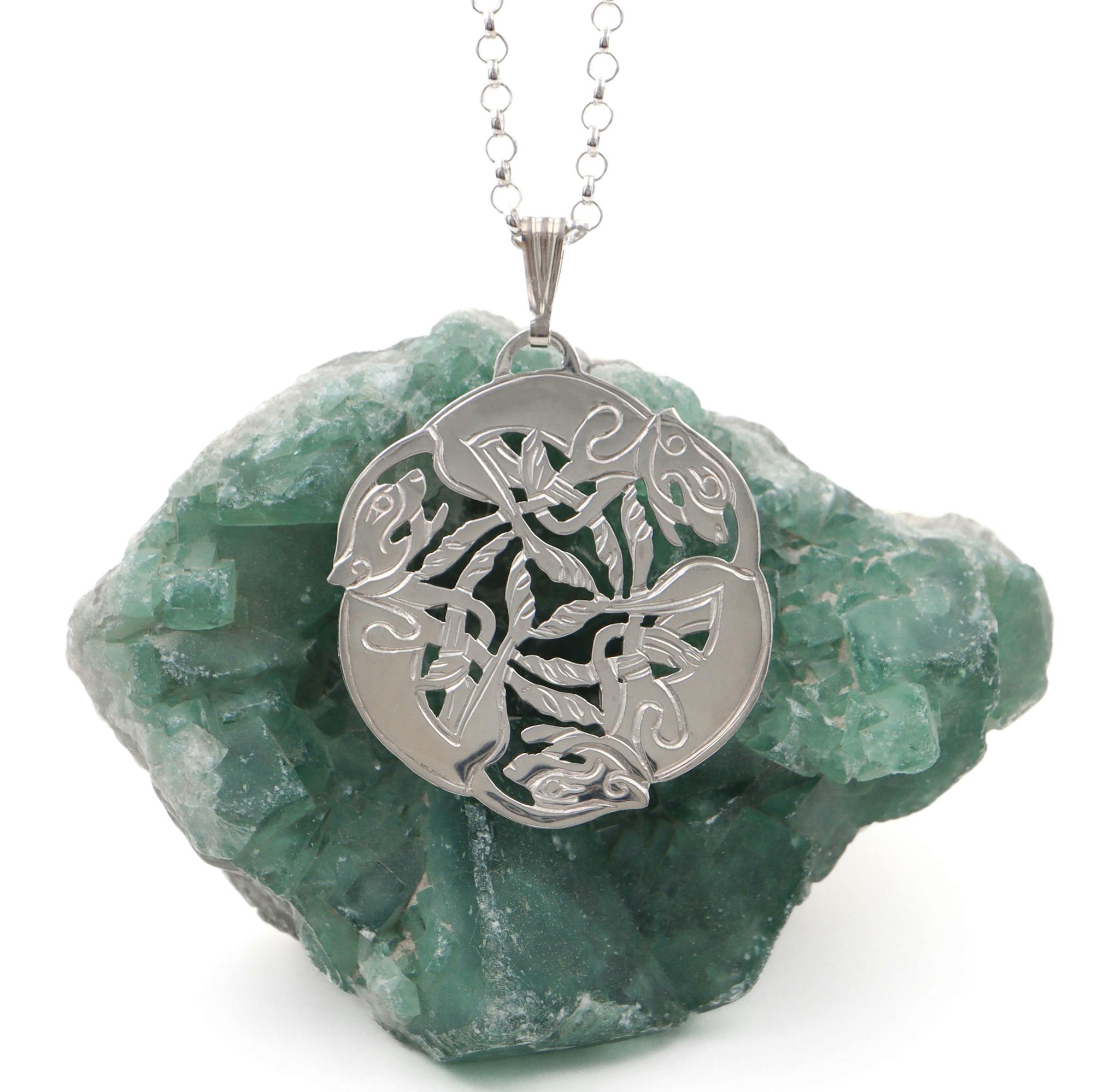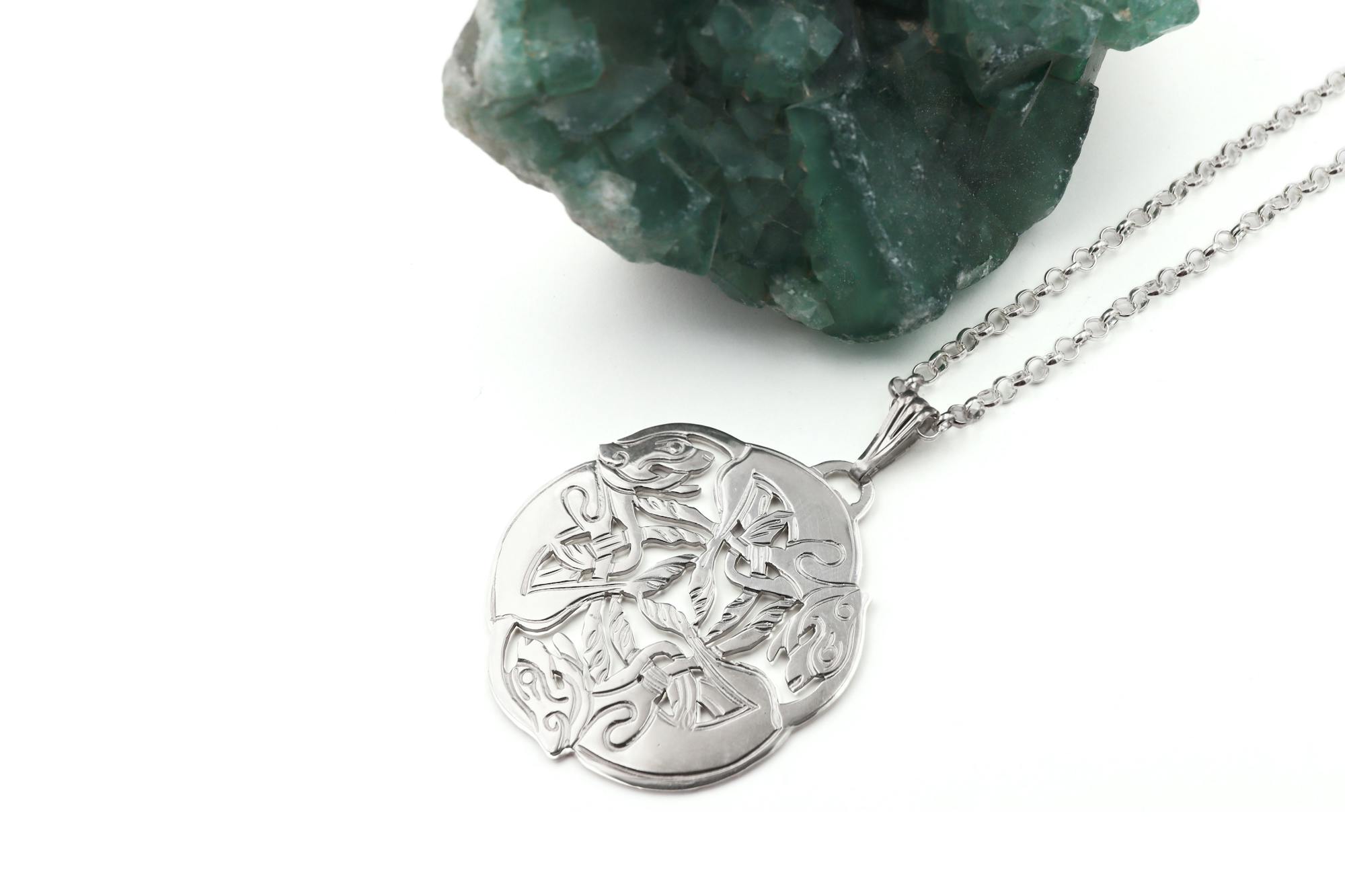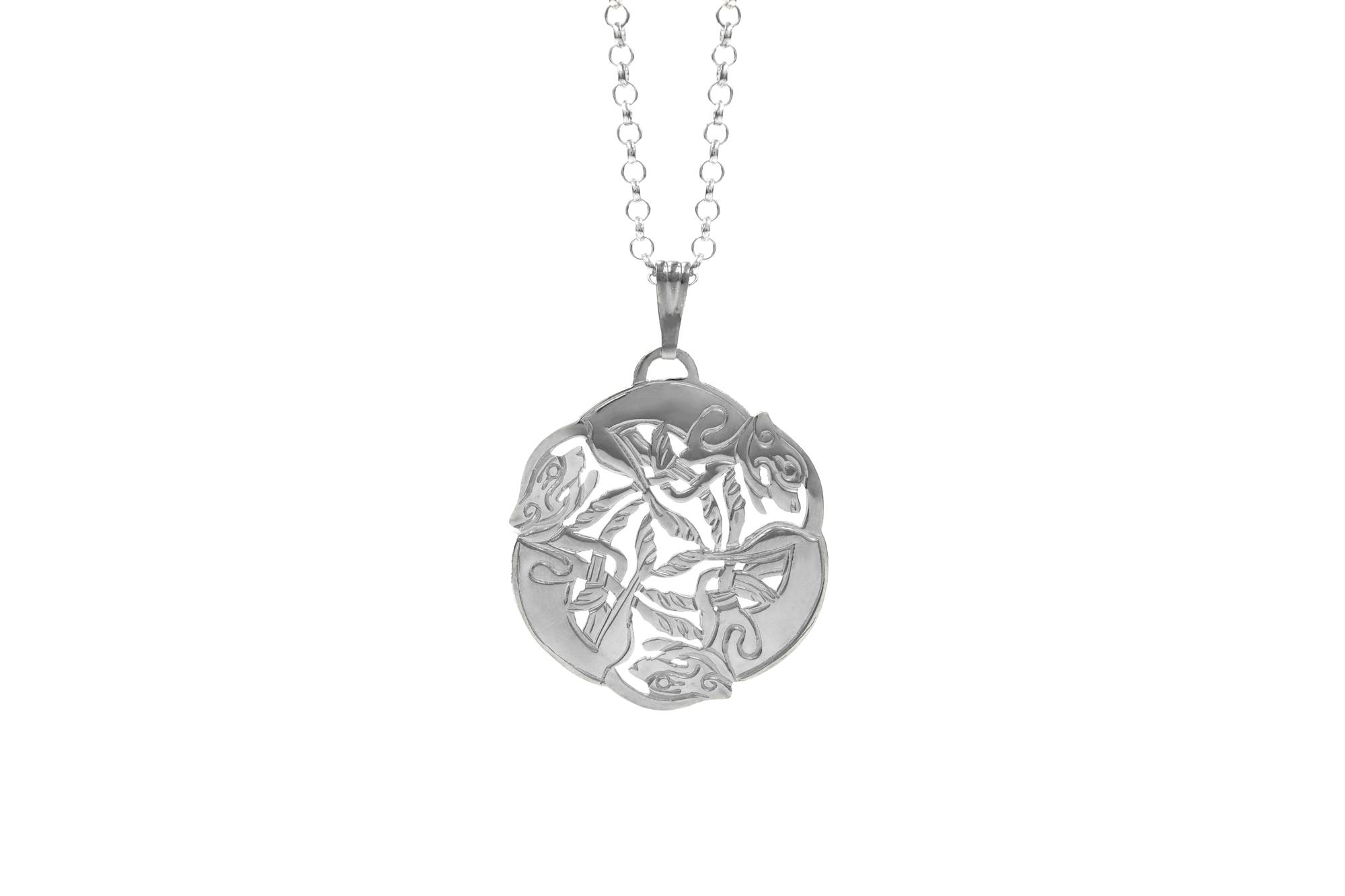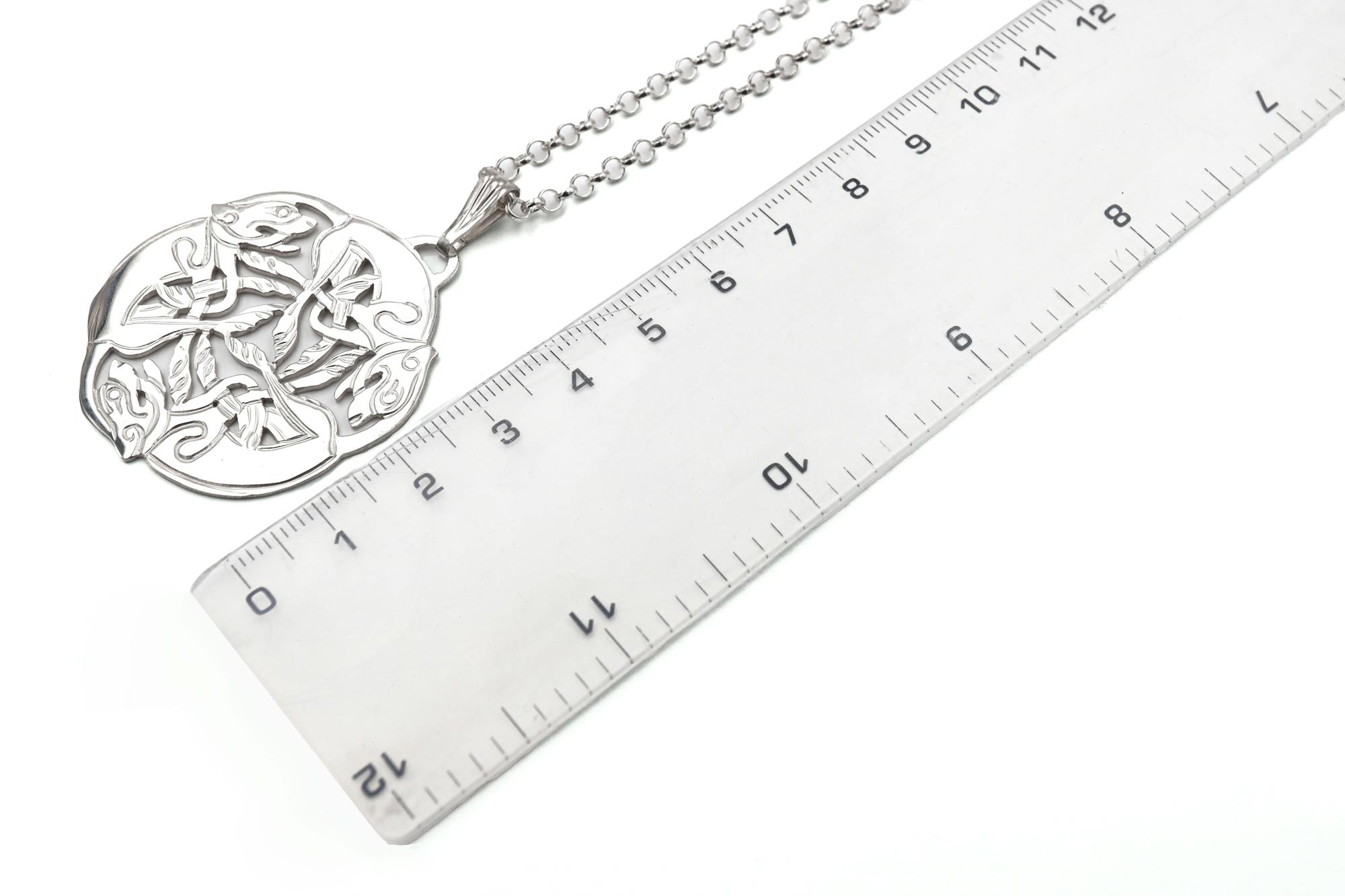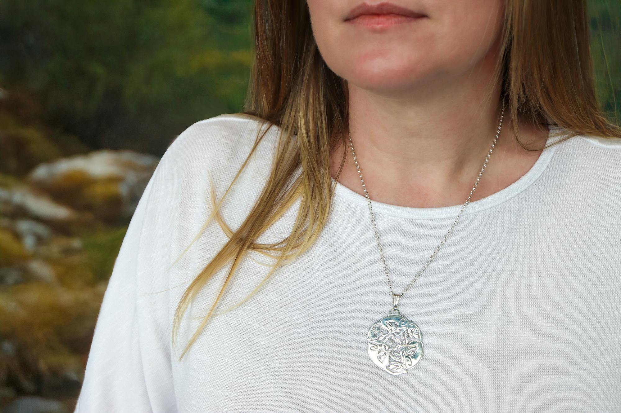 This Sterling Silver necklace is called the celtic 3 dog. On closer inspection you can make out the splendid detail of the 3 dogs as well as the fine Celtic engraving. Beautifully made with a top quality finish. The necklace has a very nice shape and sits perfectly on the neckline. The larger necklace is suitable for the person who loves to wear statement pieces.