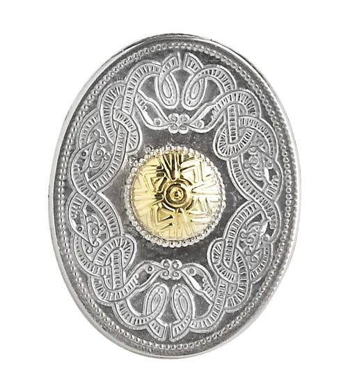 The center of the tie-tack is inlaid with an 18K gold shield and the surrounding metal is crafted in sterling silver. The contrast and fusion of metals work beautifully together.