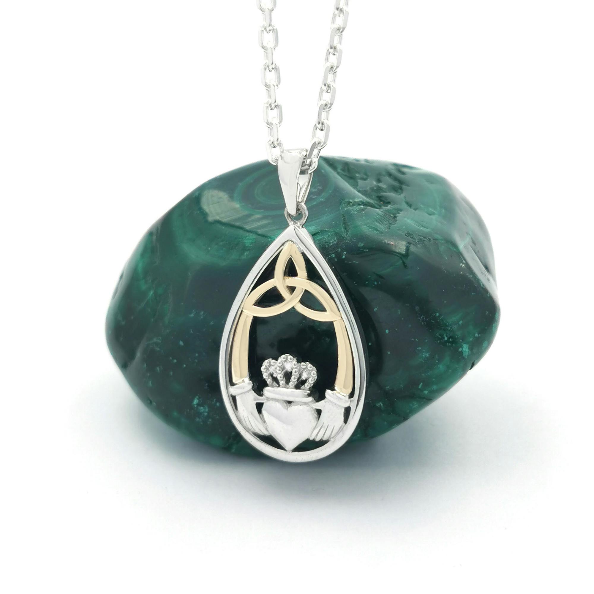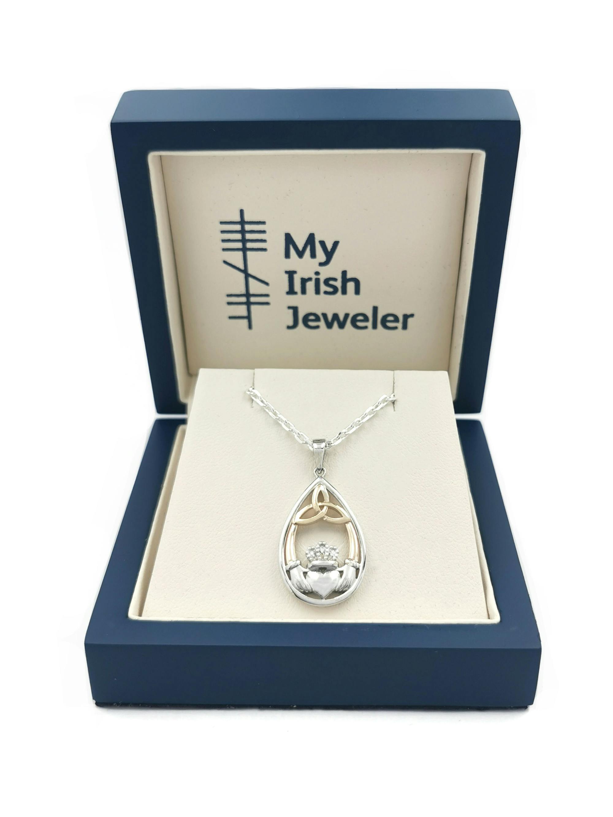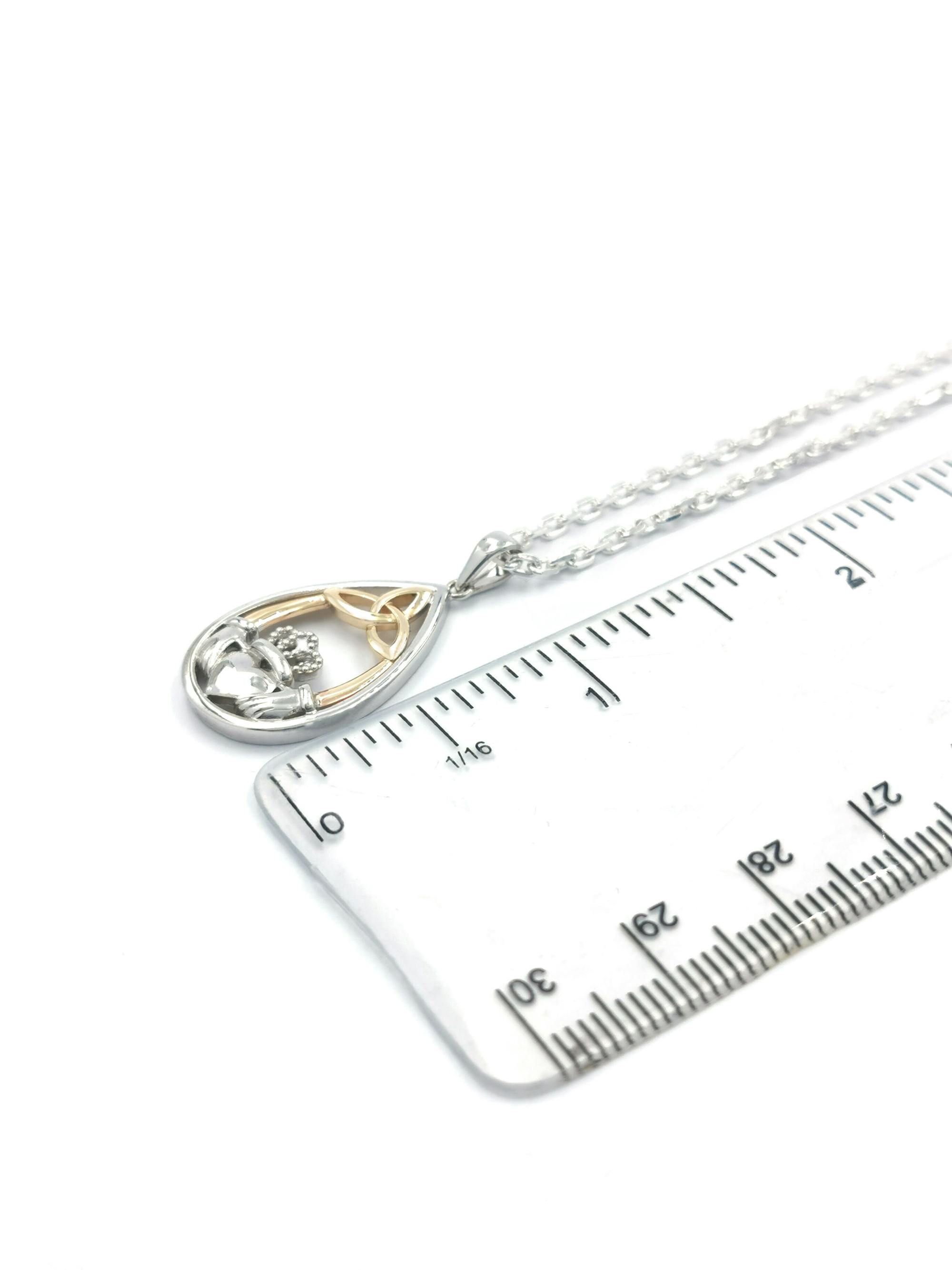 The cool tones of the polished fine sterling silver and the warmth of the 10K gold beautifully contrast and compliment each other. Representing eternity, the gold Trinity Knot extends down to meet the hands, heart and crown of the iconic Claddagh symbol crafted in sterling silver. This ionic Irish symbol of love loyalty and friendship has a subtle touch of sparkle with three micro pave diamonds discreetly set in the open and airy crown.