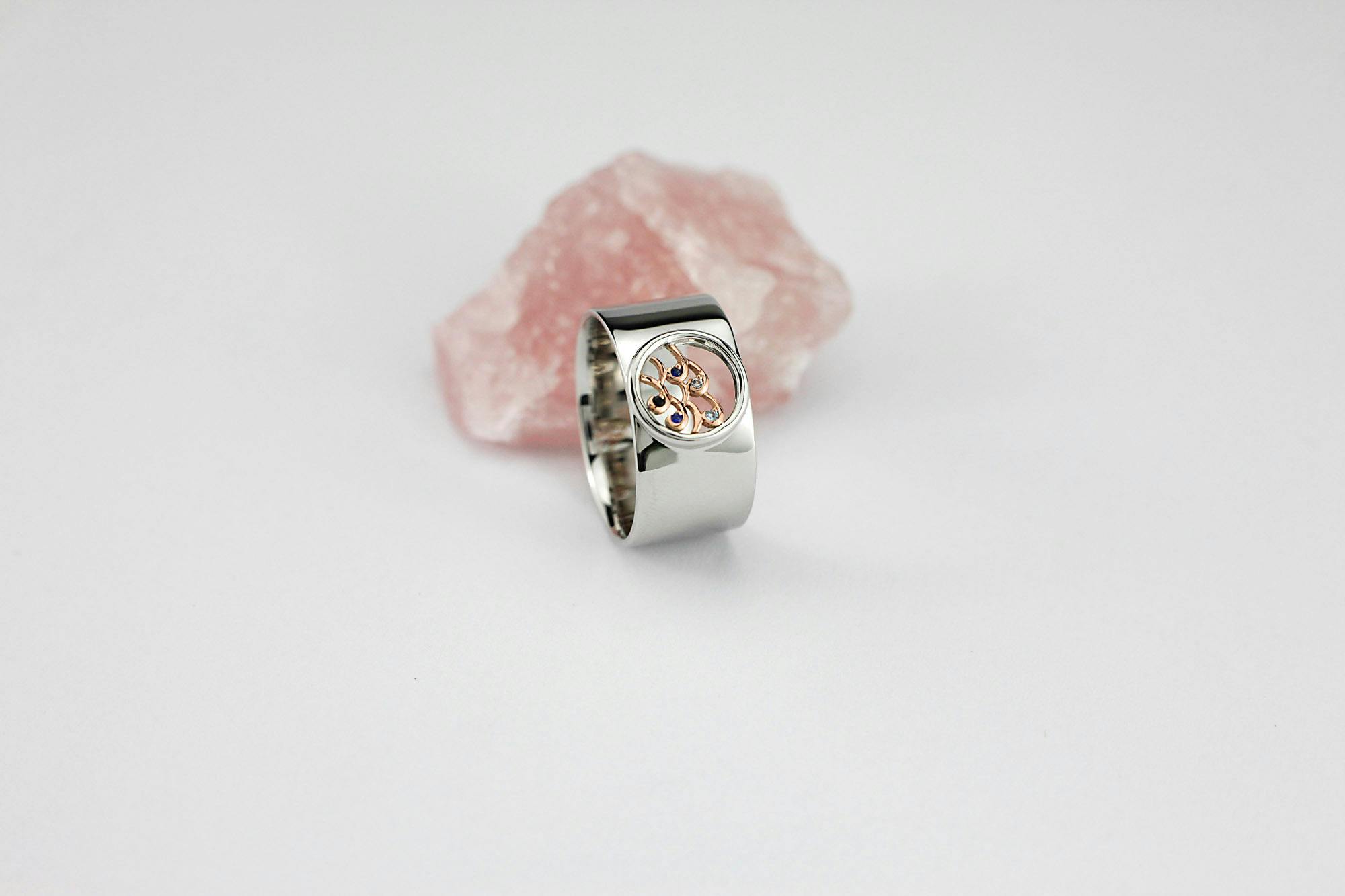 The ring is 10mm wide which accentuates the wonderful design. The inner circular frame forms the impression of waves studded with sapphires and topaz stones. The waves are crafted in 10k Irish rose sourced from here in Ireland, from a mine in Co. Tyrone.