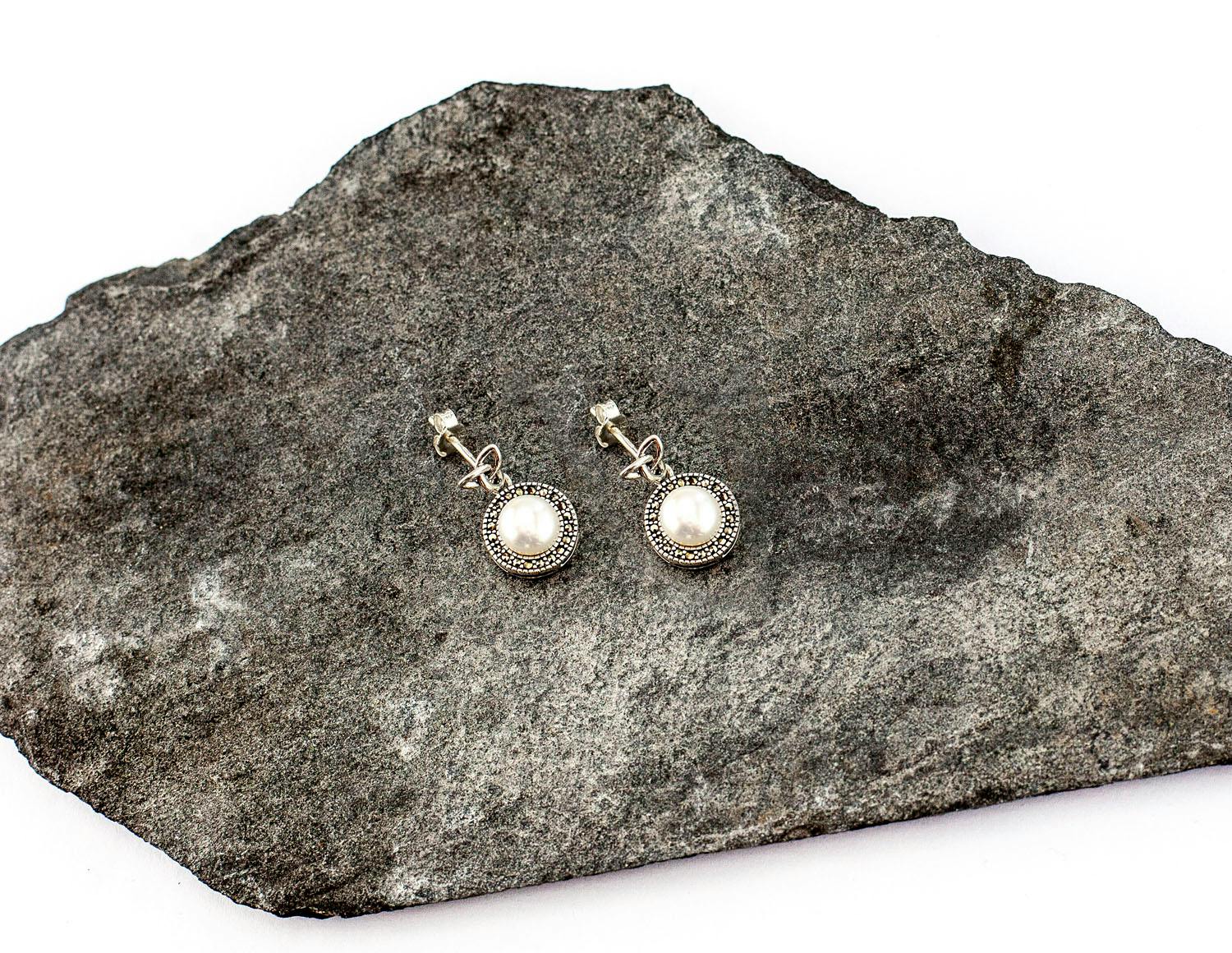 Sterling silver trinity knot earring. A fresh water pearl is cradled in the center surrounded by glistening marcasite stones. A tiny delicate trinity knot emblem is attached to the top of the circle. In modern times the trinity knot has been associated with eternity as the knots have no real beginning or ending. The knots have soft graceful curves and fine delicate tips.
