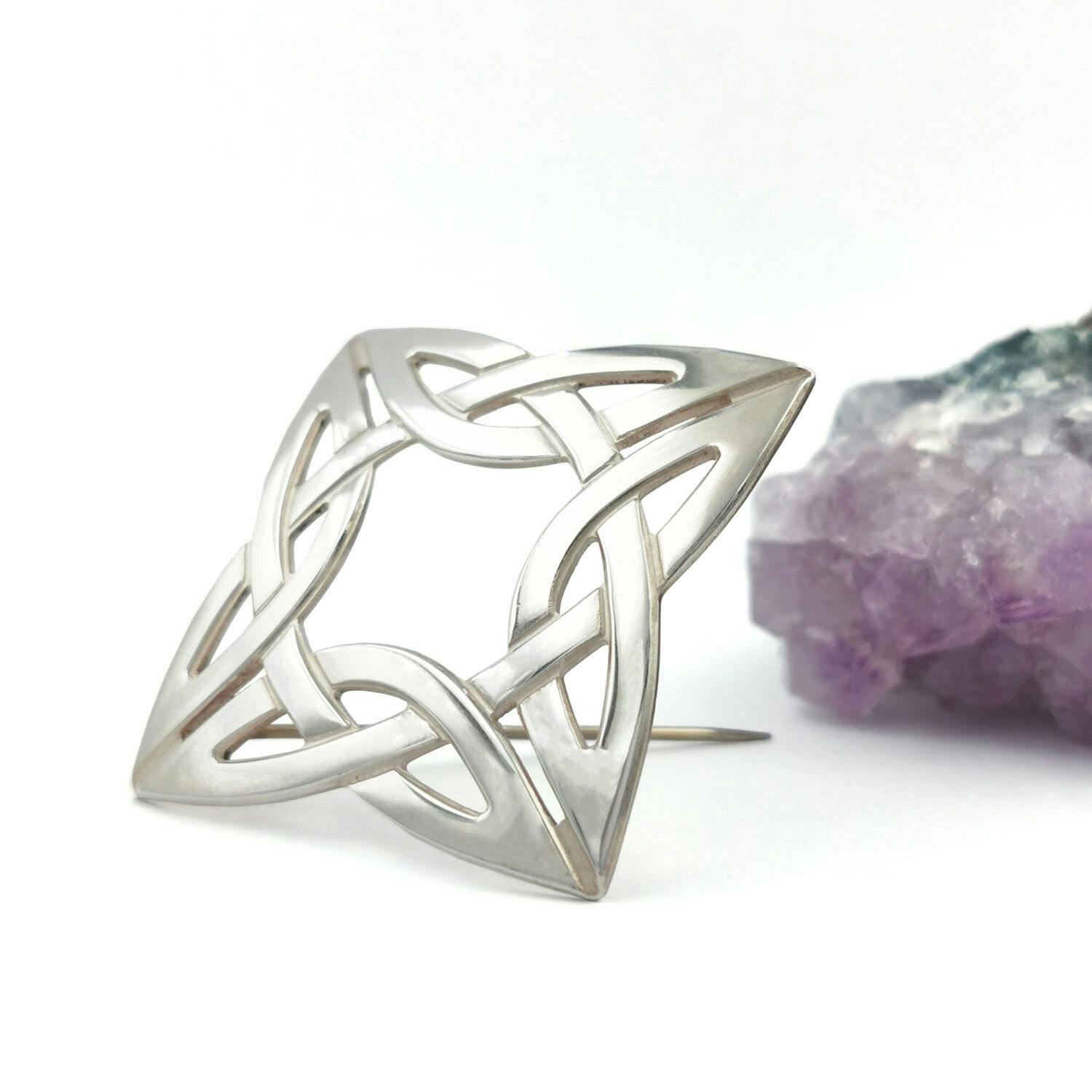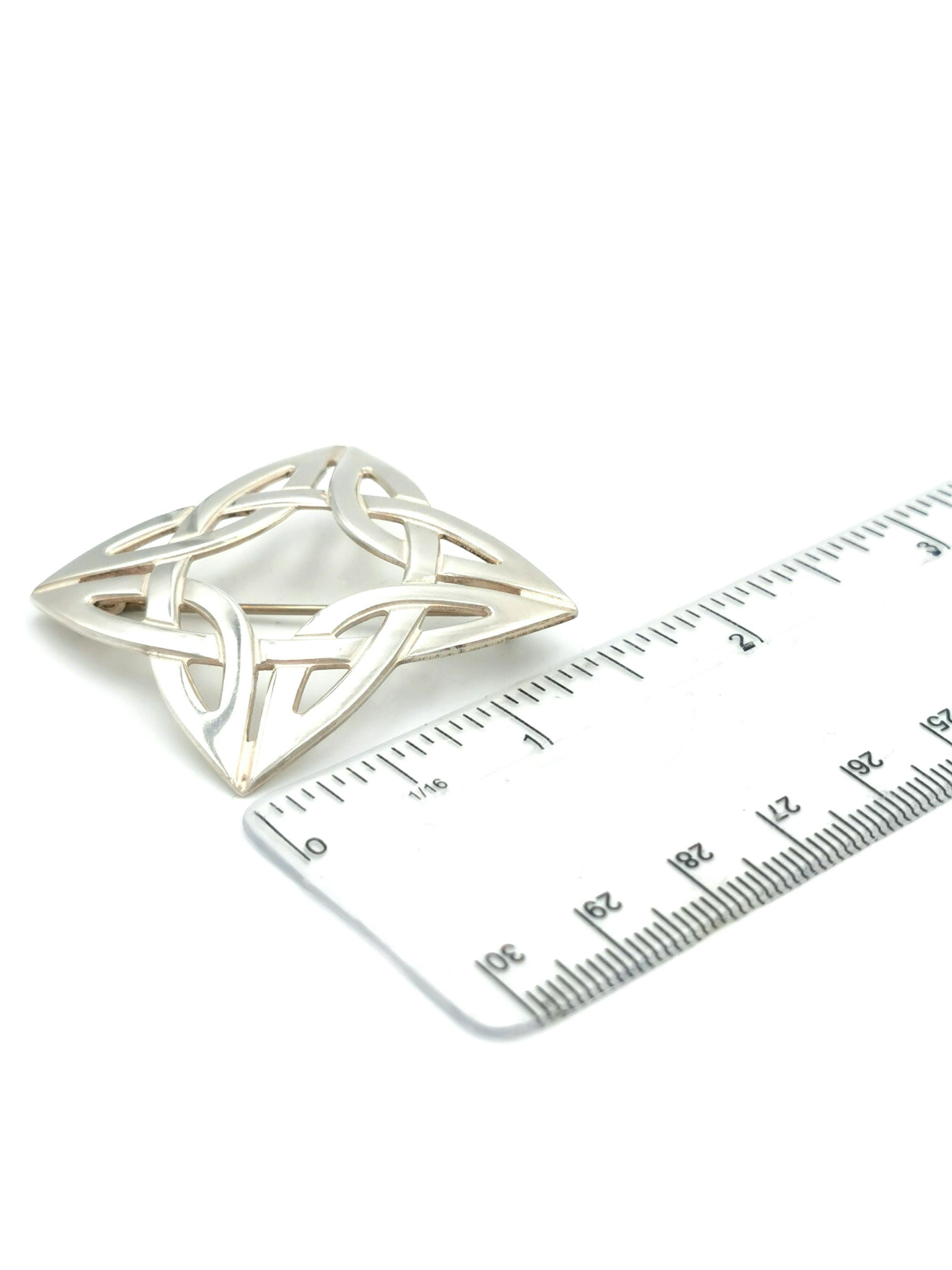 This striking and substantial brooch features four pierced interwoven Celtic Knots with no beginning or end. Representing eternity to many, these ornate Celtic knots can be found adorning the impressive ancient stone crosses still standing at Glendalough.