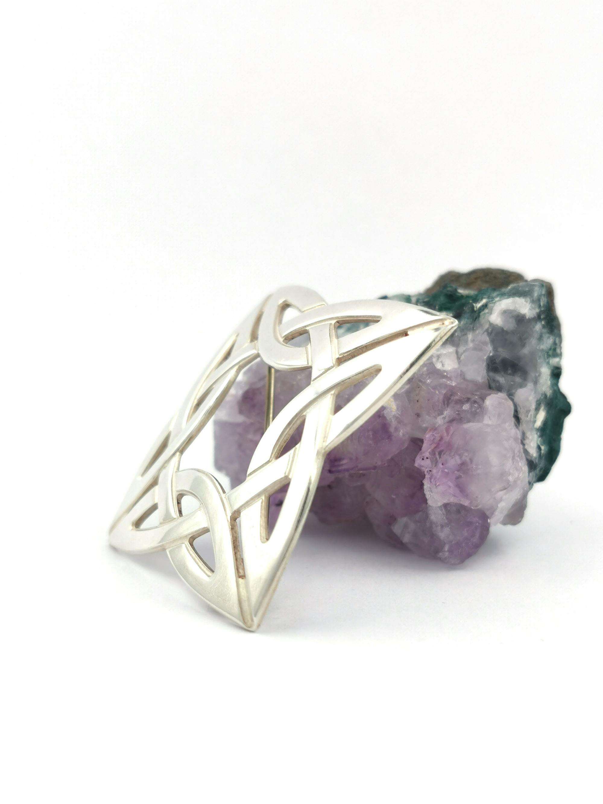 The design of this eye catching brooch was inspired by Aidan's 100 km bike ride to Glendalough in County Wicklow. With its spectacular Monastic ruins, round tower and intricately carved Celtic Crosses, Glendalough is one of the most popular tourist destinations in Ireland. Drawing inspiration from the intricate and ancient stone carved knot work of Glendalough, Aidan crafted this design in substantial sterling silver. And it has been hallmarked here in Ireland at historic Dublin Castle attesting to the pieces value and quality.
