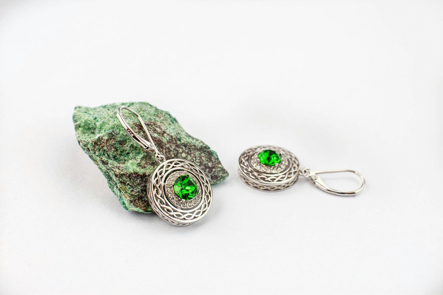 Sterling silver green Swarovski celtic necklace. A delightful halo of white czs surrounds the green Swarovski stone creating an abundance of bling. A celtic interlace ribbon pattern sweeps around the outer circle adding an ultra feminine look.