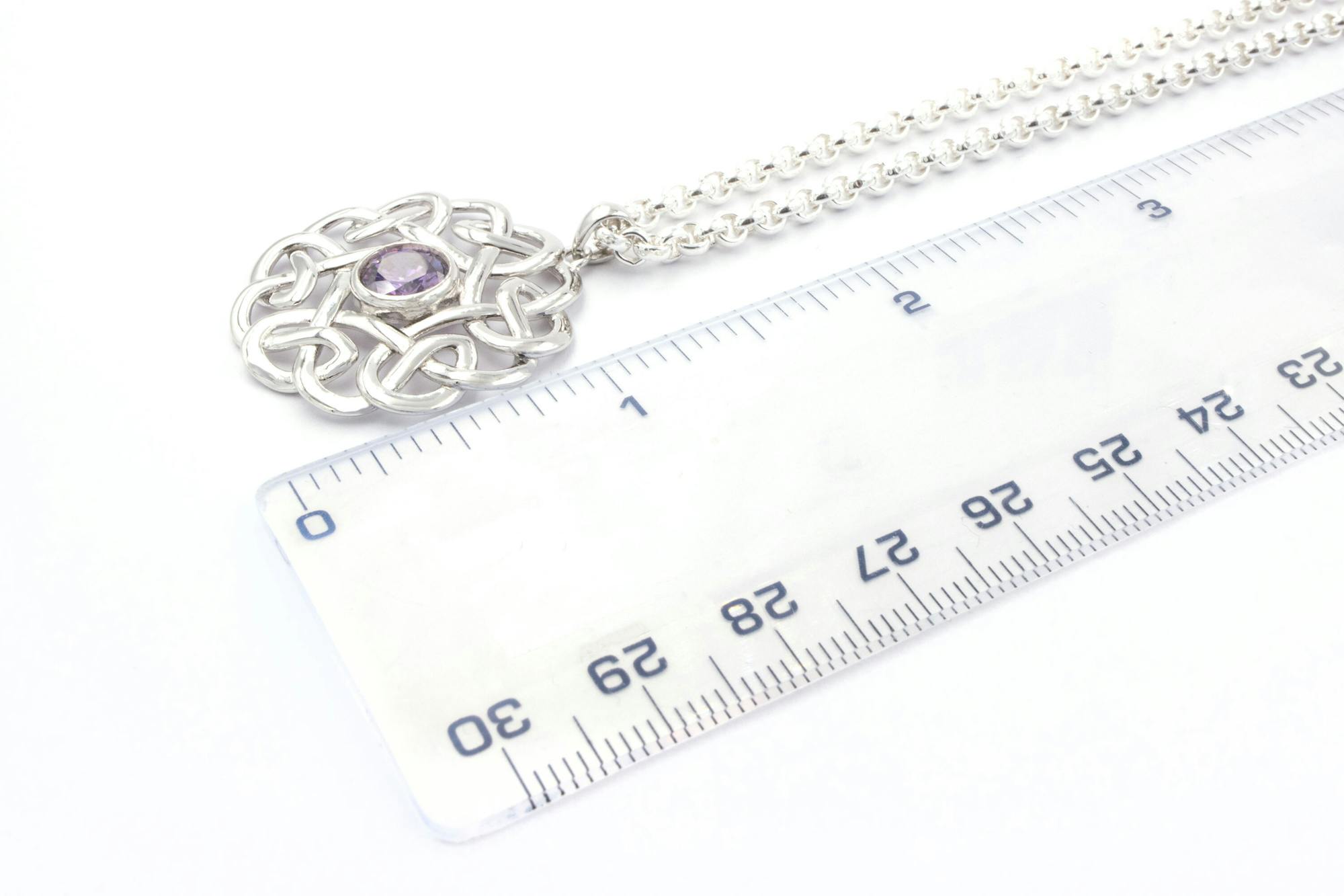 The contrast between the fine sterling silver and the delicate purple sparkle of the CZ is delightful. Measuring 1.1" wide and 1.3" high with the bale, this piece adds a touch of Celtic flair to any outfit and could be worn on a shorter chain or longer chain to suit your taste.