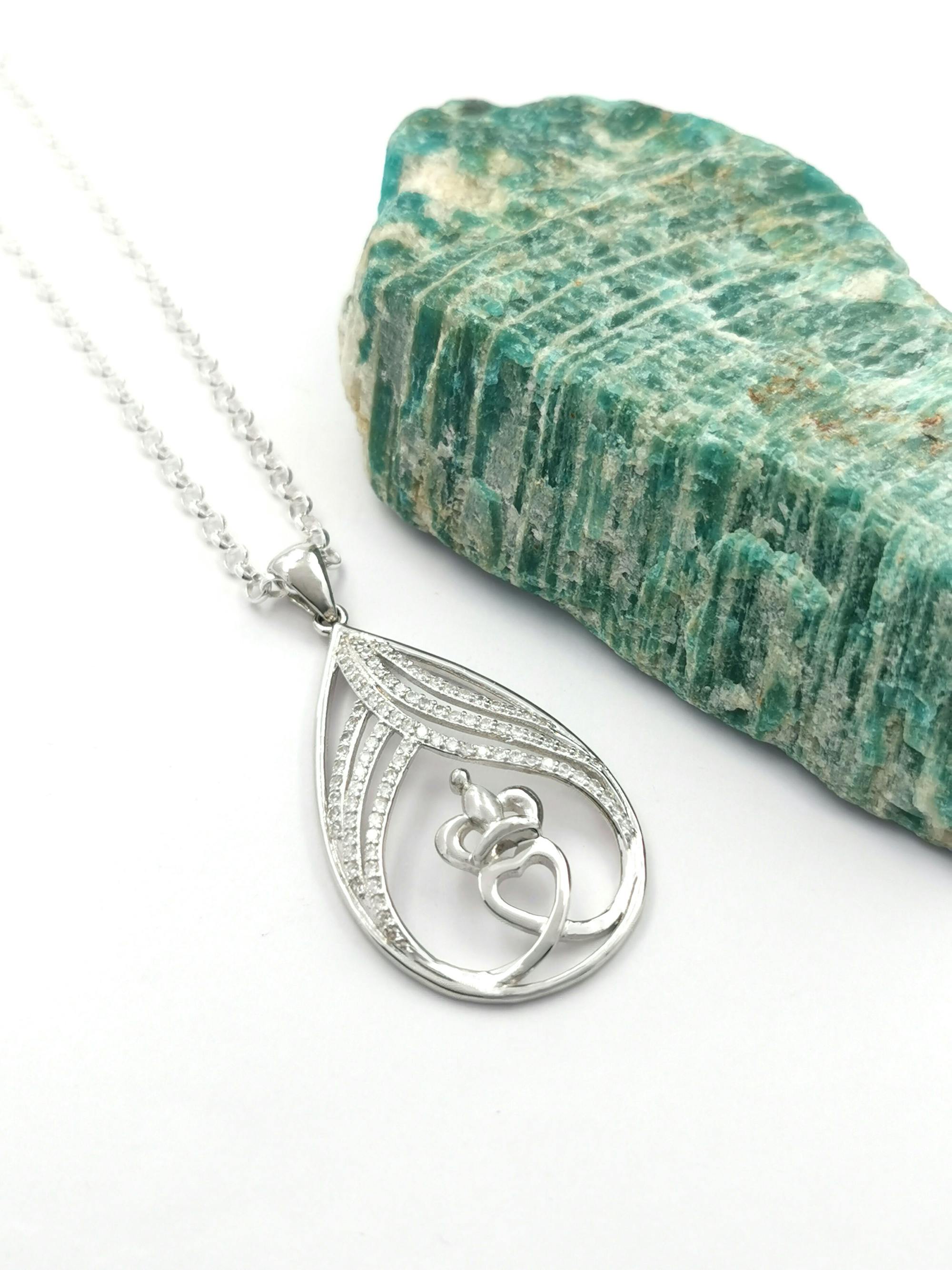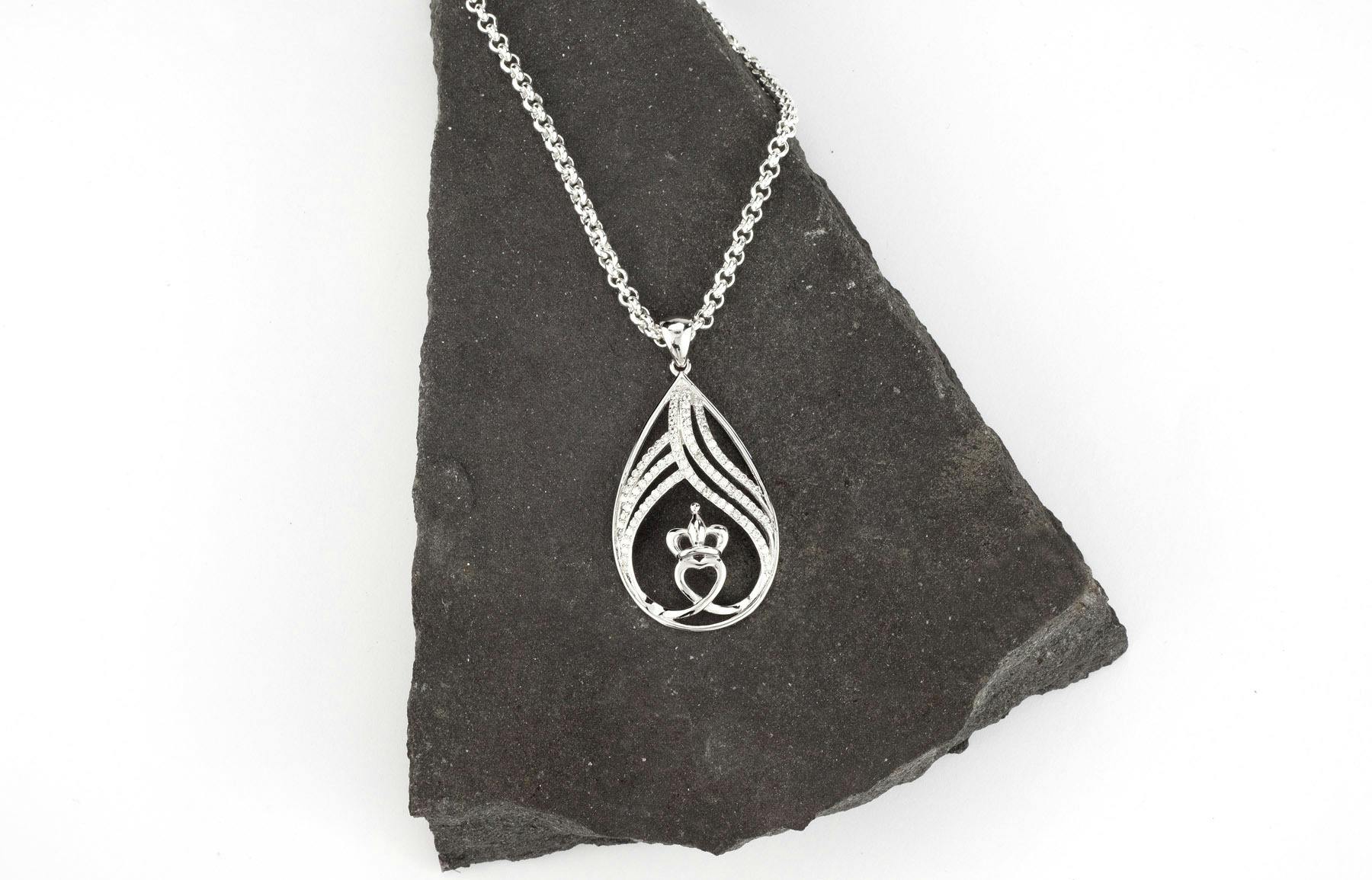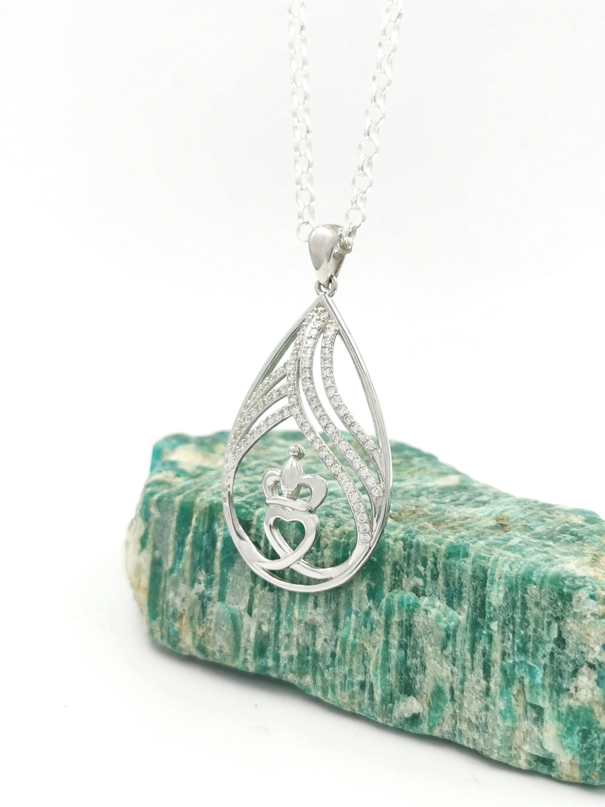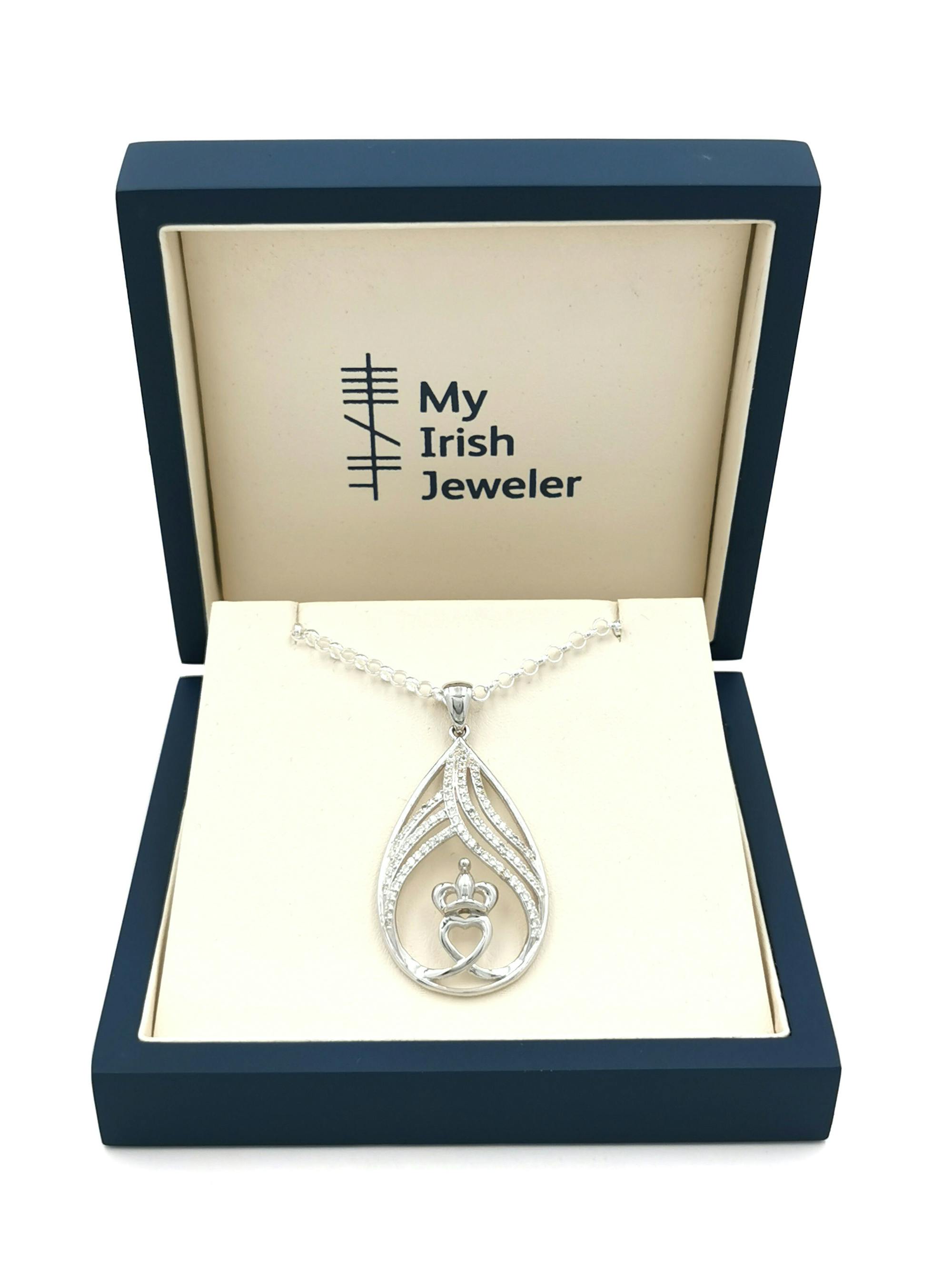 This sterling silver Claddagh necklace is ideal for the lady who loves to sparkle! Dazzling white cz stones are set in abundance in this magnificent tear drop shape necklace. The iconic claddagh symbol has a modern and contemporary look. Super stylish and elegant. An ideal choice for the person who likes to wear larger pieces of jewelry.