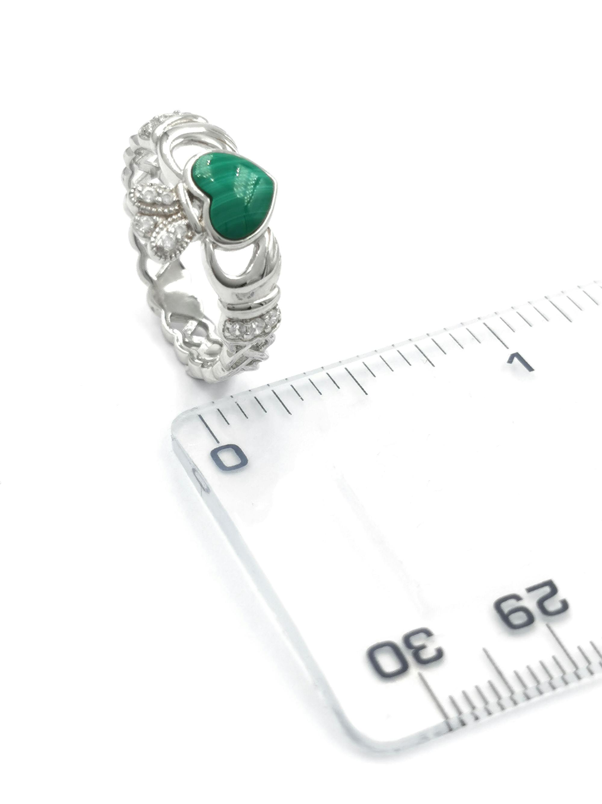 Sterling silver claddagh ring set with Malachite. The bulbous domed shaped heart has streaking shades of green adding a marvelous pop of color. No two pieces of Malachite are the same, the shade of green will vary from pale green to dark green with varying directions of the stripes.
