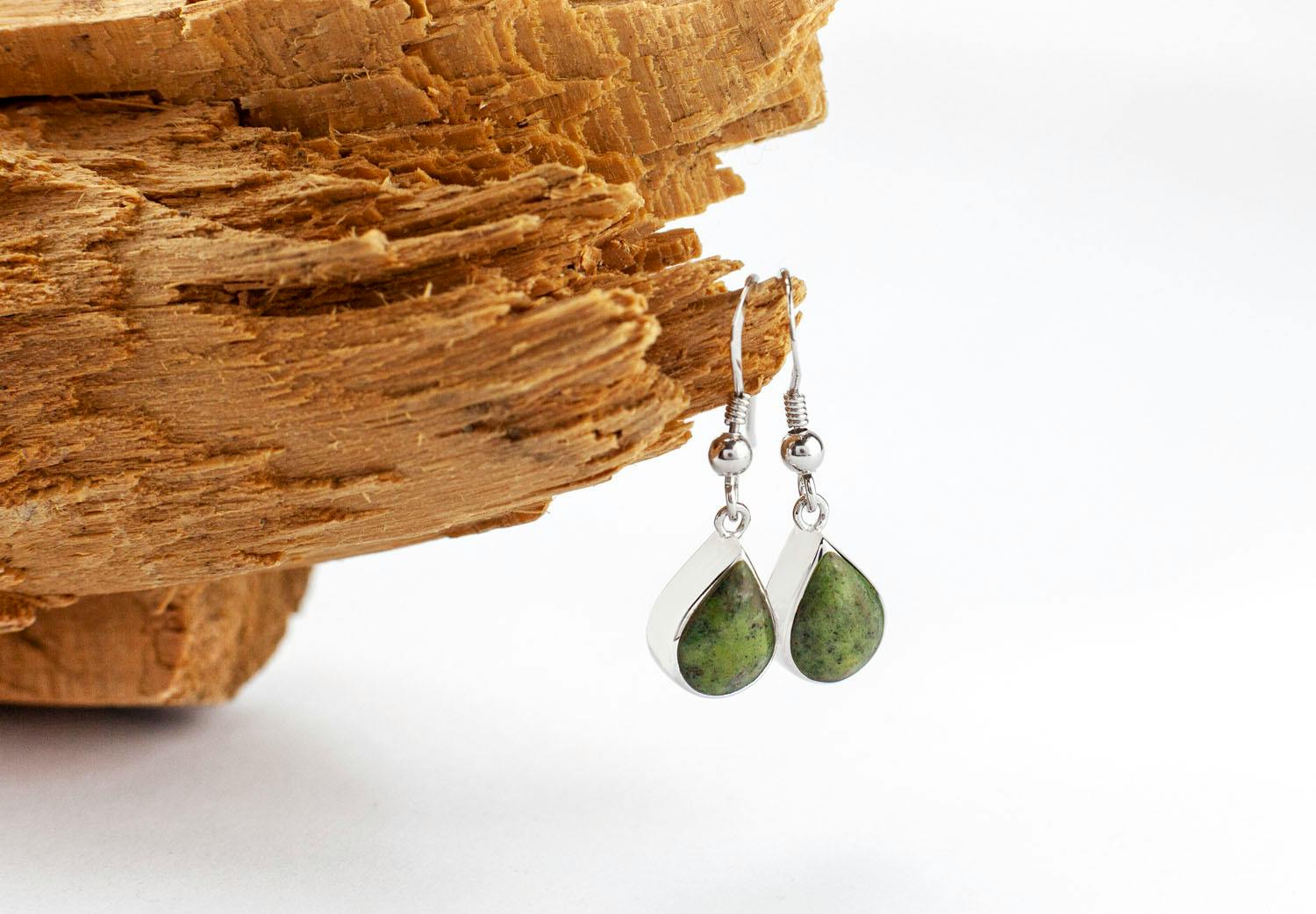 Sterling silver Connemara Marble earrings. The earrings have a great shape that is so pleasing to the eye. The marble is dome shaped to enhance the striking colors of the marble. You will notice varying degrees of shading and what appears to be hairline fractures and fissures present in the marble, this is not a flaw, it is indeed a characteristic feature of this unique stone.