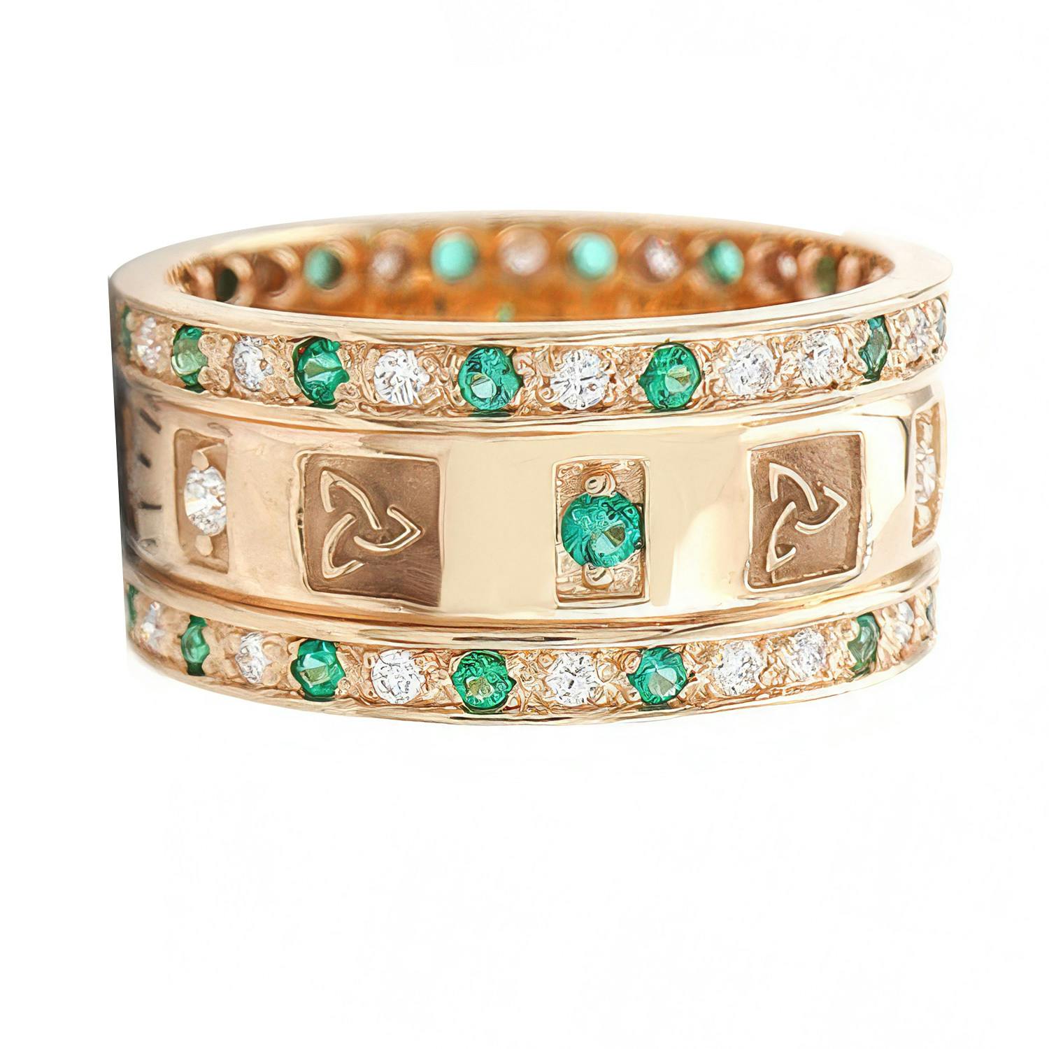 This magnificent 9.5mm wide unisex ring is for those that like to make an impact. The central band of the ring is decorated with matte finished panels adorned with alternating round cut diamonds, emeralds, and polished Trinity Knots that continue the entire way around the band to stunning effect.