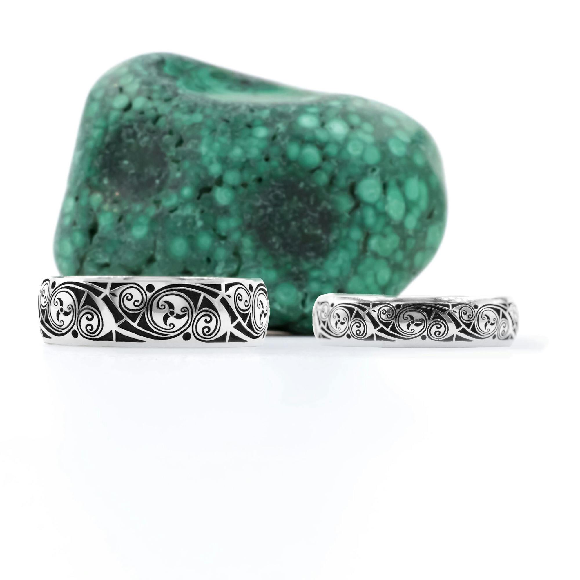 These premium quality rings are made to order in your choice of precious metal. The wider bands allow the exquisite detailing on these rings to shine. Celtic La Tené design flourishes flow around the entire band - picked out with a black cerin enamel finish.