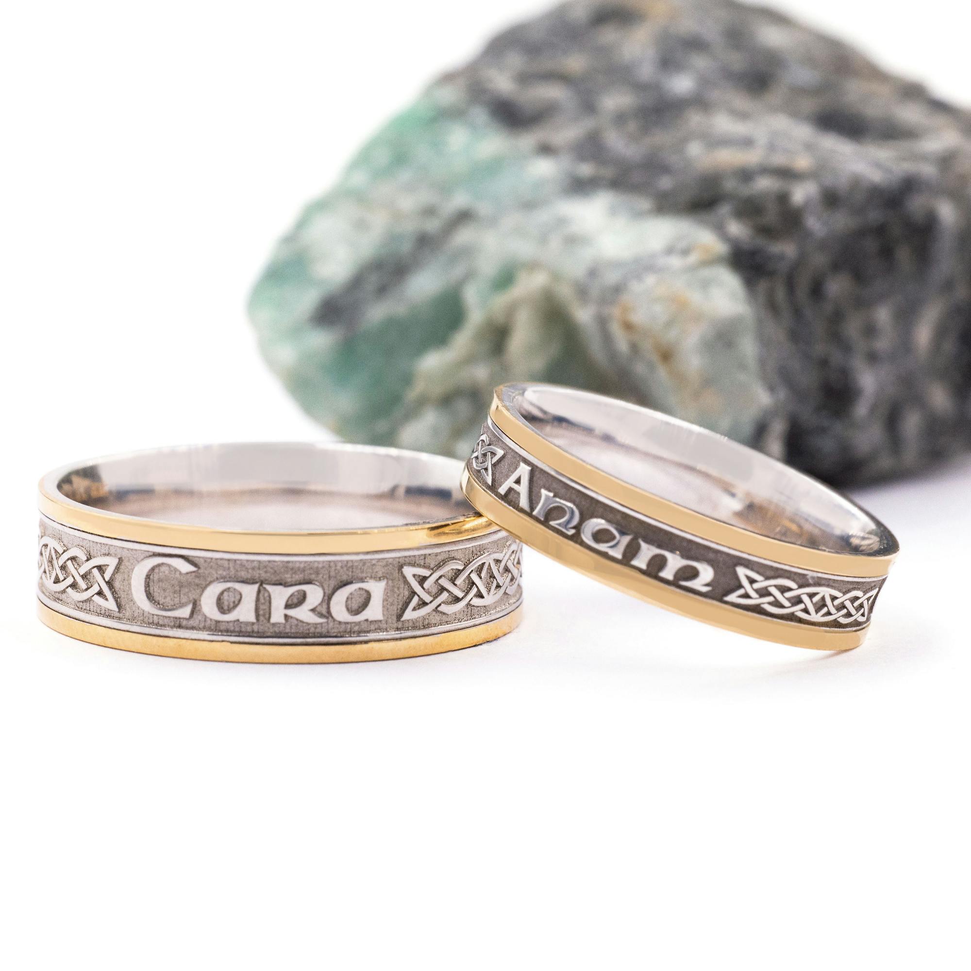 The bands are embossed with gaelic script which reads "Mo Anam Cara", a phrase we know today as "My Soul Mate". The ancient Celts believed that when two individuals formed a deep and lasting bond their souls would mingle. Each person had found their "Anam Cara", or soul friend. This lovely sentiment is enhanced by embossed Celtic love knots that punctuate the script. An ancient symbol of unbroken and eternal love. Beautiful details that stand out against a matte background finish, framed by polished contrasting trims.