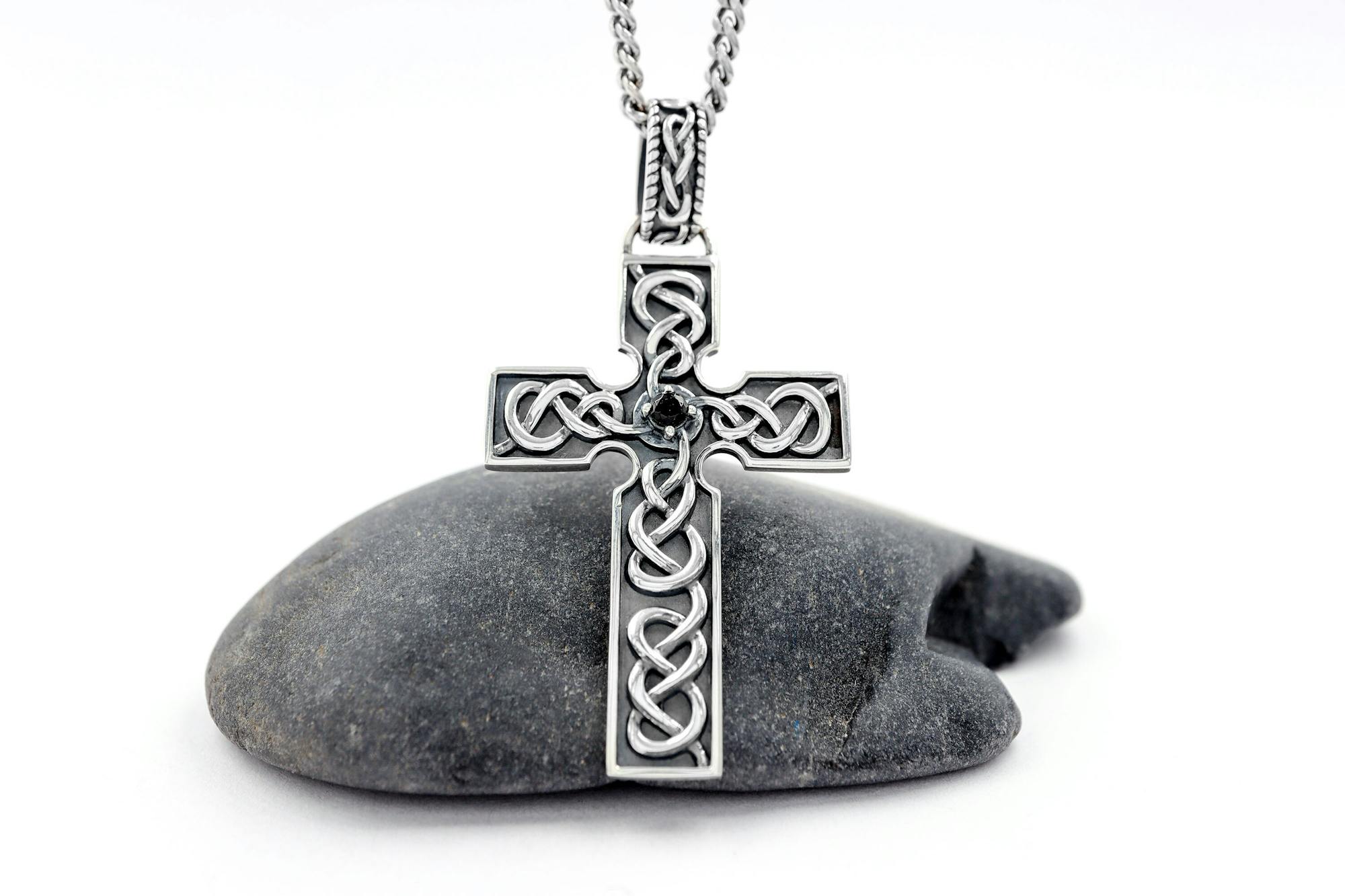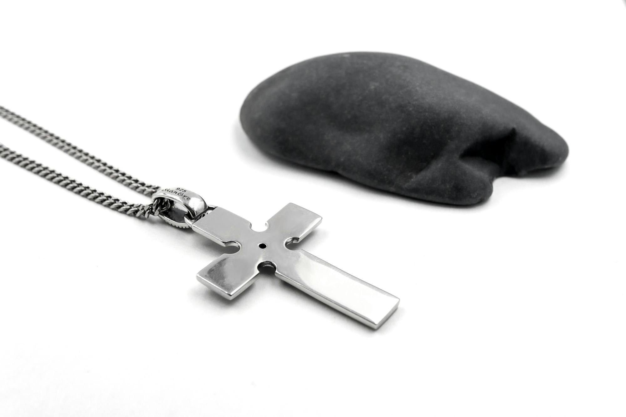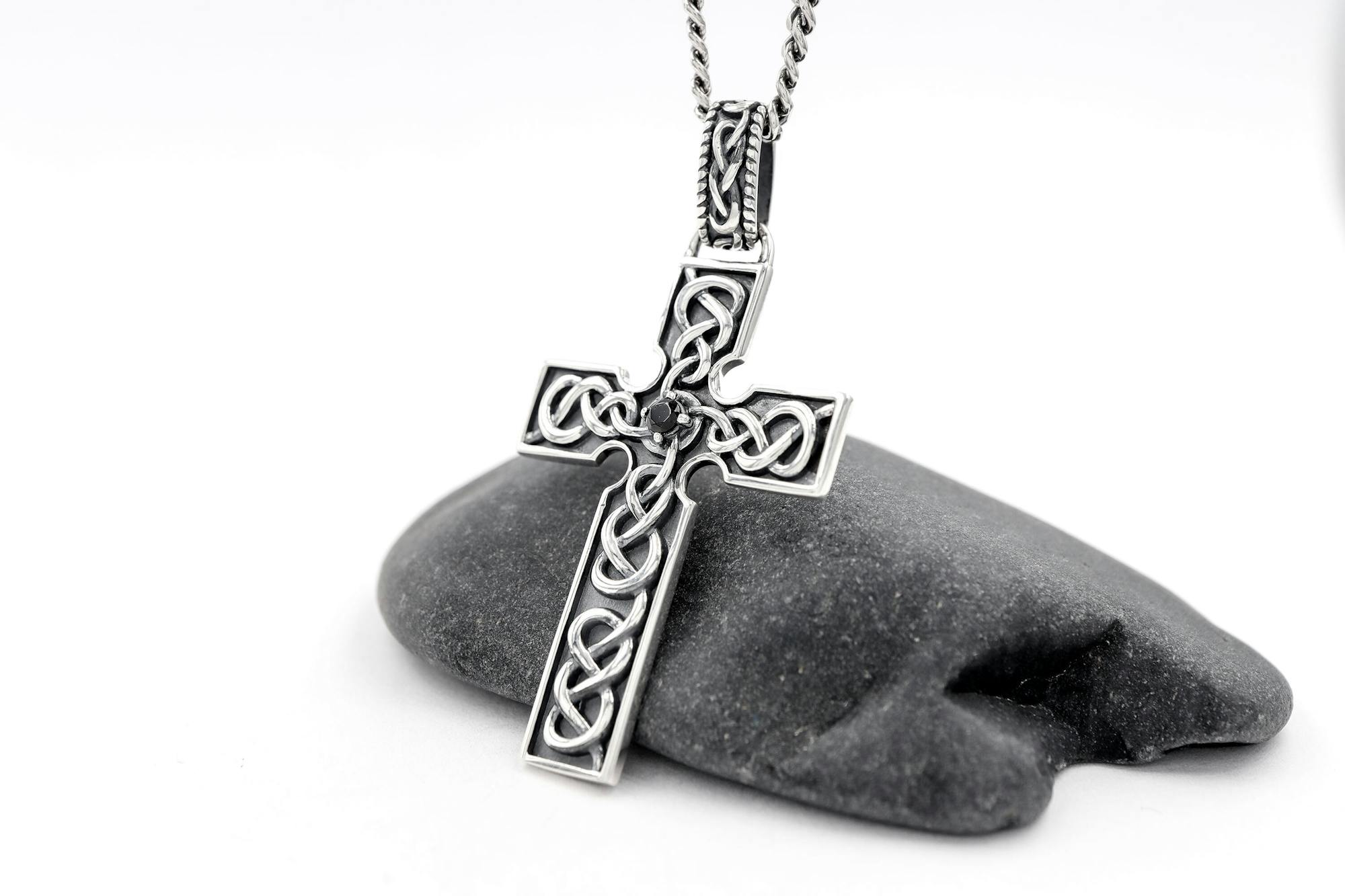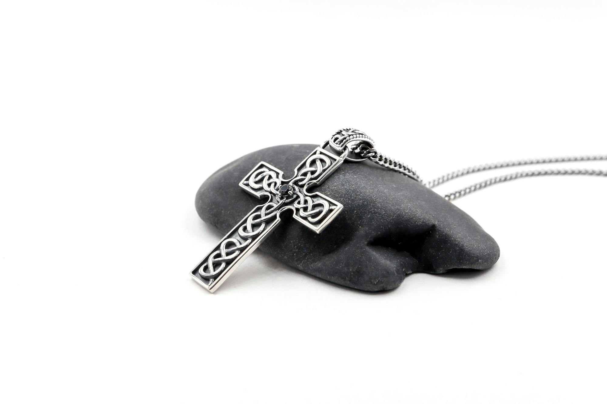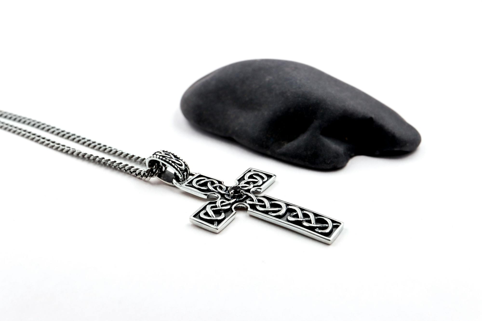Measuring 0.9" wide by 1.8" high including the decorative bale, the cross comes with a solid oxidised or antique style sterling silver 20" curb chain with an easy to operate lobster clasp. If you prefer something longer or chunkier, choose from our handpicked selection of sterling silver chains that pair perfectly with this cross.