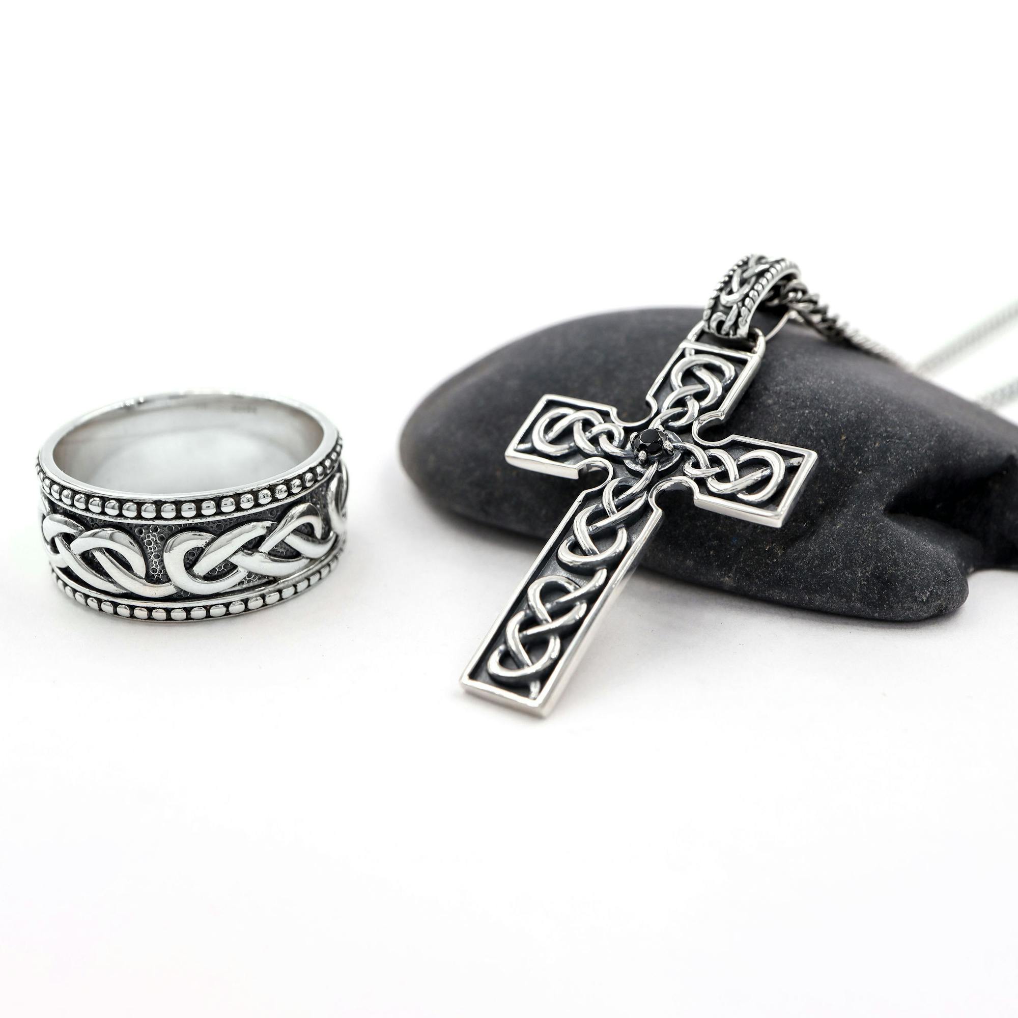With a sturdy cross set with a glinting black onyx stone at its centre and a handsome matching band, this strong and striking sterling silver celtic set will certainly get noticed.