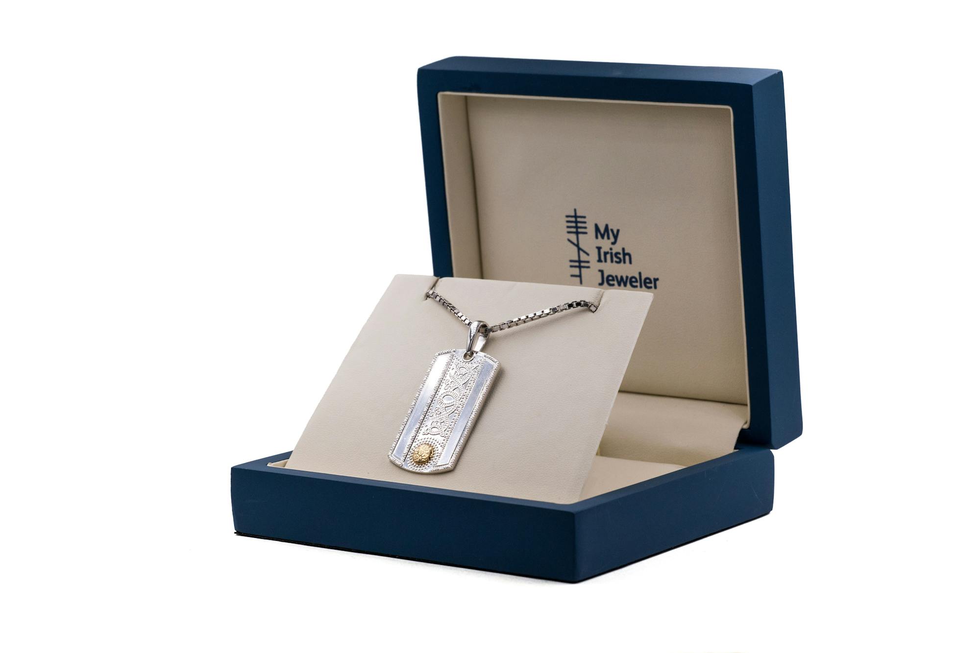 Expertly crafted here in Ireland, this solid and handsome dog tag includes a weighty 22 inch, heavy box chain. If you prefer something longer or chunkier, choose from our handpicked selection of chains that pair perfectly with this necklace.